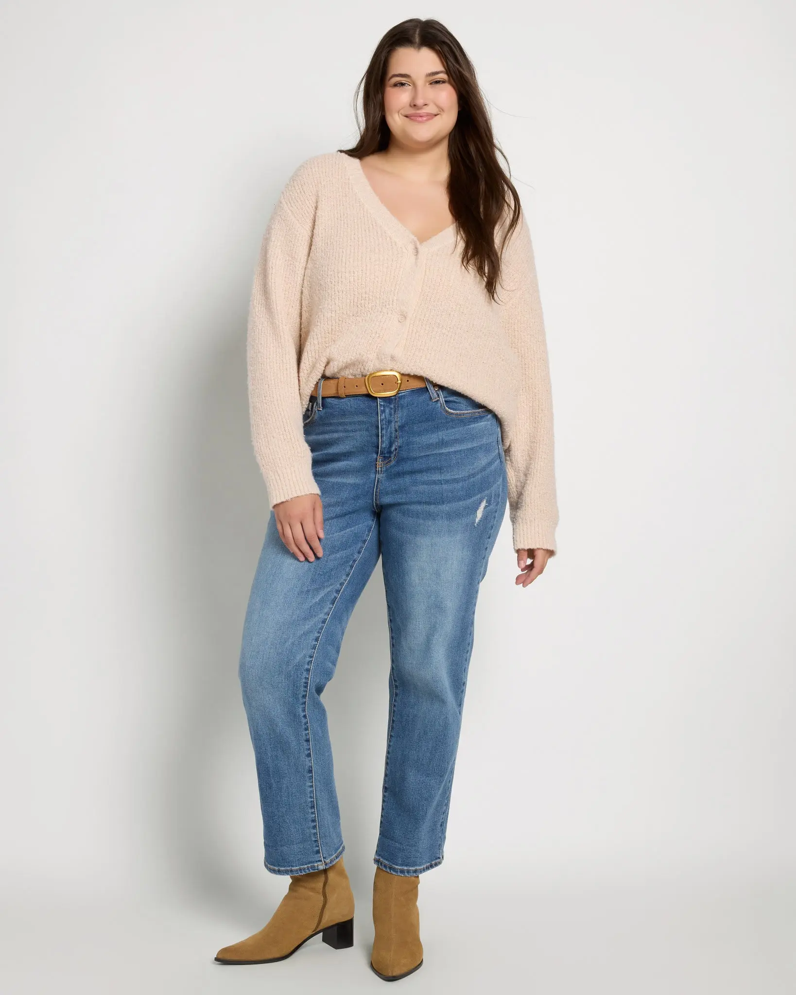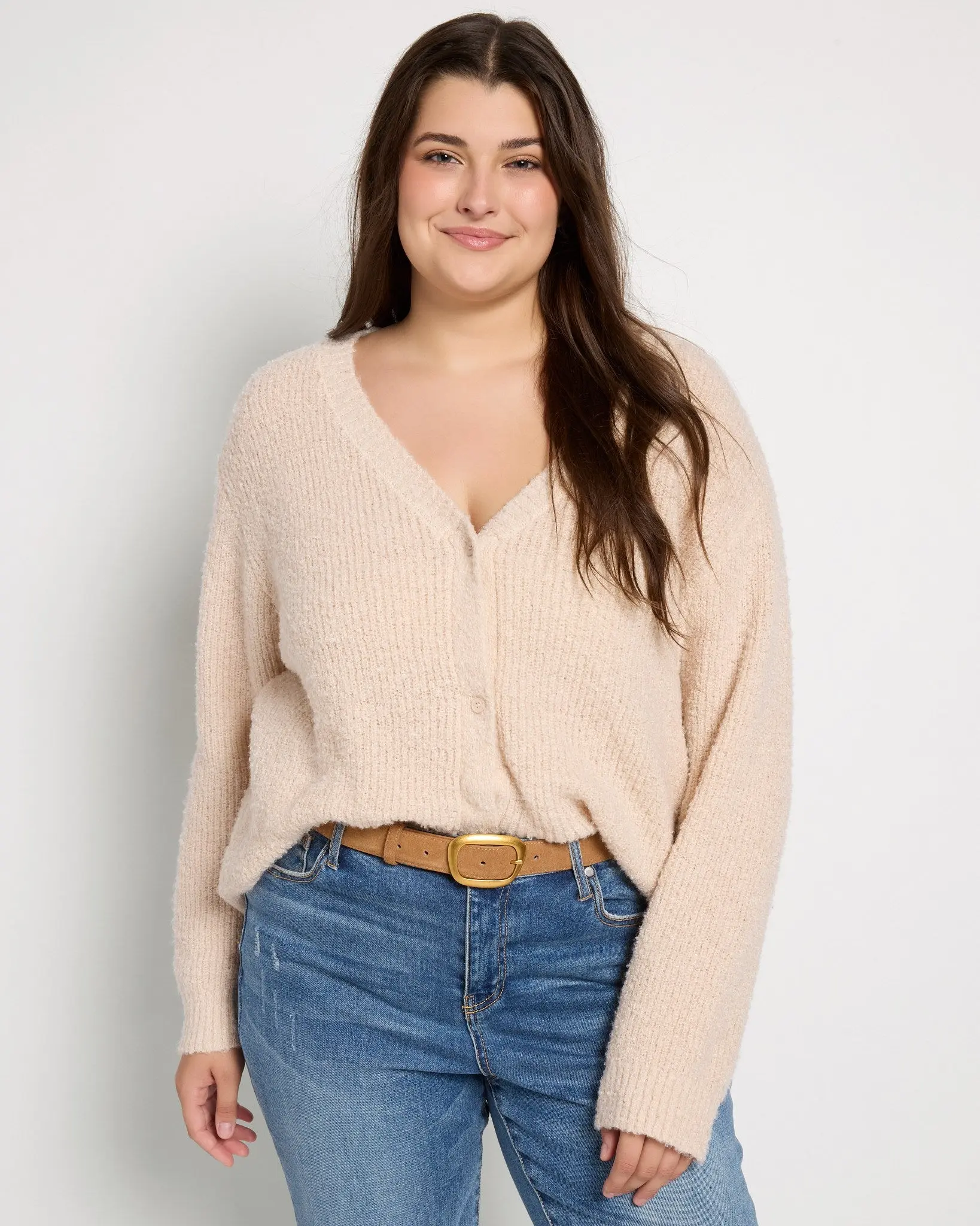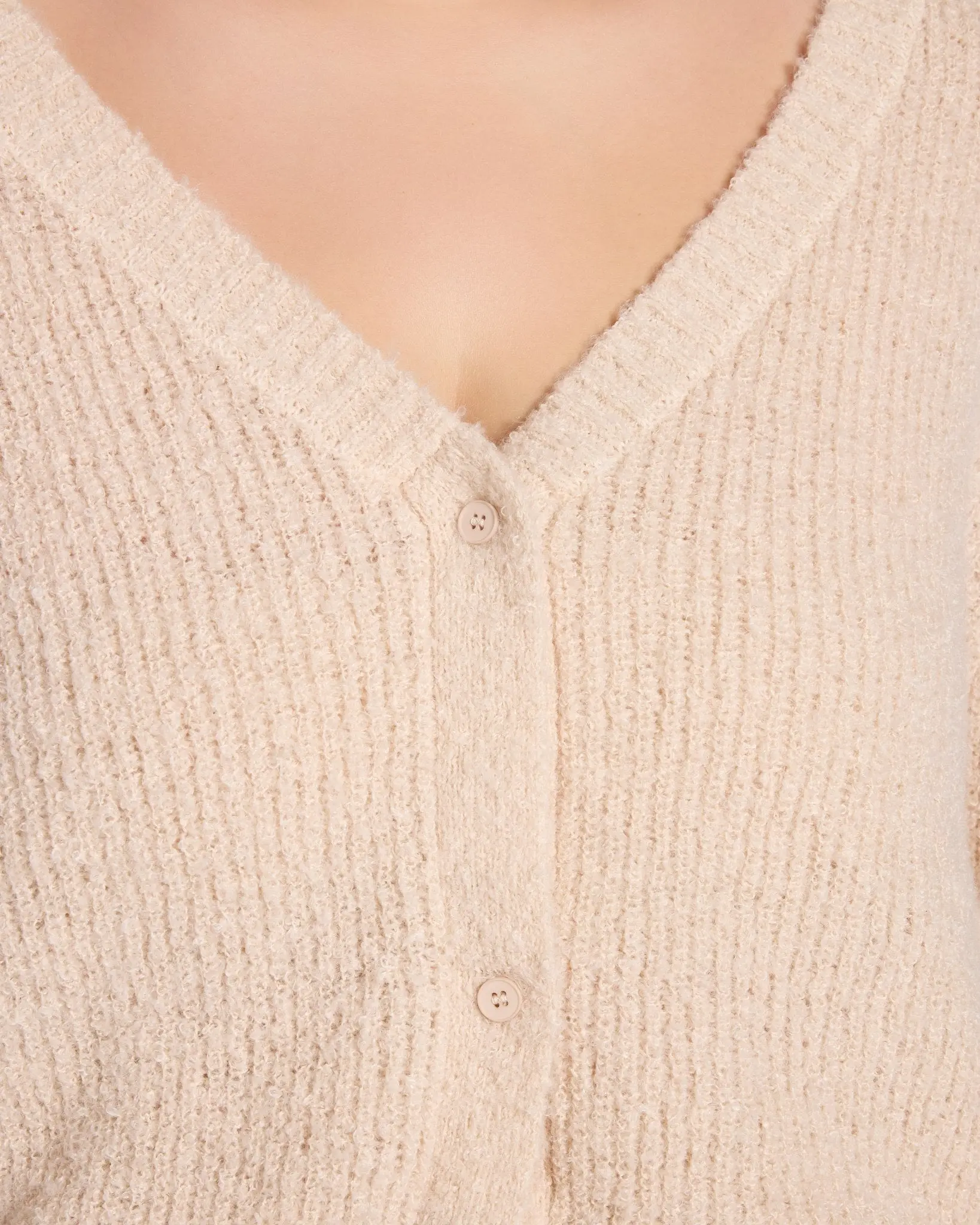 Soft texture. Easy shape. Total keeper. This button-front cardigan features a cozy ribbed knit with a bit of extra fuzz that makes it feel broken-in from day one. The boxy silhouette and deep V-neckline give it a laidback, layered-up look you’ll love on repeat.