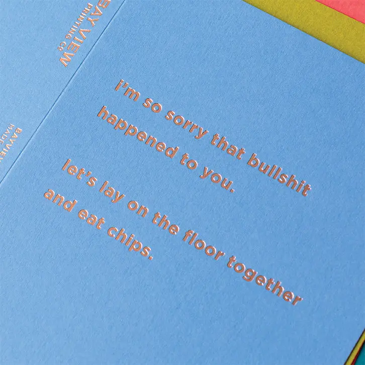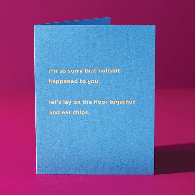 This sympathy card reads: "I'm so sorry that bullshit happened to you. Let's lay on the floor together and eat chips." Pair this card with some salty snacks and give to a friend or loved one who is going through it right now.