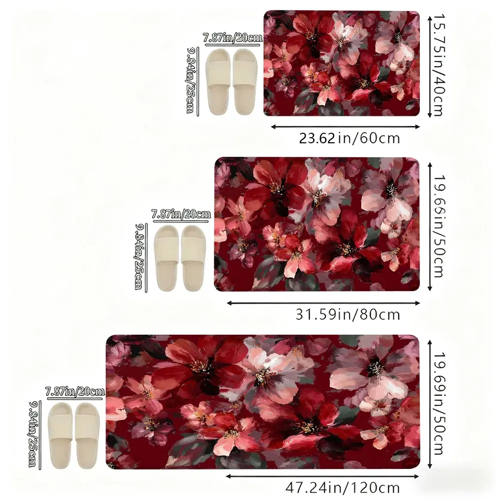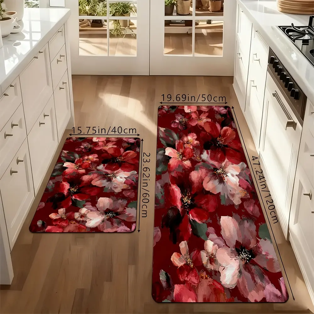 Vintage Watercolor Red Floral Kitchen Rug Set, Boho Abstract Flower Non-Slip Washable Floor Mats, Aesthetic Botanical Runner Rugs for Kitchen, Living Room & Home Decor