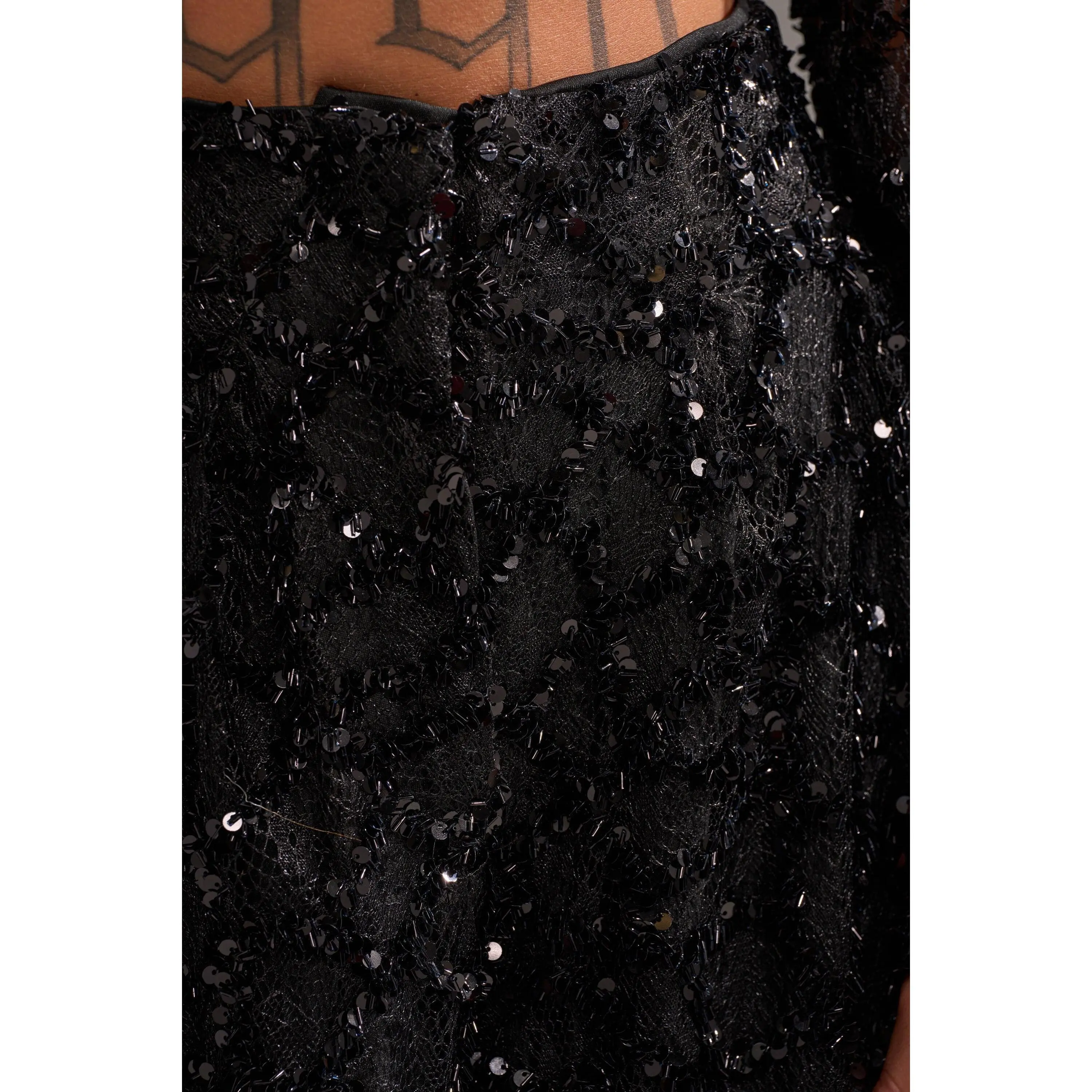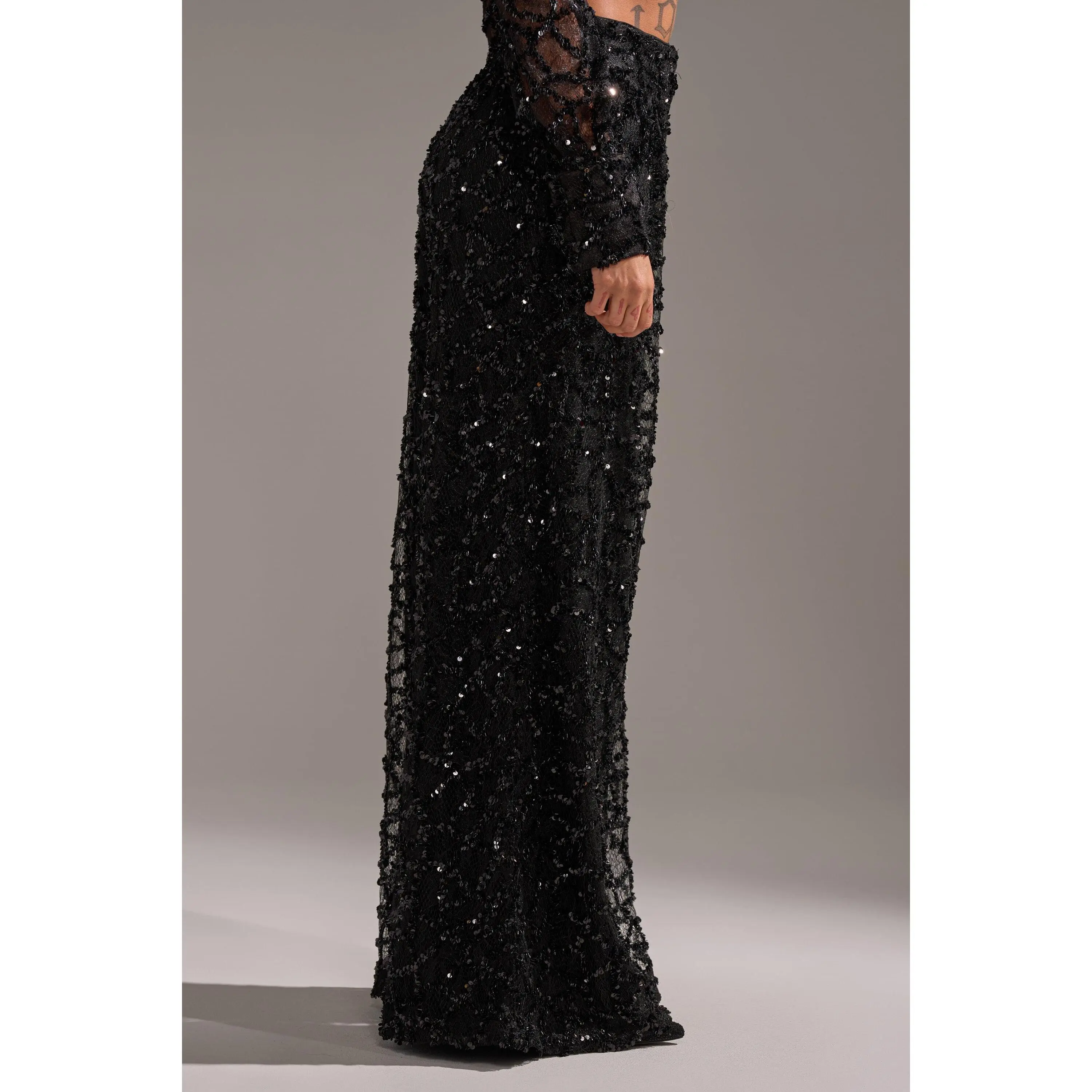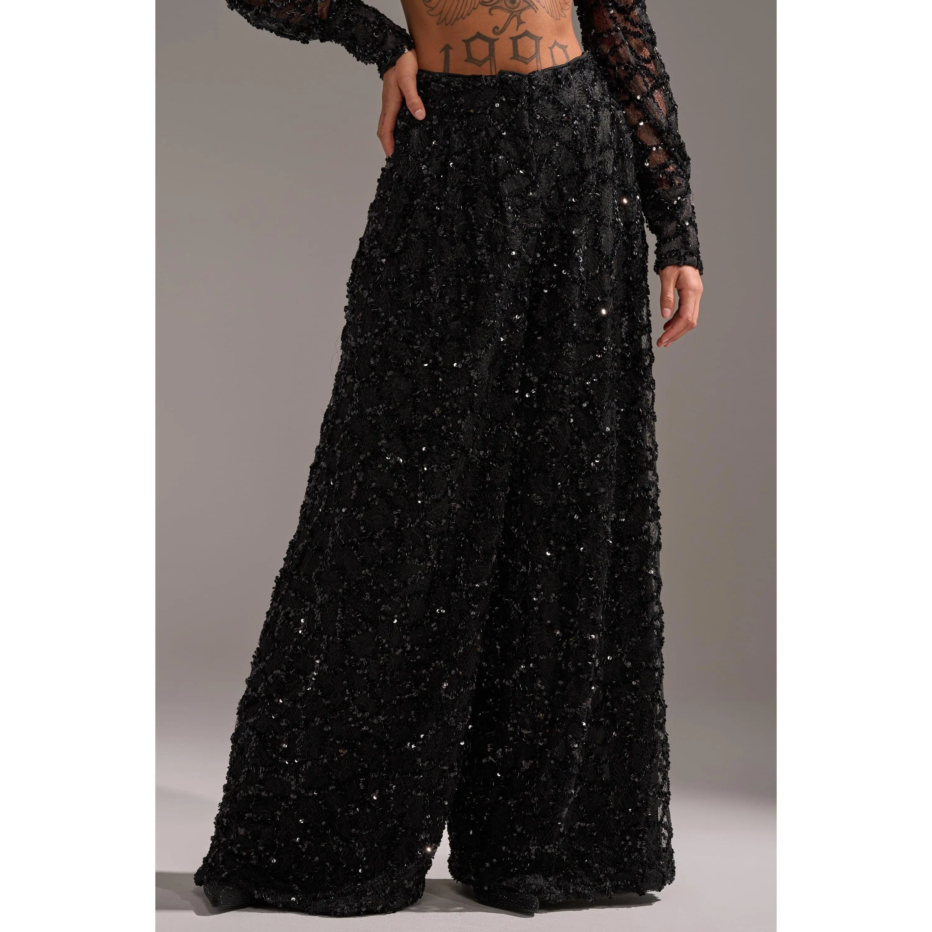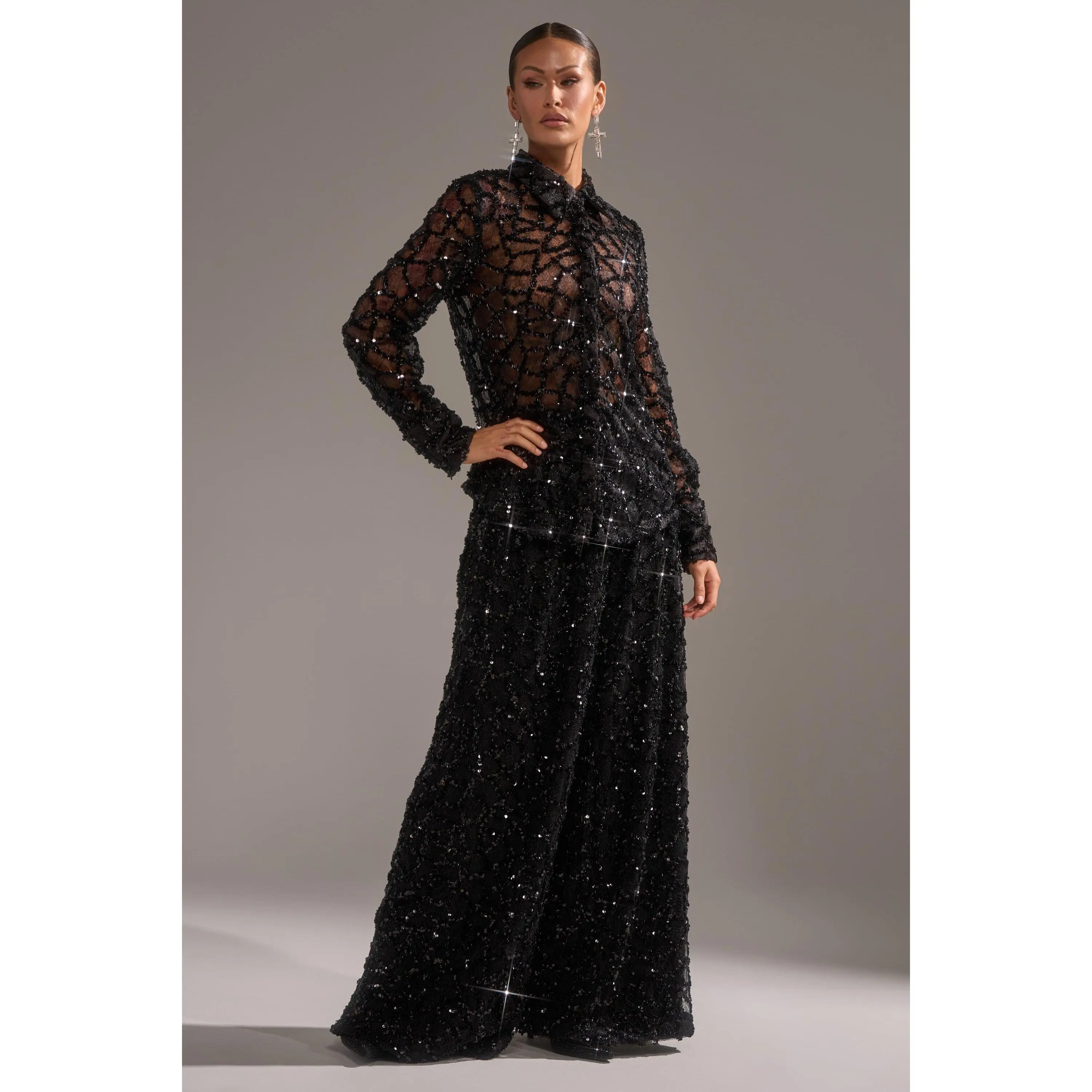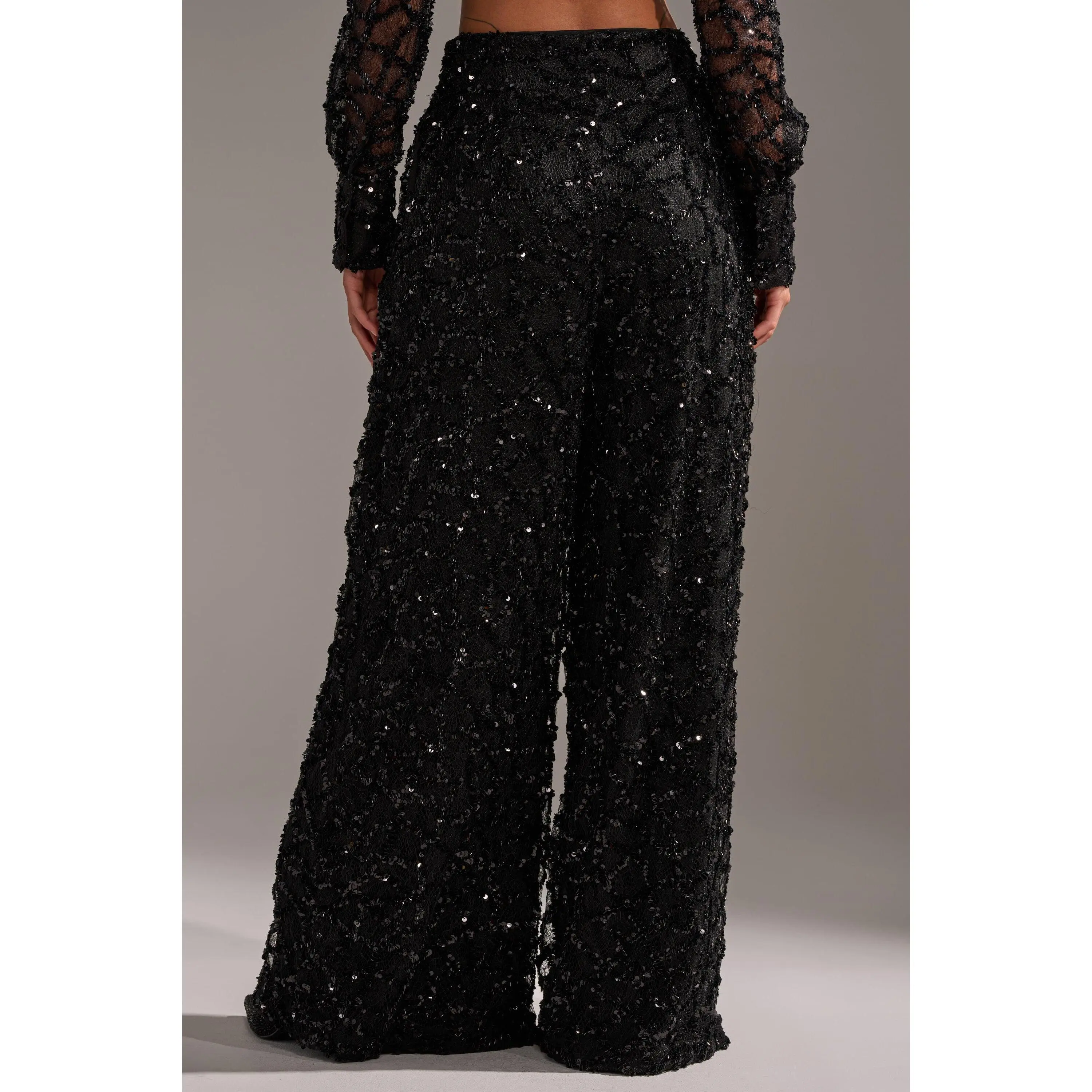 The AKIRA Label Roxy Sequin Palazzo Pant delivers bold elegance with every step. Crafted from a sheer, sequin-embellished fabric, these high-waisted trousers shimmer with movement while maintaining a fluid, wide-leg silhouette. Complete with side-seam pockets and a zippered hook-and-bar front closure, they blend practicality with statement style. Pair them with the matching Roxy Sequin Button Down for a coordinated look that’s effortlessly glamorous.- Shell: 100% Polyester, Lining: 95% Polyester, 5% Spandex- Slight Stretch- Imported(all measurements approximate from size small)- 13.5” Rise- 30” Inseam- Model is 5’7” and wearing a size smallProduct ID: 1066016(all measurements approximate from size 1X)- 16.5” Rise- 31” InseamProduct ID: 1066020