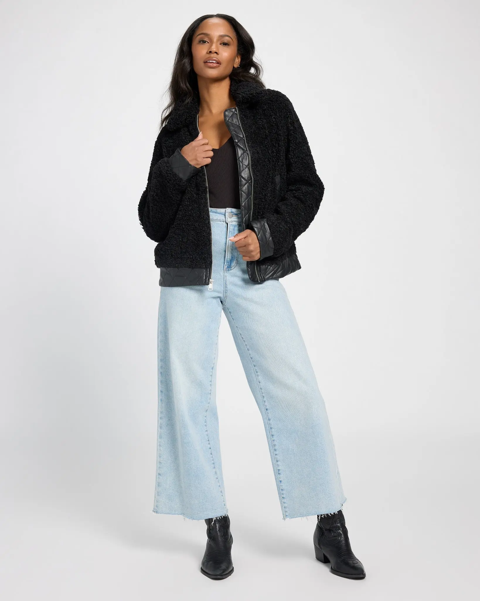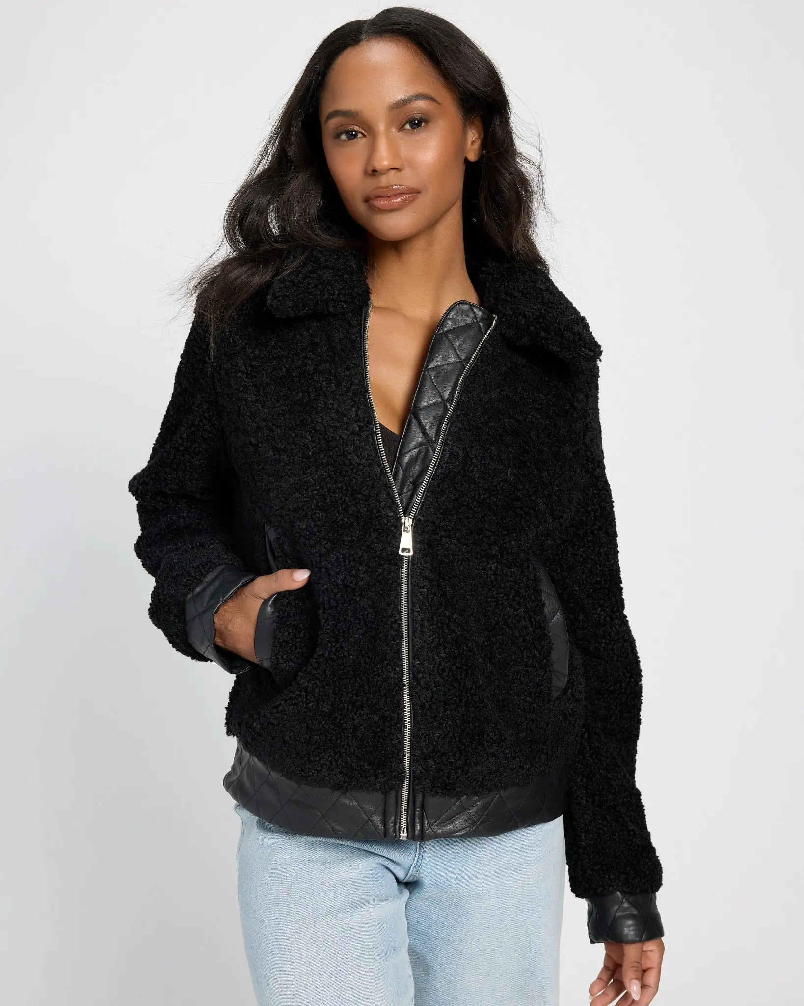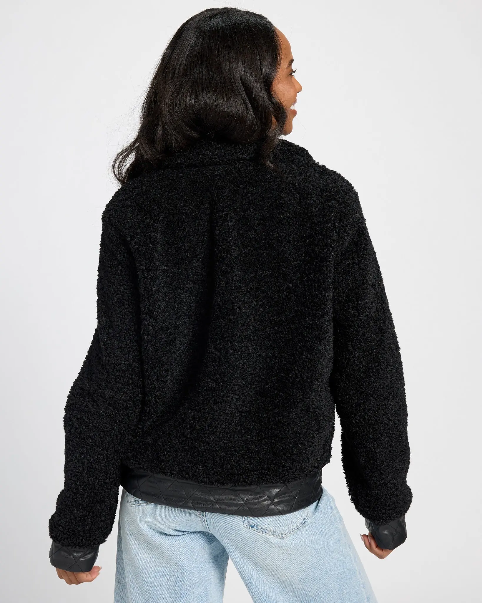 Tap into the retro trend of the moment with this shacket! So soft and cozy in sherpa trimmed with faux leather. Zip up and slip your hands into the side pockets to keep warm.