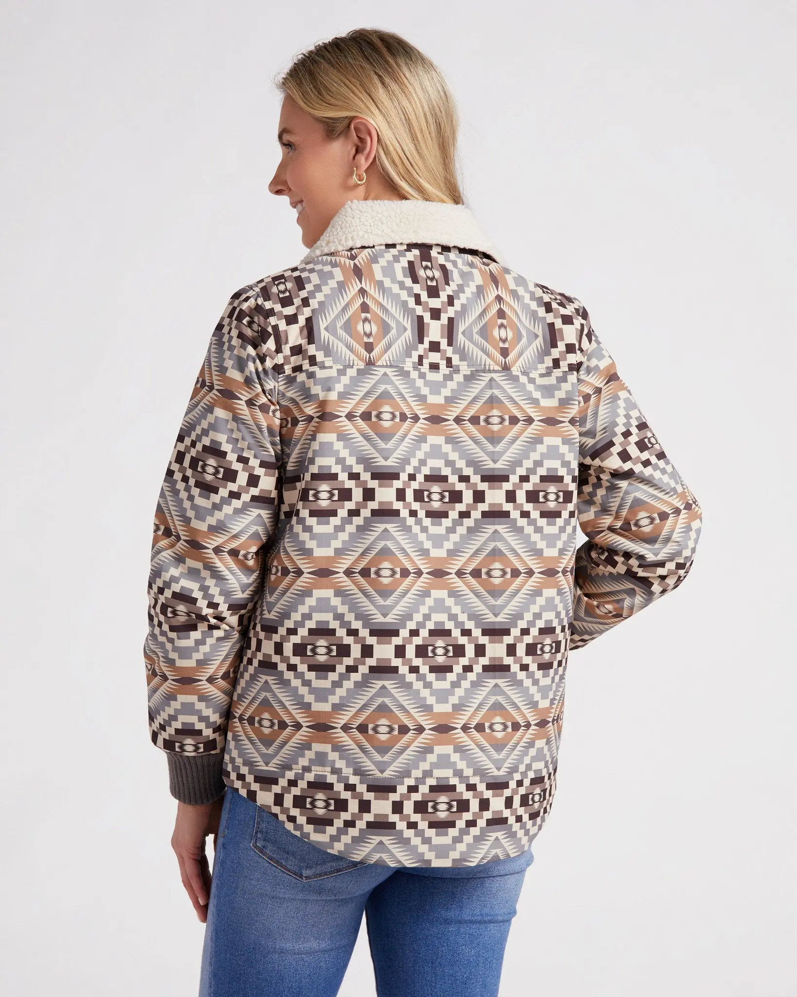 A water-resistant jacket with some Southwestern flair! Regular fit with a zip-up front, cozy sherpa collar, ribbed cuffs and two pockets. Made of a plant-based fiber with a fun Aztec pattern.