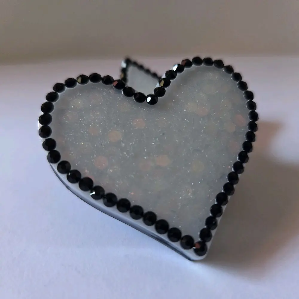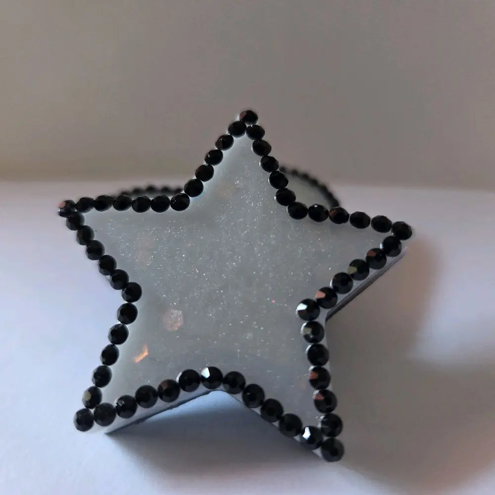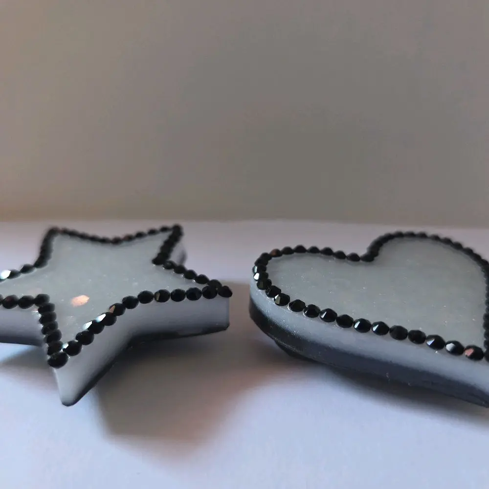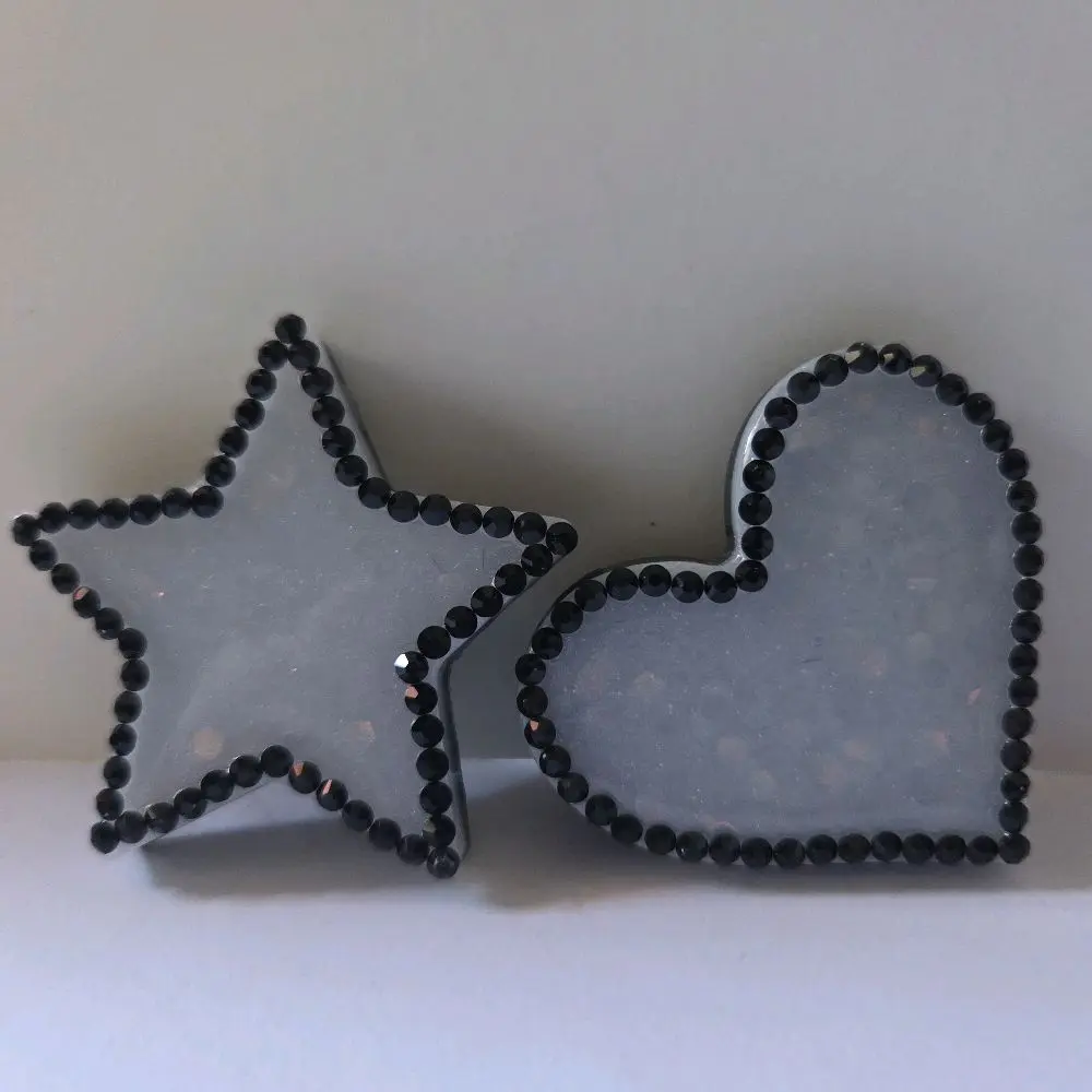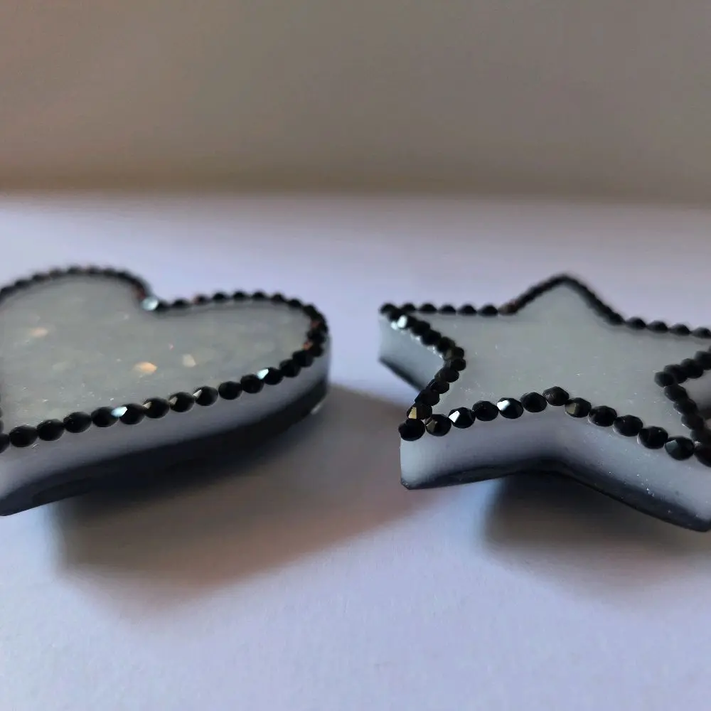 This set includes two chunky magnets, each adorned with white glitter and black rhinestones. Perfect for adding a touch of sparkle to your belongings. The heart and star designs are eye-catching and versatile. Ideal for attaching to fridges, lockers, or any magnetic surface.