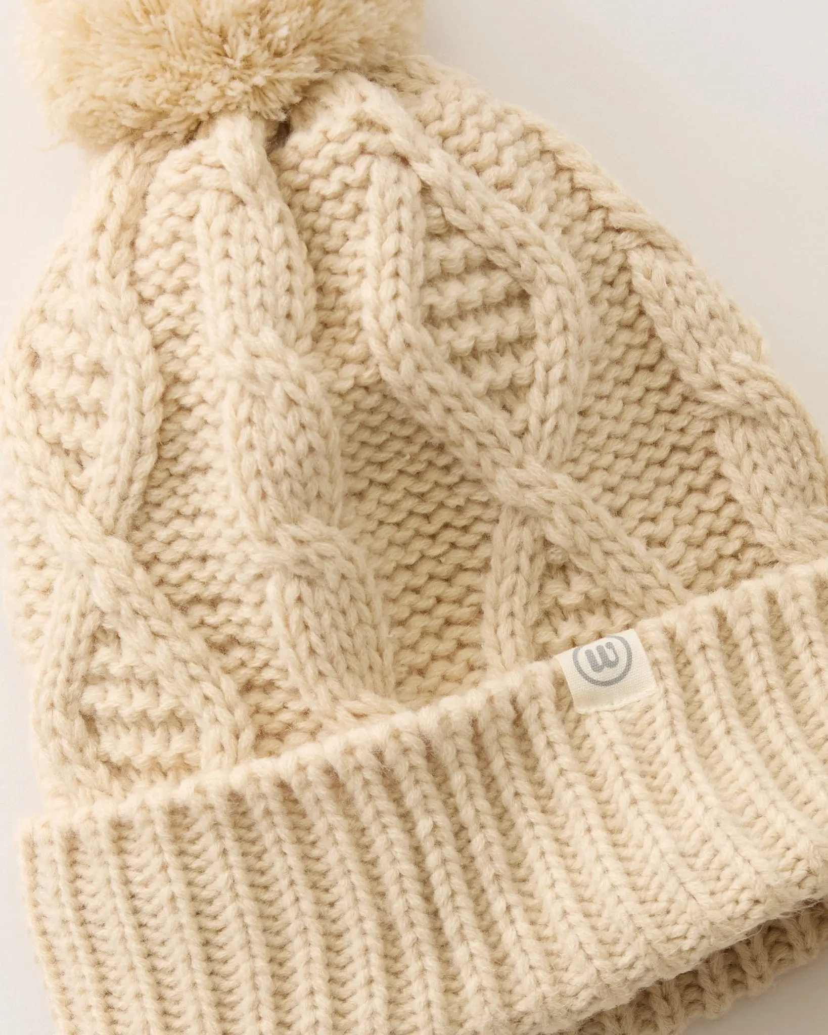 The key finishing touches to your winter look! These mittens and pom beanie are designed in chunky cable-knit pattern with ribbed trims for a cozy, snug fit. Pop them on to stay warm on an especially chilly day!