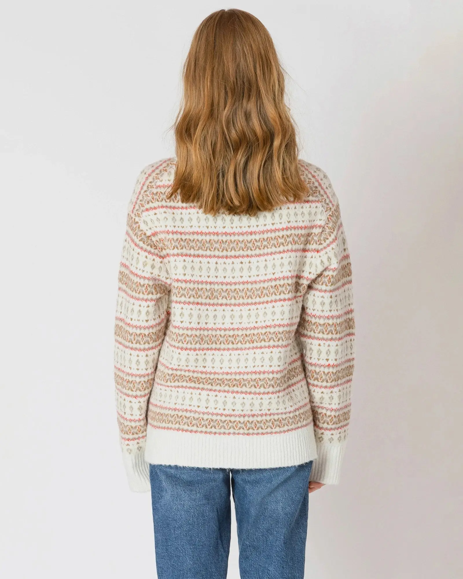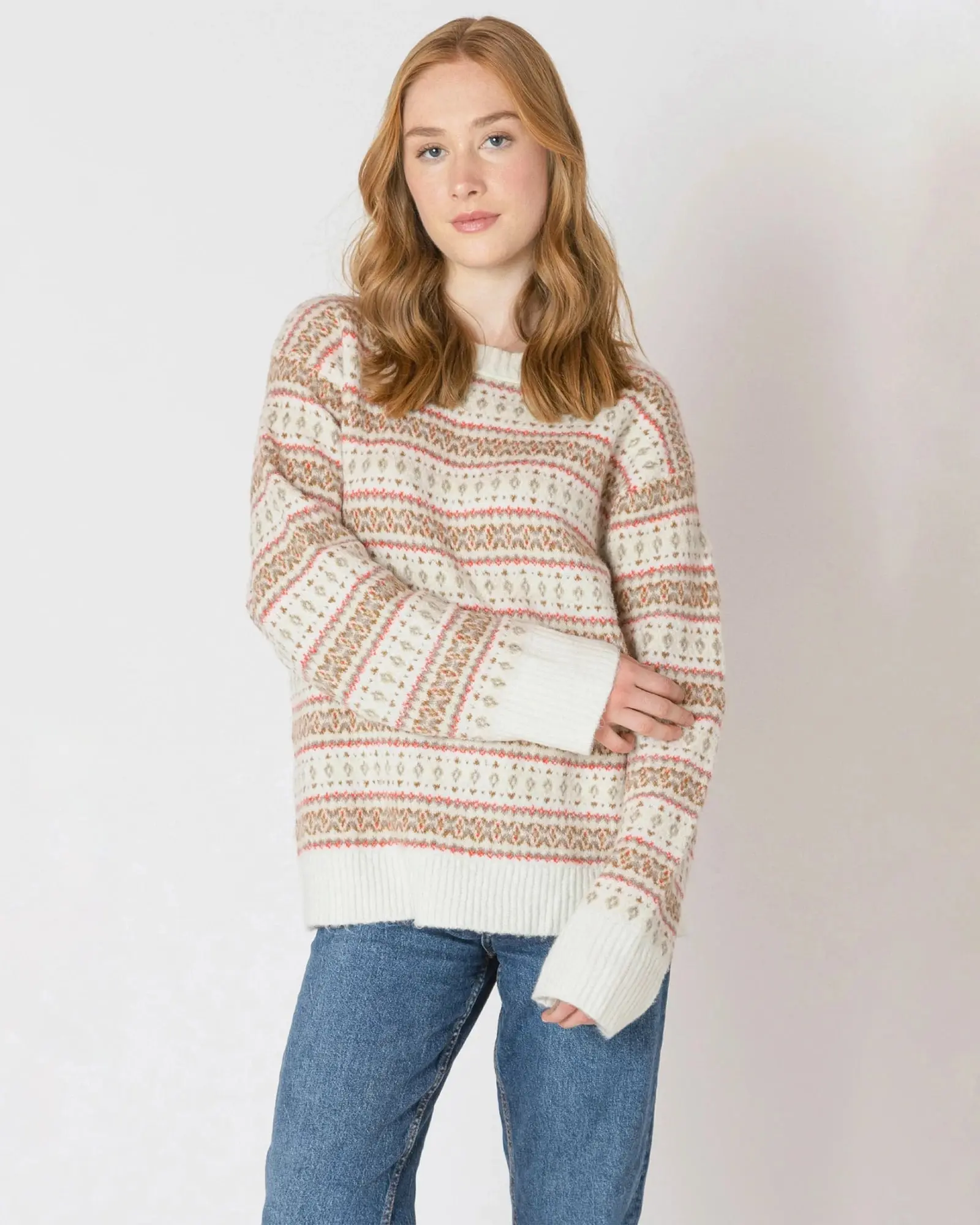 This snuggly sweater will bring you cozy cheer! A comfy, oversized fit that'll get you through the holidays. Patterned all over in festive rows of Fair Isle motif.