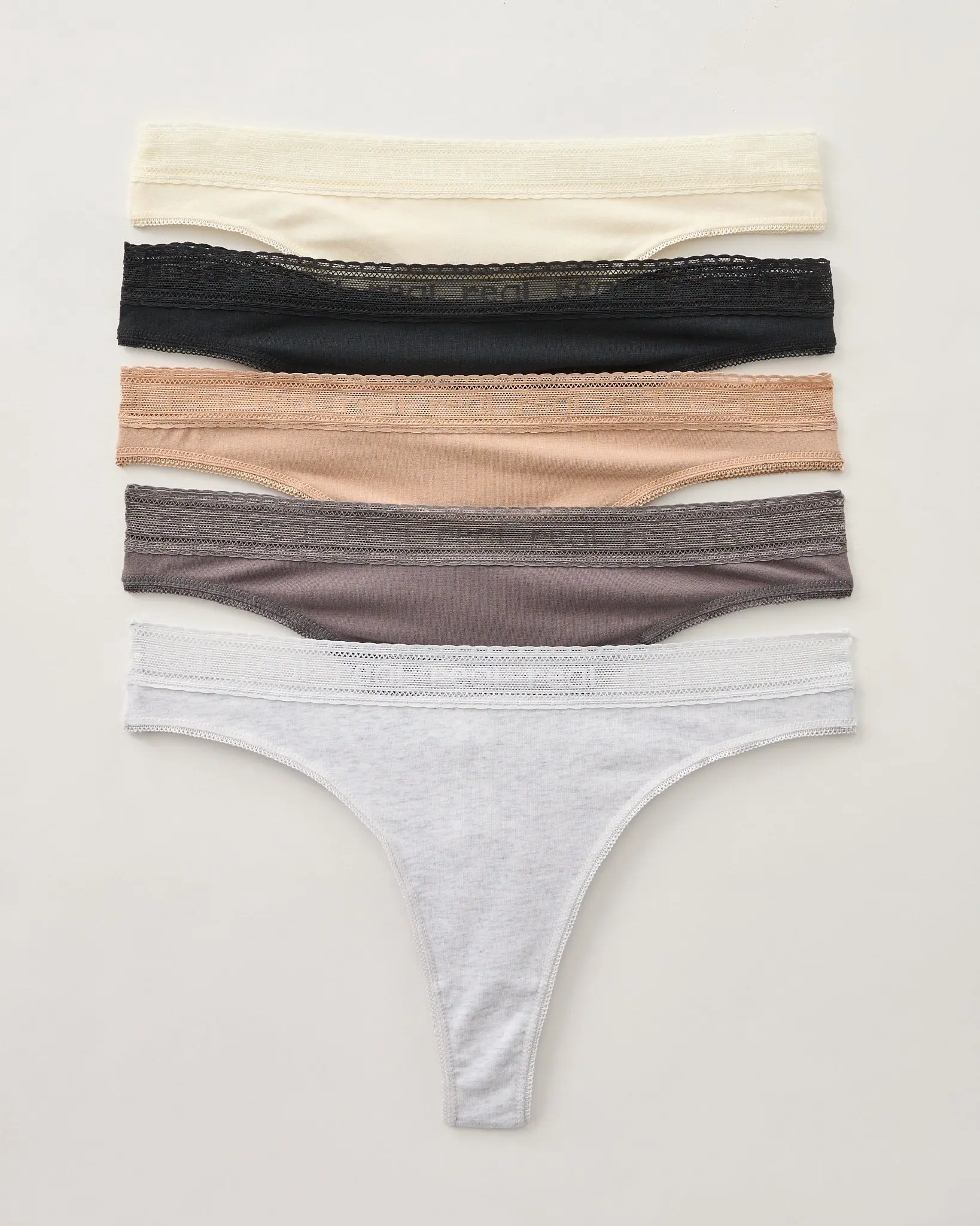 These everyday thongs are so comfy, you can barely feel them! Classic thong cut with a low-rise waistband traced by logo-embroidered lace. Made of a soft and breathable 100% cotton with a bit of stretch for a flawless fit. Pack of five.