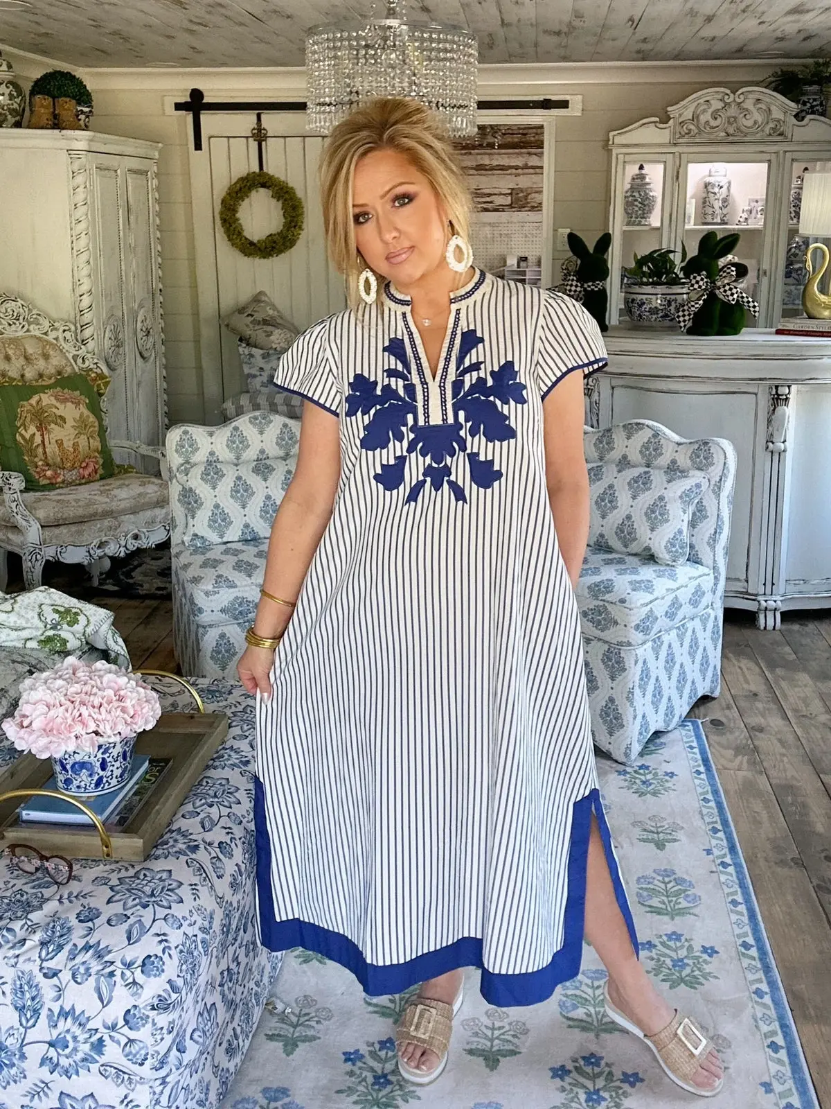 Blue Stripe Midi Dress with Lace Trim