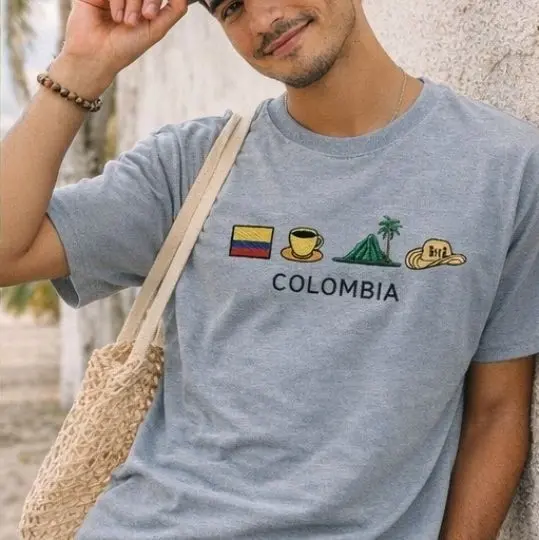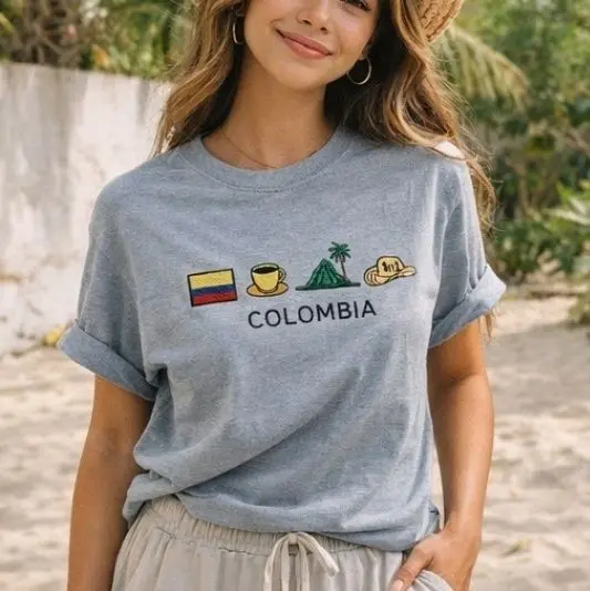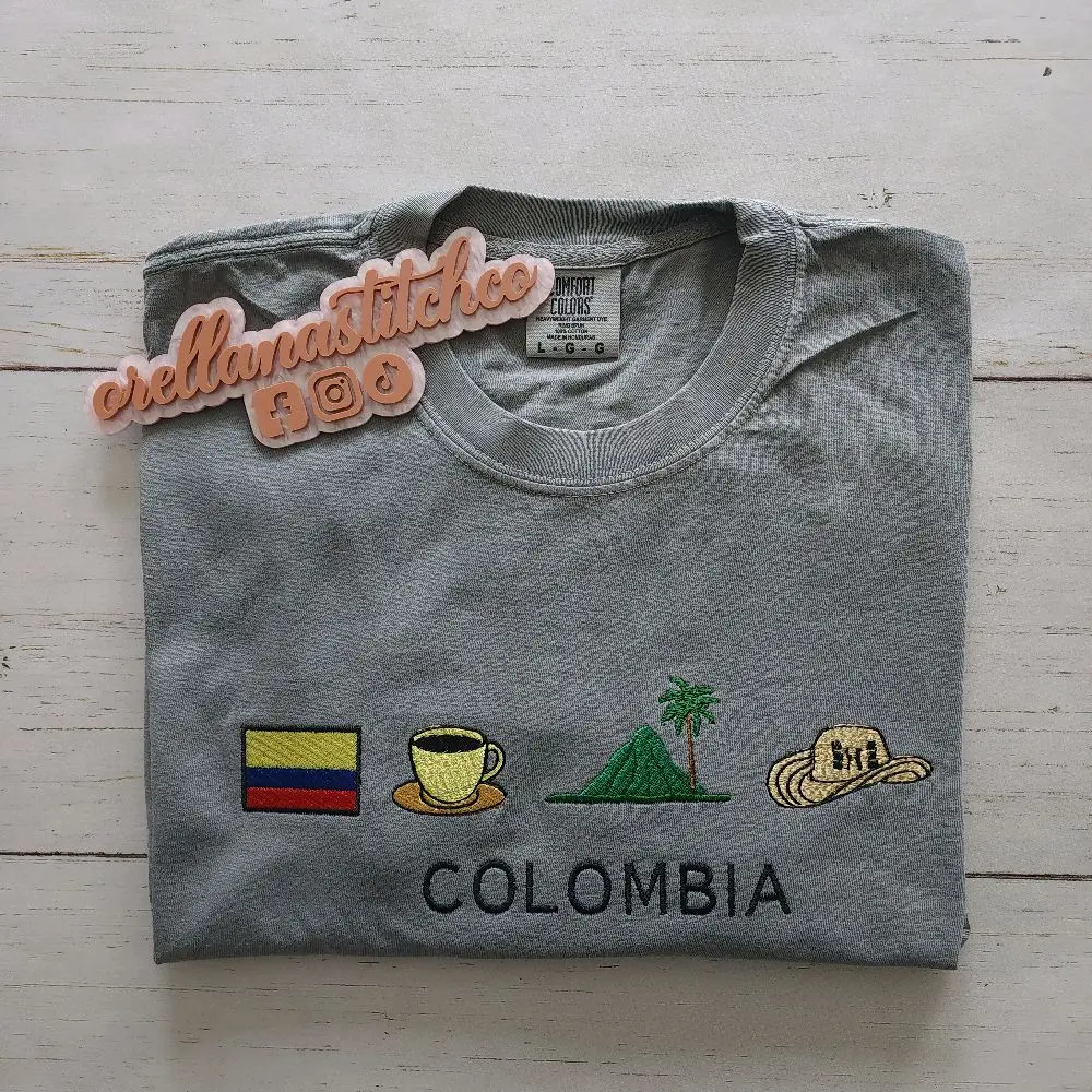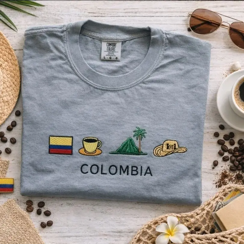 This embroidered tee features iconic Colombian elements — coffee, mountains, and culture — stitched on a premium Comfort Colors shirt.