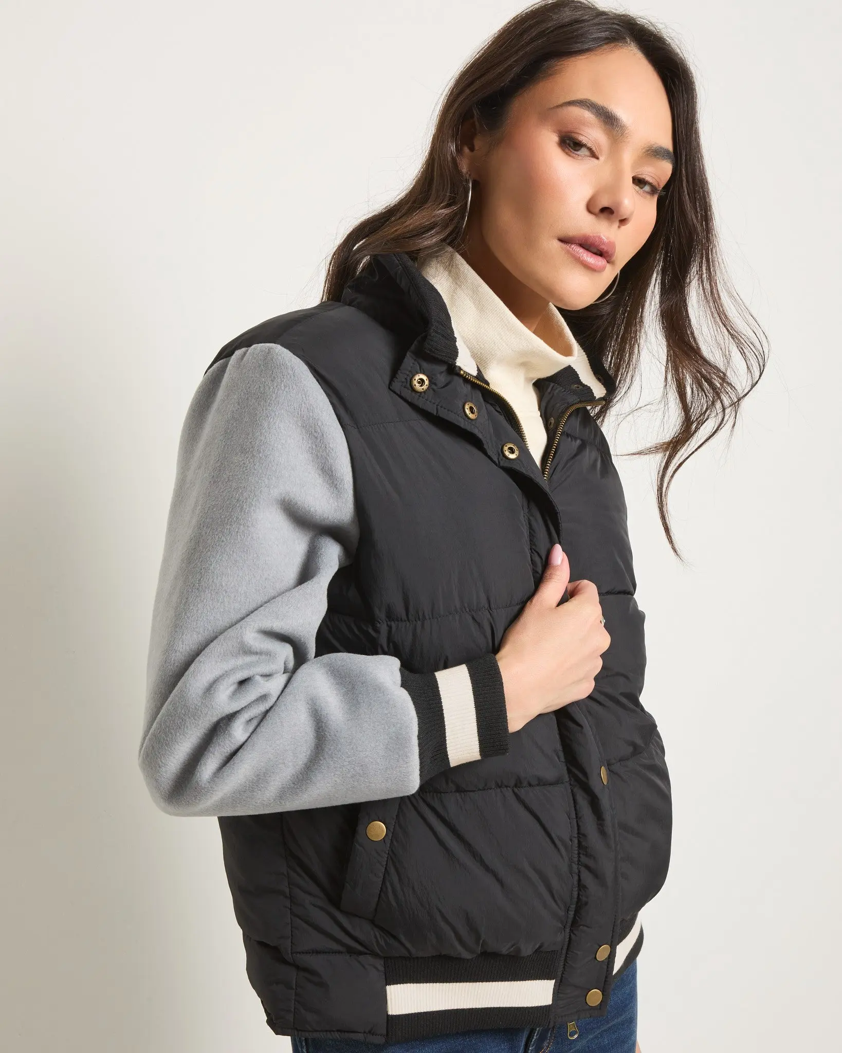 Letterman meets laidback. This snap-up jacket combines a quilted puffer body with soft knit sleeves and retro stripes at the cuffs and hem. Sporty, but not trying too hard. Just throw it on and look instantly more interesting.