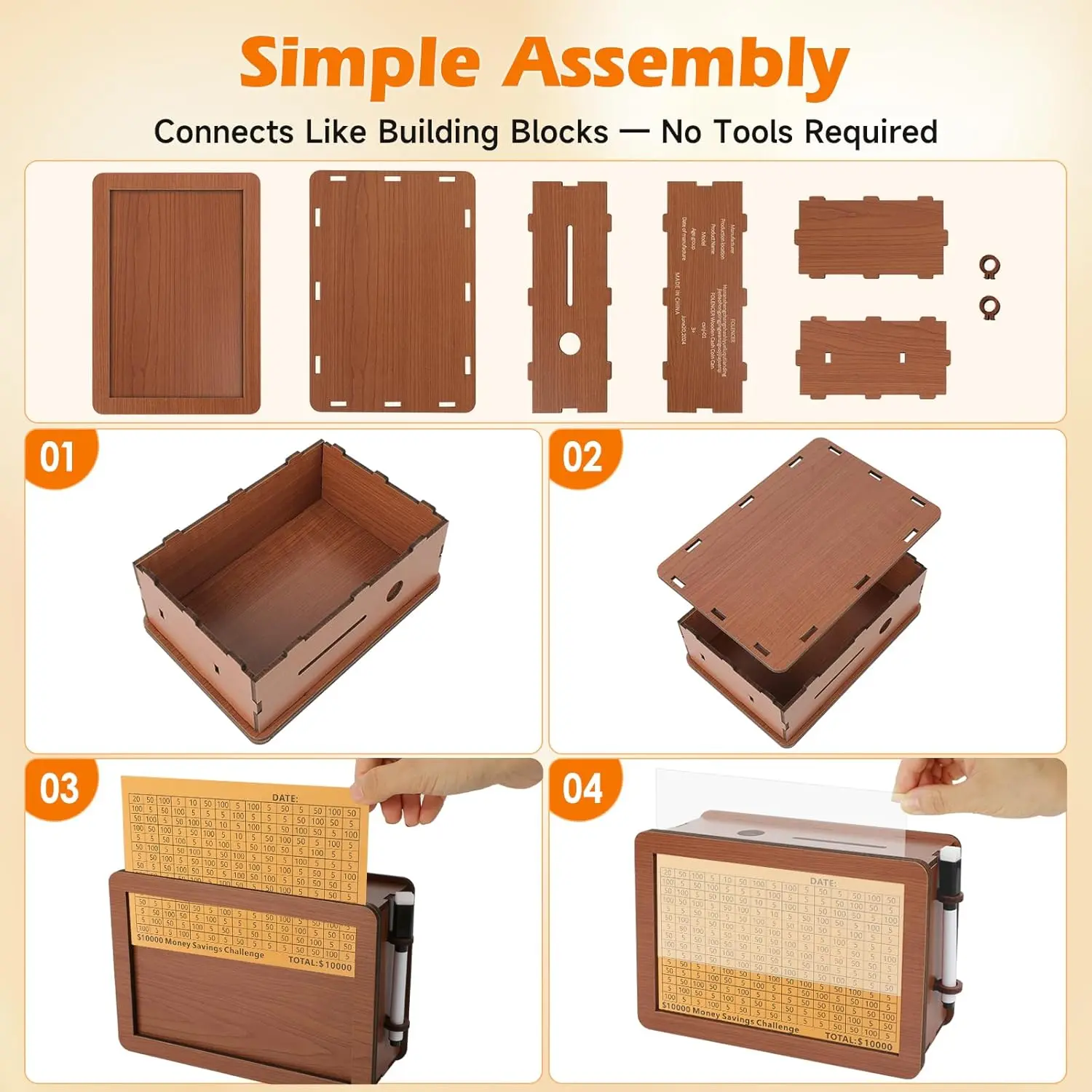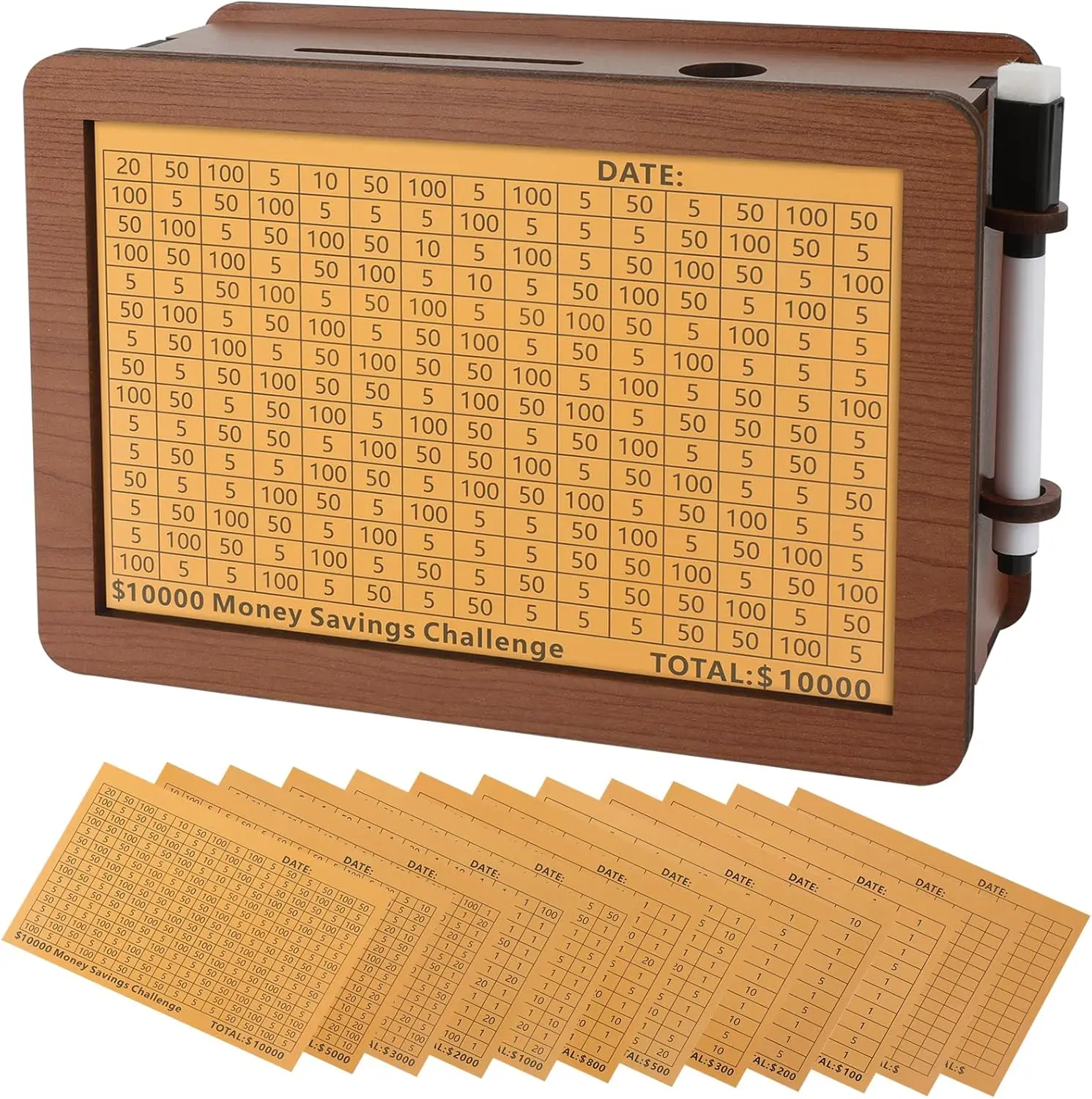 Wooden Money Saving Box for Kids & Adults - Reusable $10,000 Savings Challenge Box with Progress Tracker & Cash Vault, Educational Piggy Bank Gift for Boys Girls 3-12(12 Amounts)