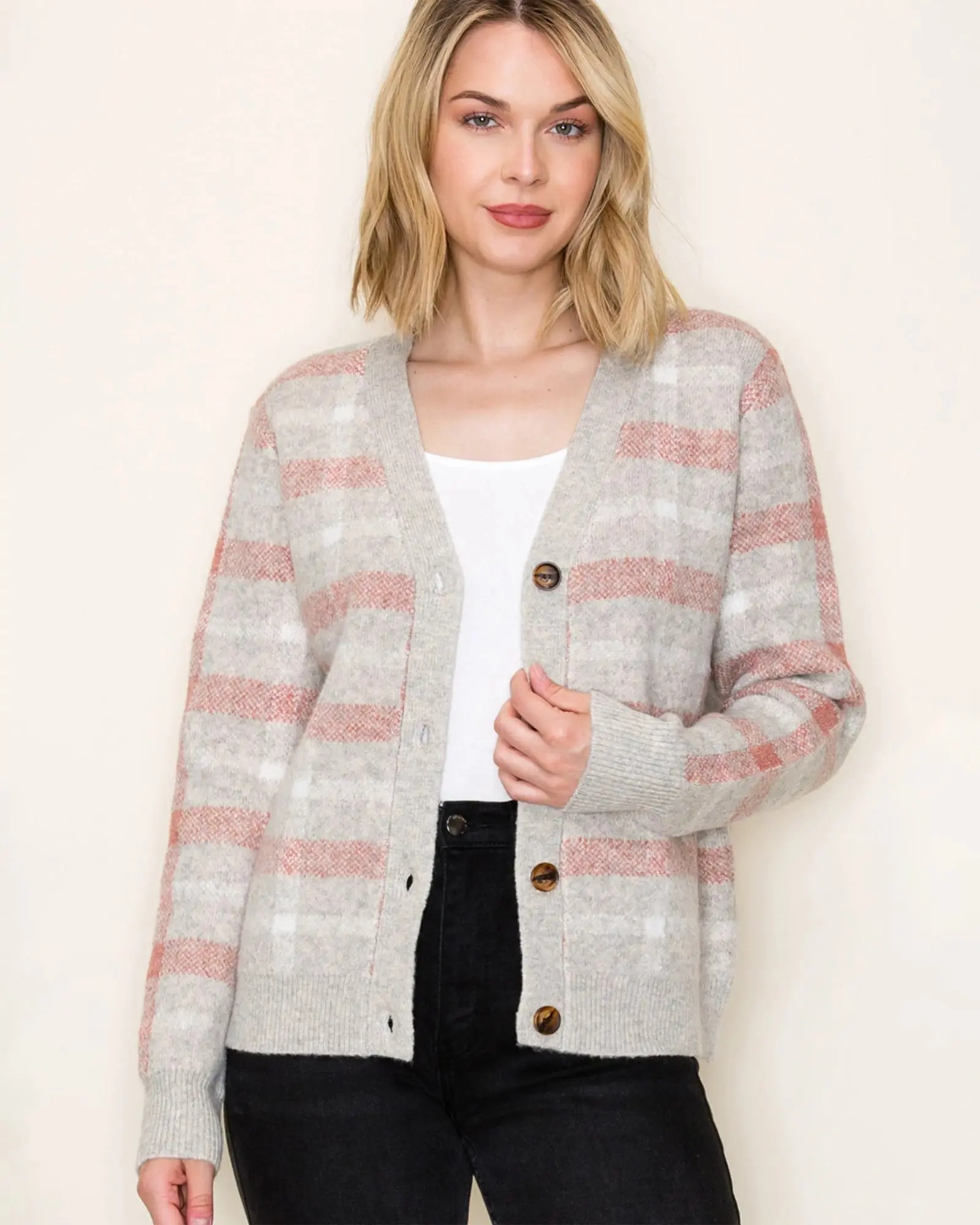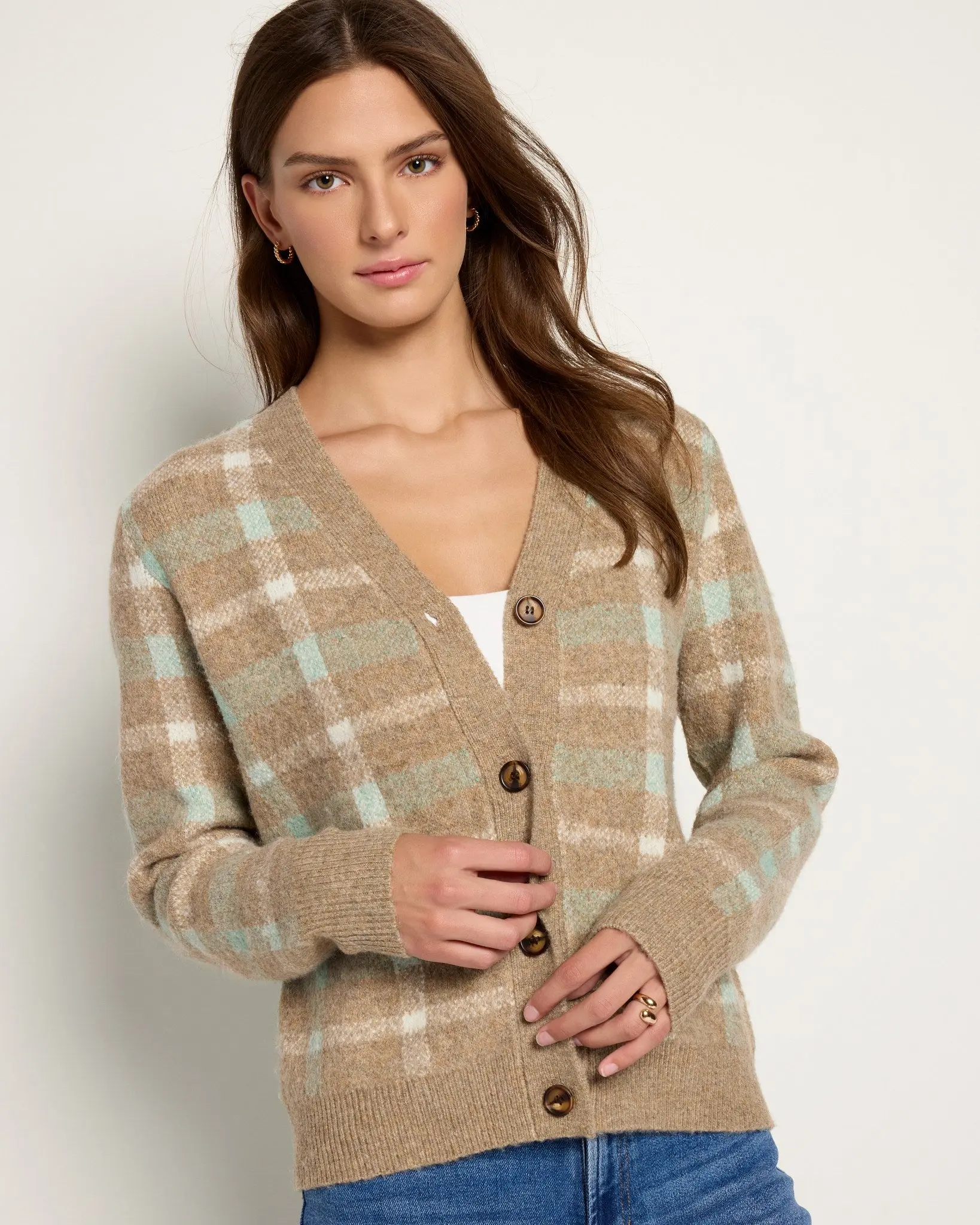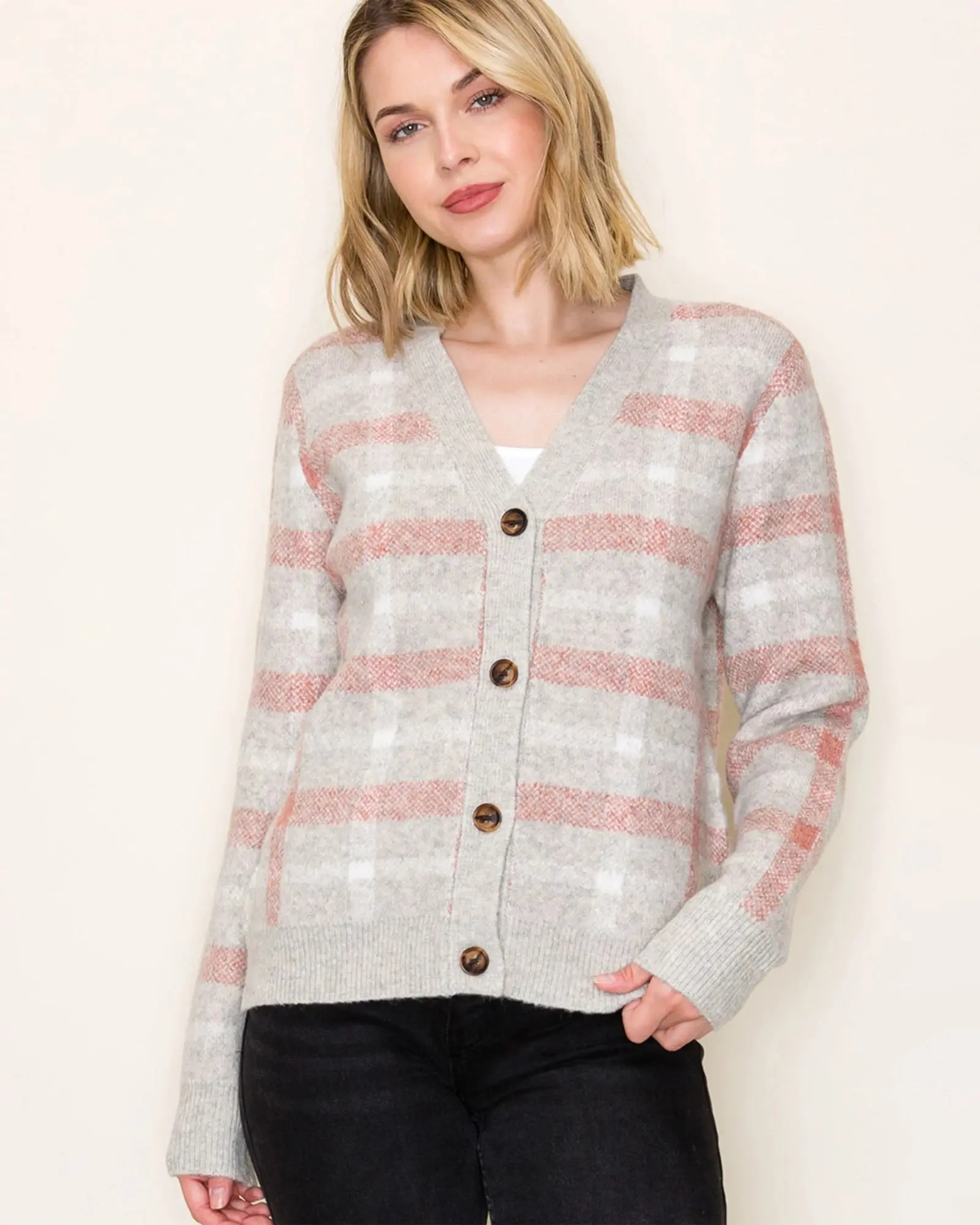 Get that chic vintage vibe with this checkered cardigan! Close, stretchy fit with a smooth v-neckline, button-front closure, and stretchy cuffs to lock in warmth. Made of a so-soft and snuggly knit.