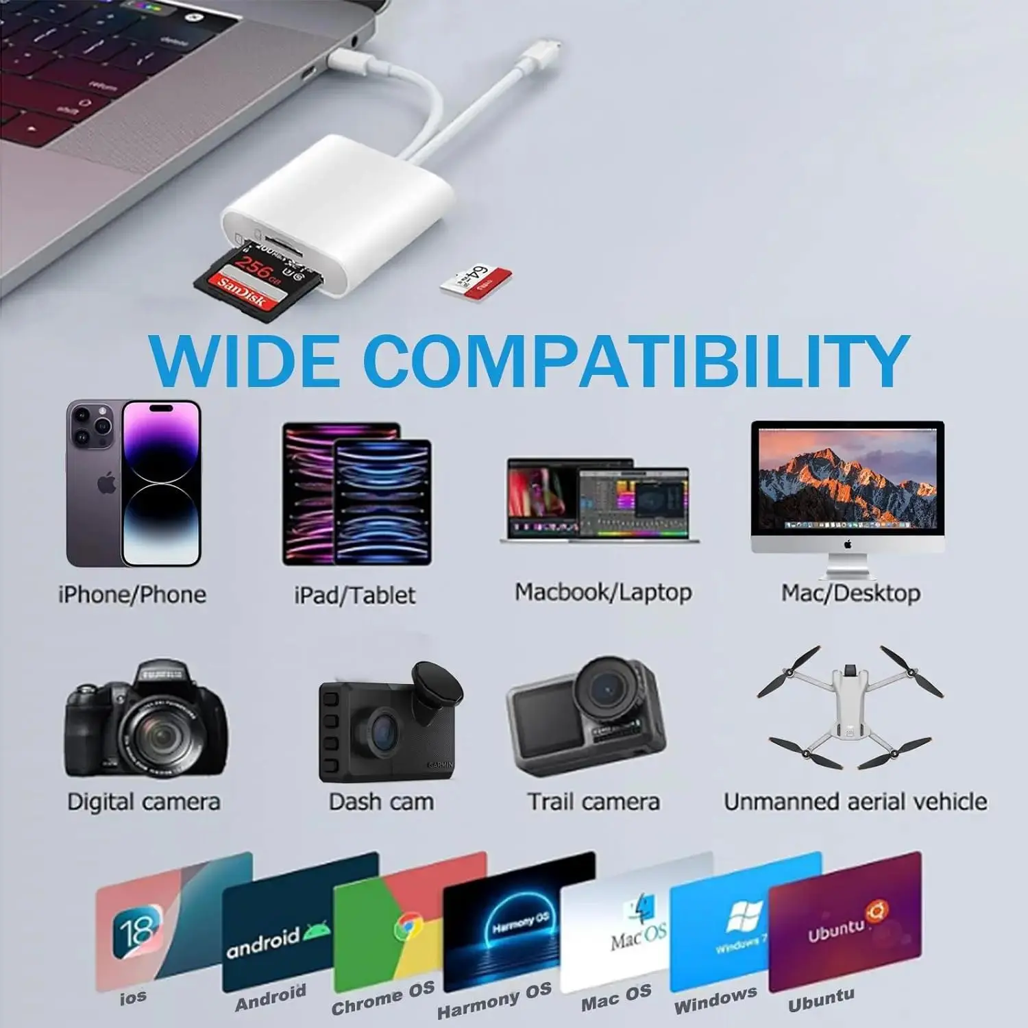 ·SD Card Reader for iPhone: SD card reader has USB-C & Lightning dual connectors, for iPhone 5-14, iPhone 15/16/17, iPad, Mac, Android phone, and tablet Type-C devices. Note: The two connectors cannot be used simultaneously.