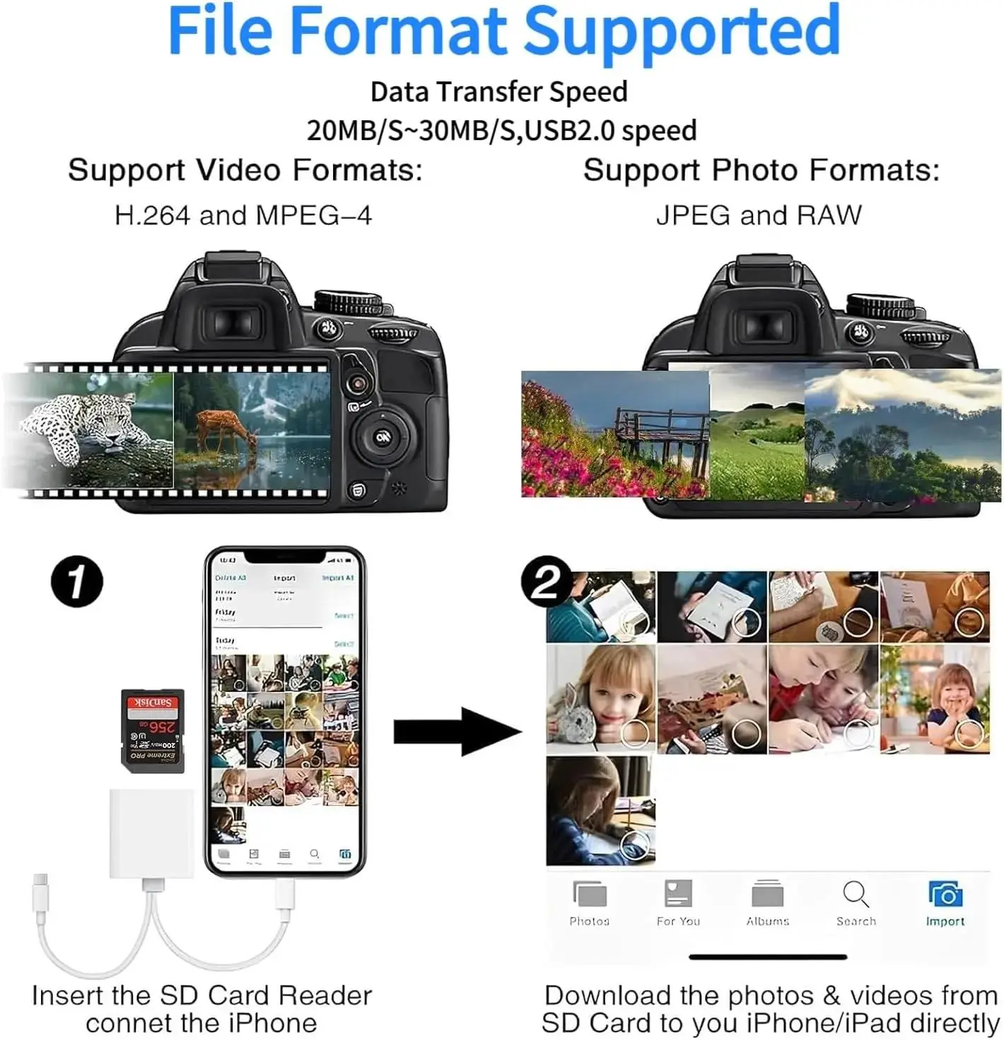 ·Ideal for Photography Creators: The iPhone SD Card Reader is designed for digital, trail, and hunting cameras, allowing you to instantly view the best moments of your shots! It supports stable two-way transfer of files, photos, music, and videos—from SD card to iPhone/iPad, or from iPhone/iPad to memory cards. This is a useful accessory for photographers.
