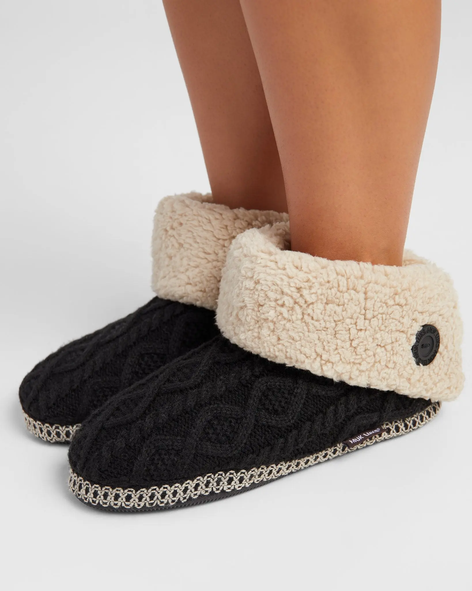These bootie slippers are perfect for cozy toes! Comfy faux fur lining, durable indoor/outdoor sole and a cable knit body for an extra lush look. Pull-on style and perfect for gifting (even to yourself).