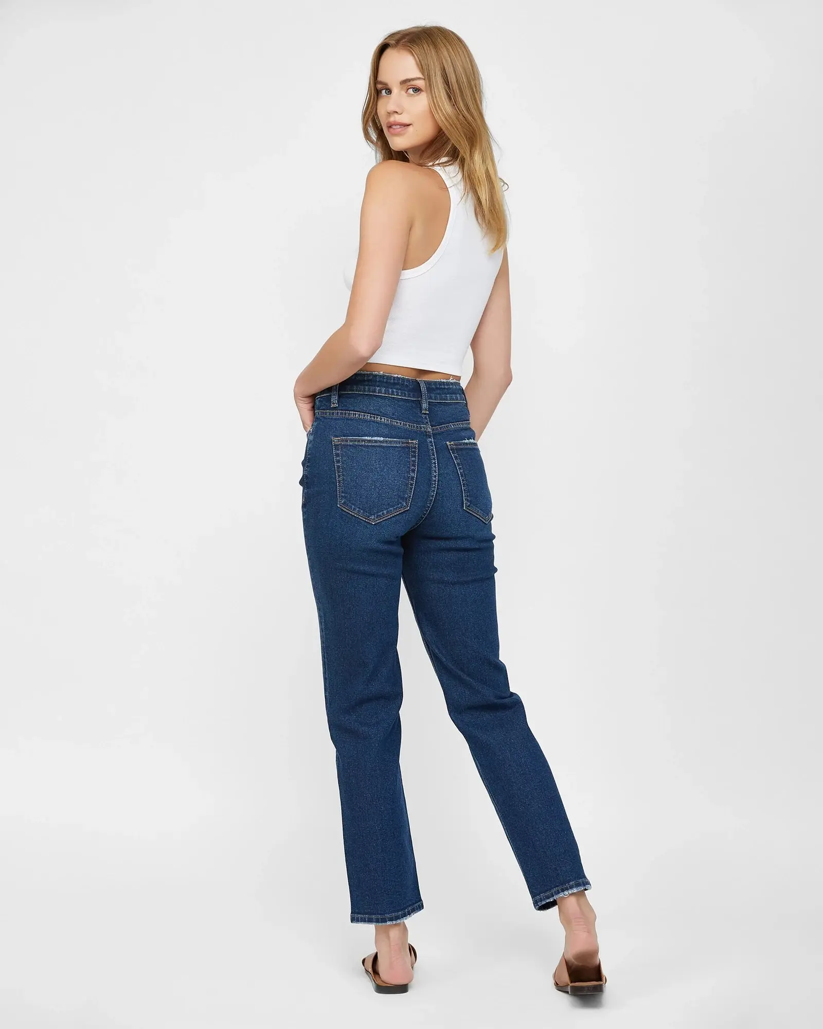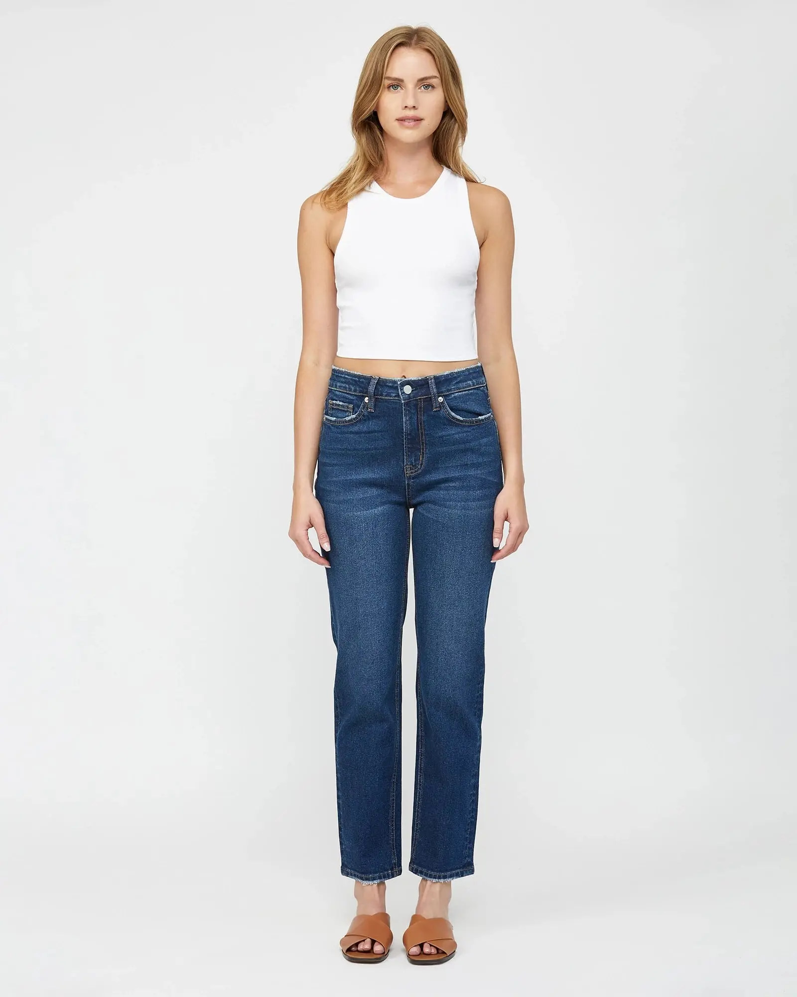 Subtle frayed details add life to these perfectly straight jeans! Designed to flatter your figure with a high-rise waist and ankle-grazing hem. Made to last in a durable denim with just-right stretch.