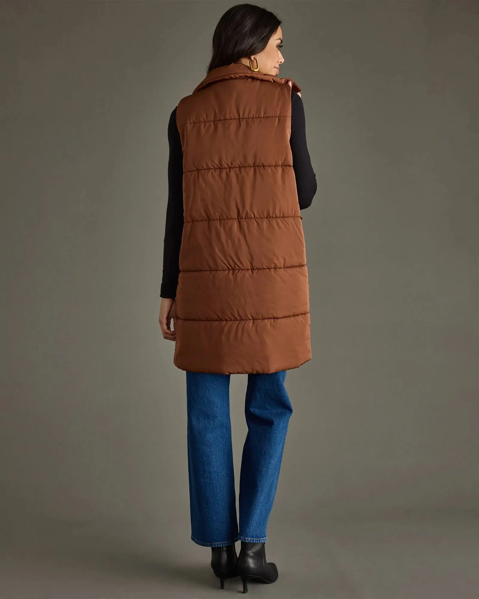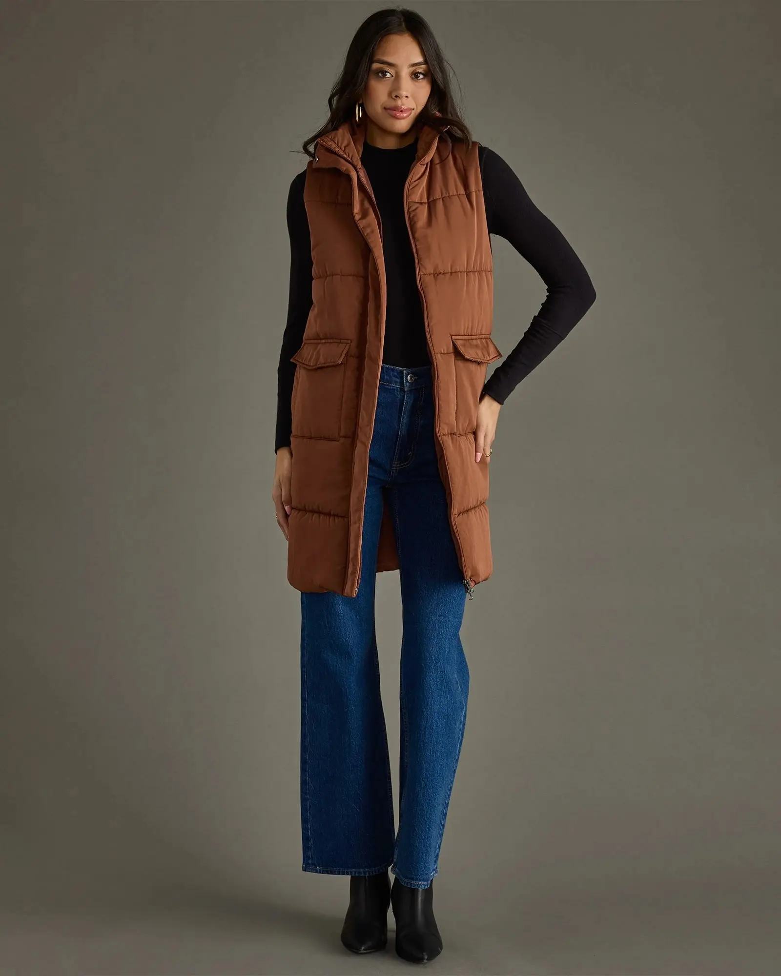 Feeling the chill? This long puffer vest will have you covered! Protective against the elements with a padded shell that fastens with a two-way zip and snap-button closure. The flap pockets will keep your essentials easy to grab.