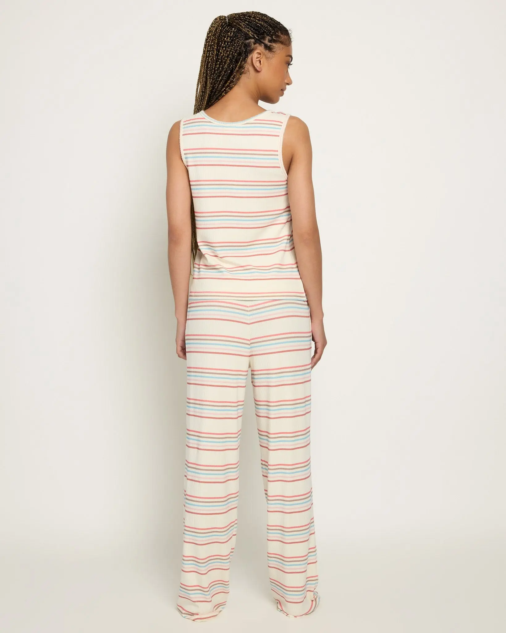 A scoop-neck tank with whipstitch edges pairs with striped ribbed pants that say “I tried, but not too hard.” Drawstring waist, straight-leg fit. Perfect for couch hangs, coffee runs, or pretending to be productive.