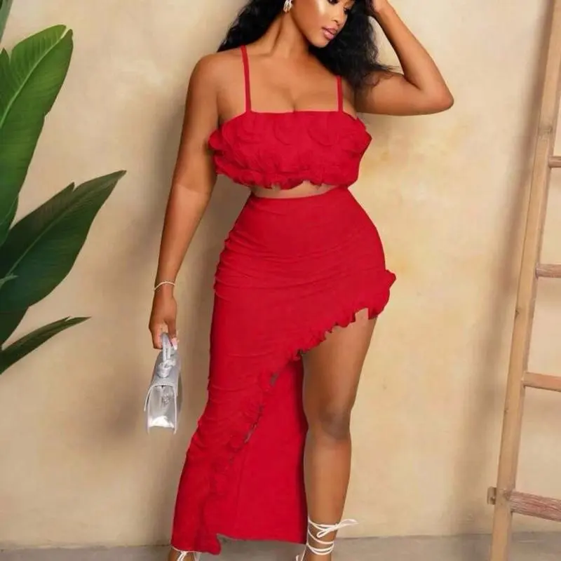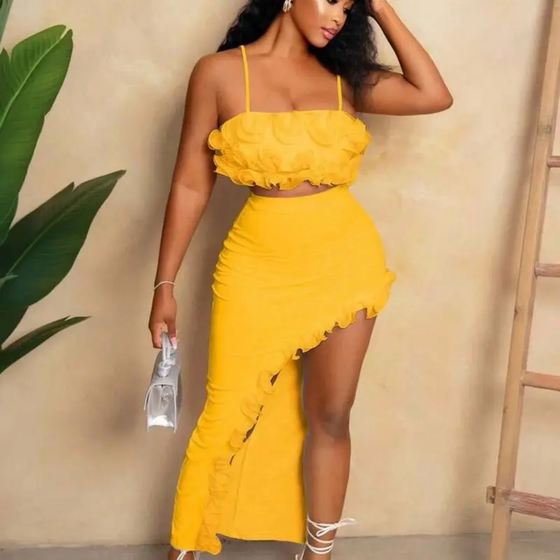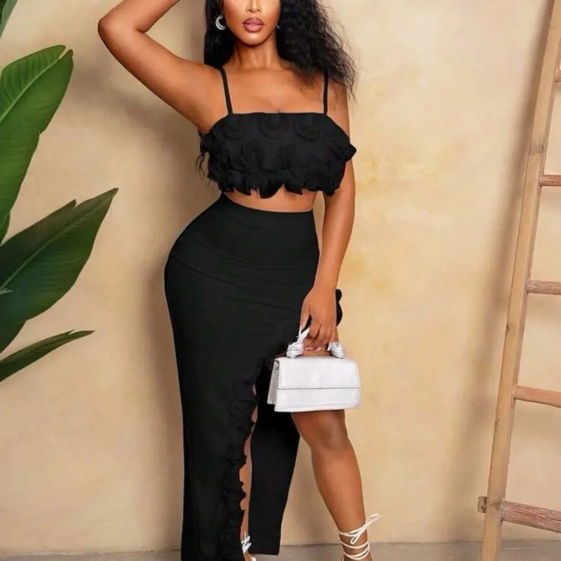 Mistrie Summer Fish Silk Thread 3D Flower Decoration White Solid Color Camisole Top And Split Long Skirt Two Pieces Set, Suitable For Parties And Dating Activities