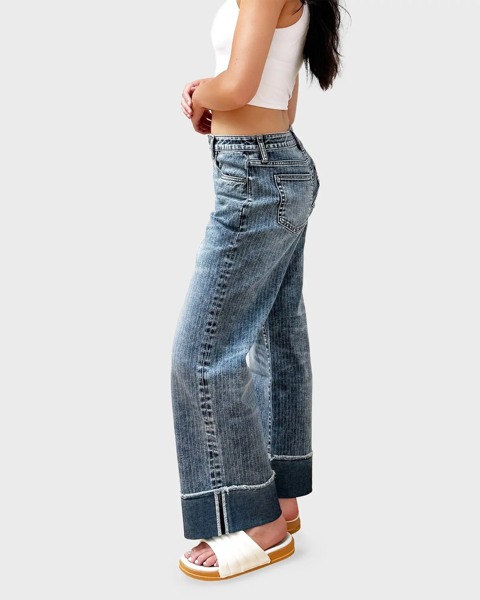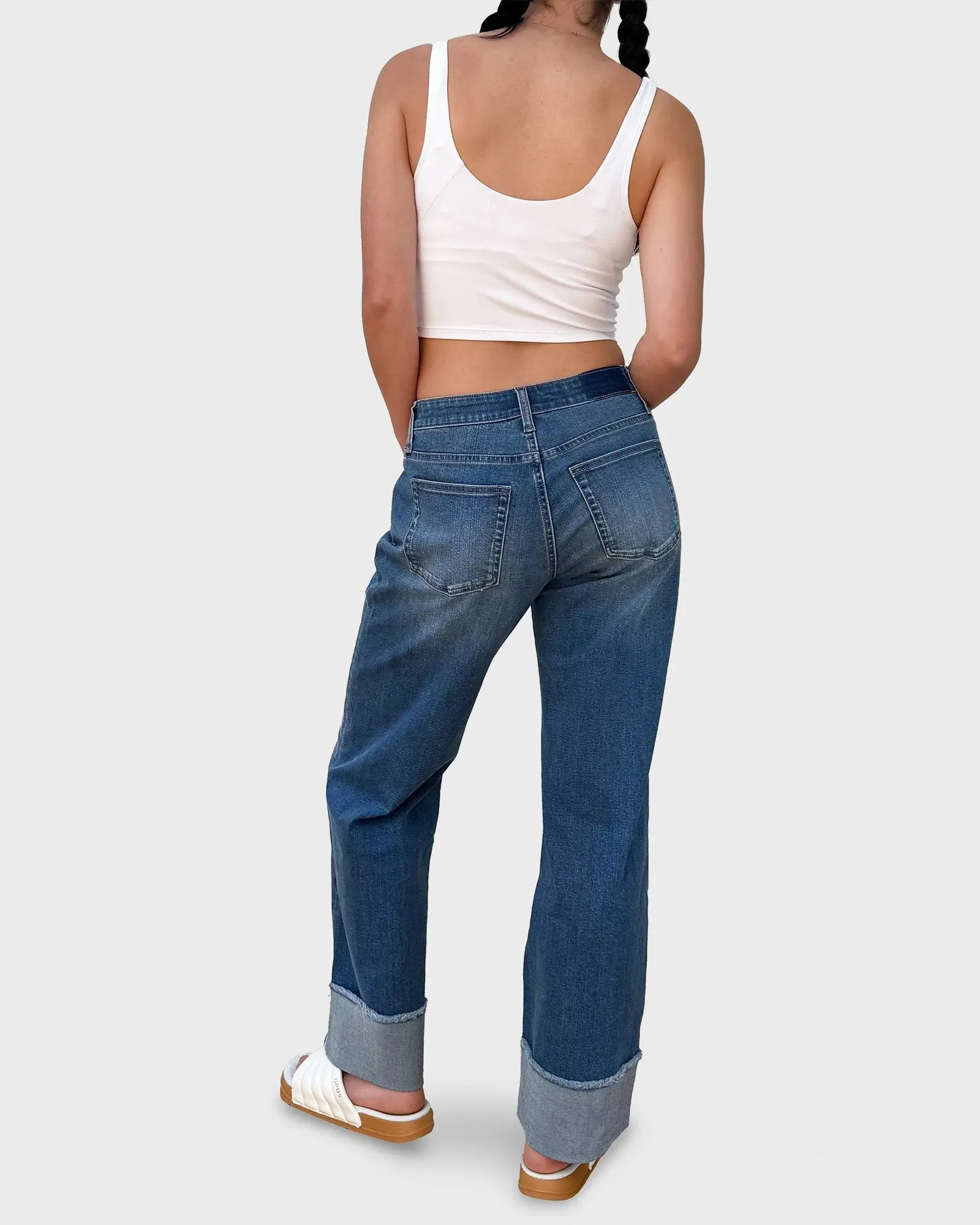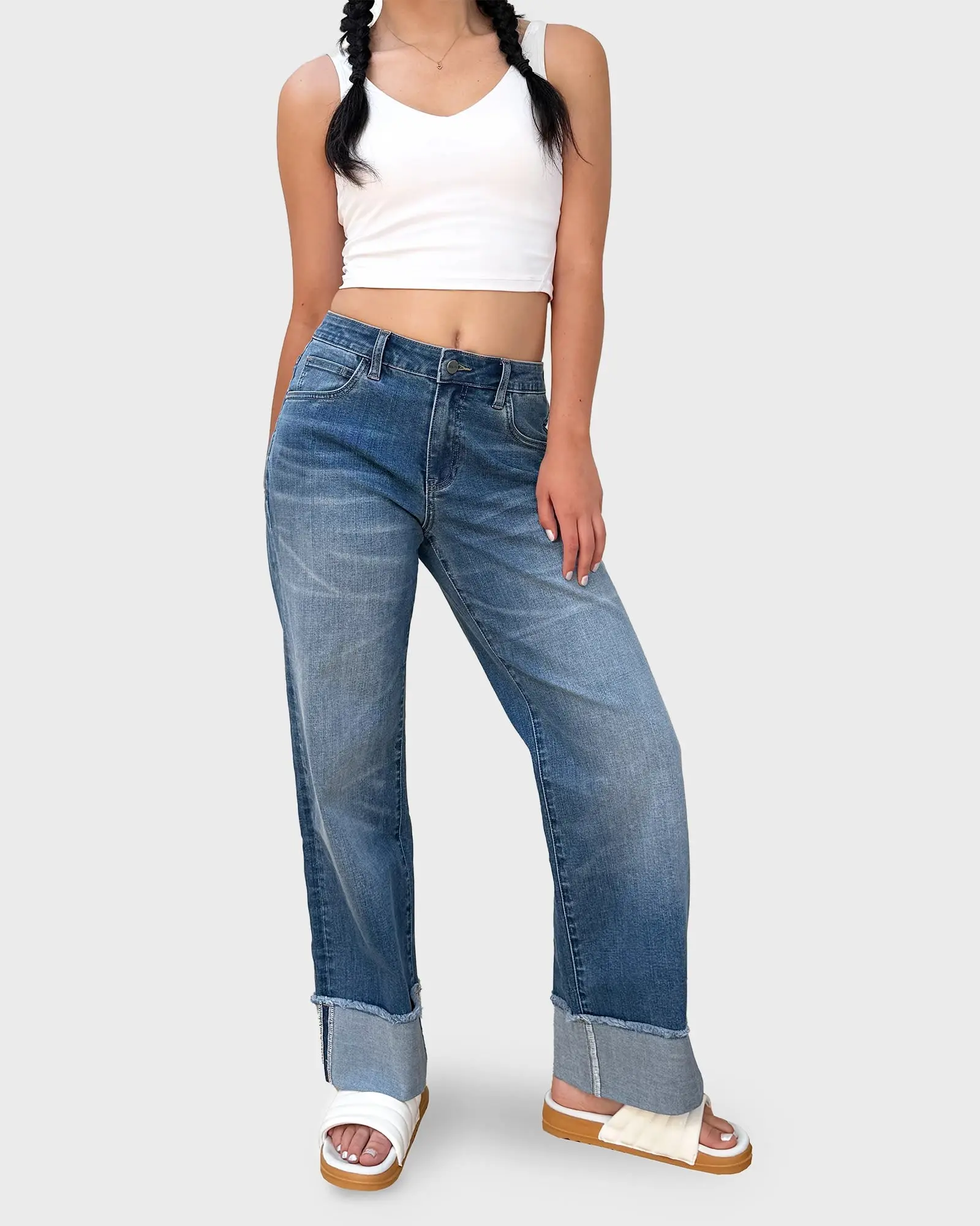 Nail the baggy look with these wide straight leg jeans! A nod to retro styles, they're made of a so-soft denim to achieve the perfect slouch. Mid-rise waist with whiskering on the legs and cuffed raw hems for character.