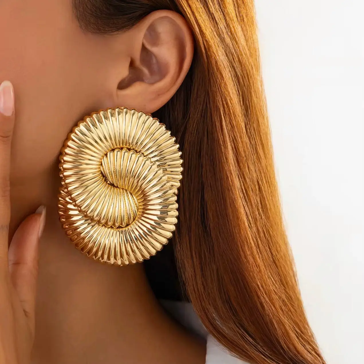 Inspired by vintage luxury aesthetics, the intricate ridged detailing catches light from every angle, giving off a radiant glow that instantly elevates your look. Their oversized circular form frames the face beautifully, making them the perfect finishing touch for both elevated everyday wear and special occasions.