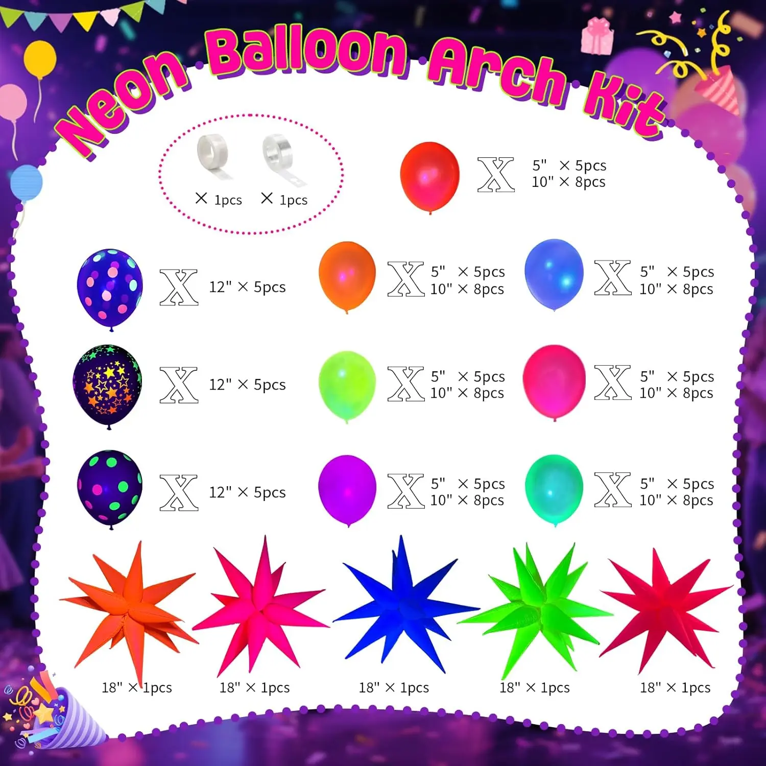This set includes unique foil explosion star and cone balloons designed to stand out and enhance blacklight themed events or night parties