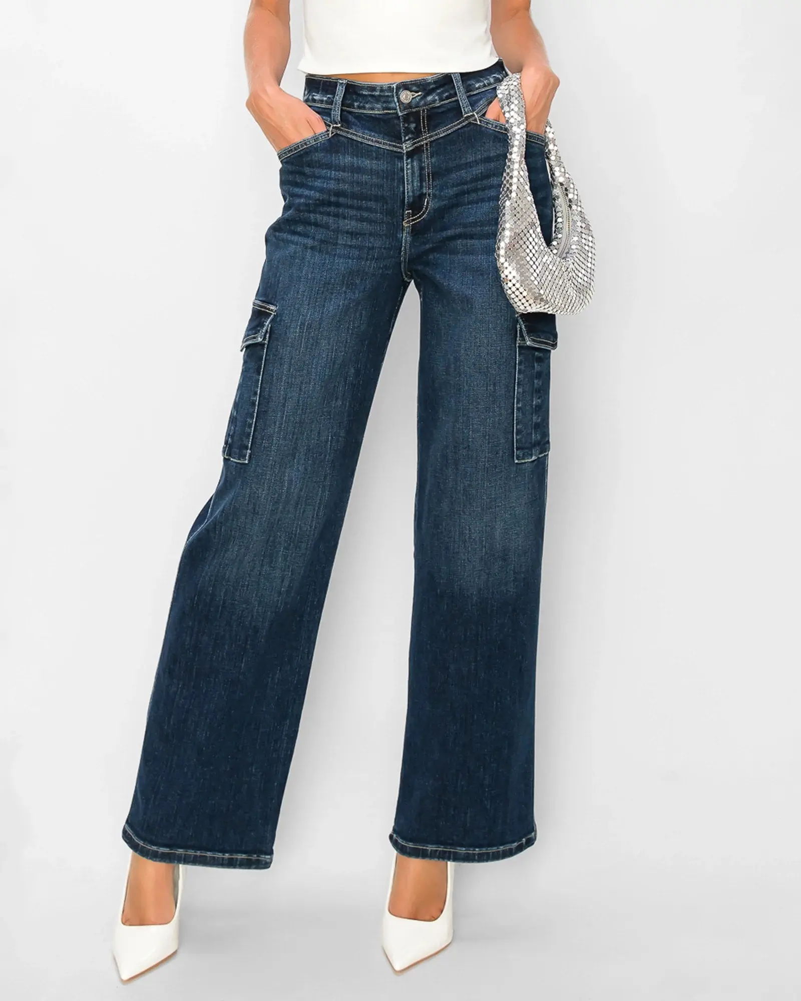 Not a want, but a need. You won't run out of pockets with these cargo jeans! Plus, they sculpt your figure with a high-rise waist and front yoke that drops roomy, wide legs. Made of so-soft denim just enough comfy stretch.