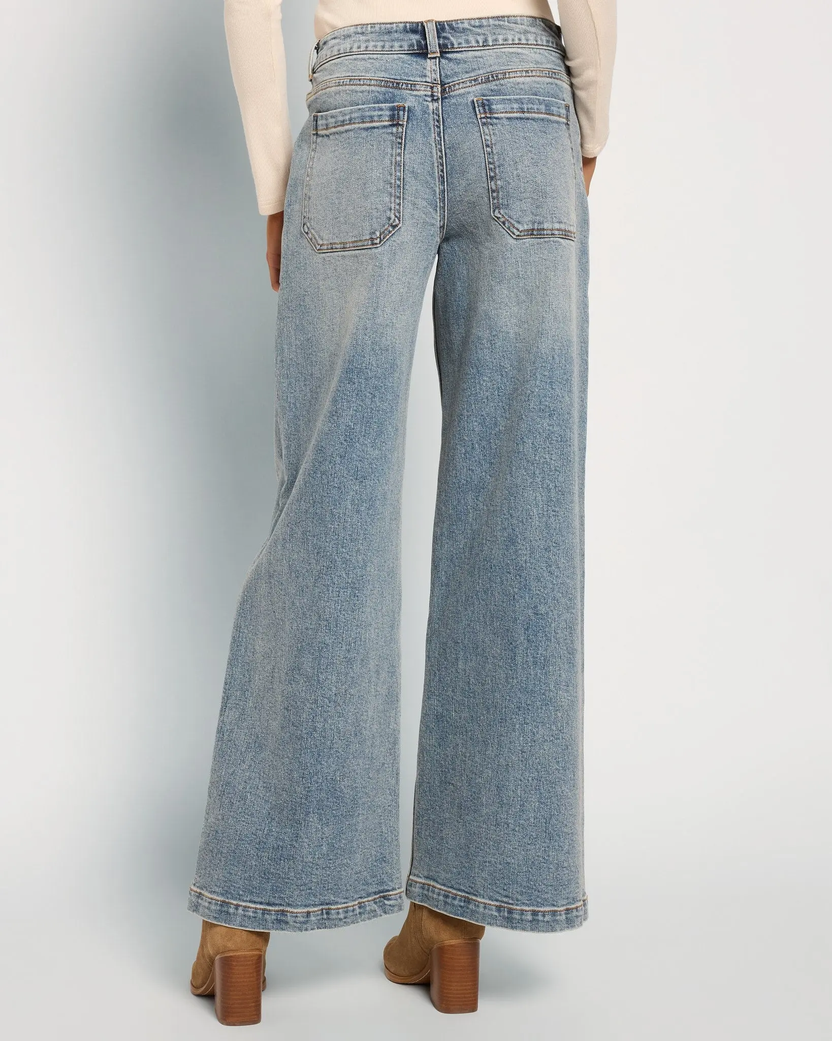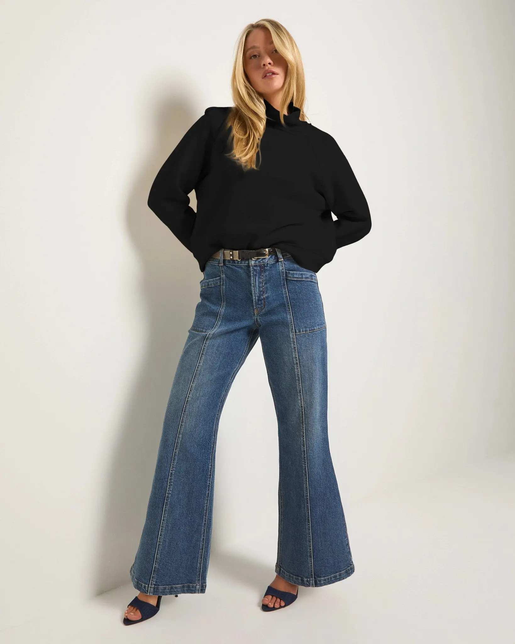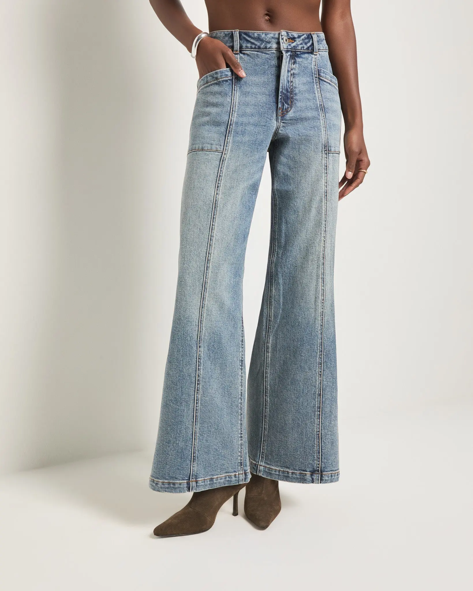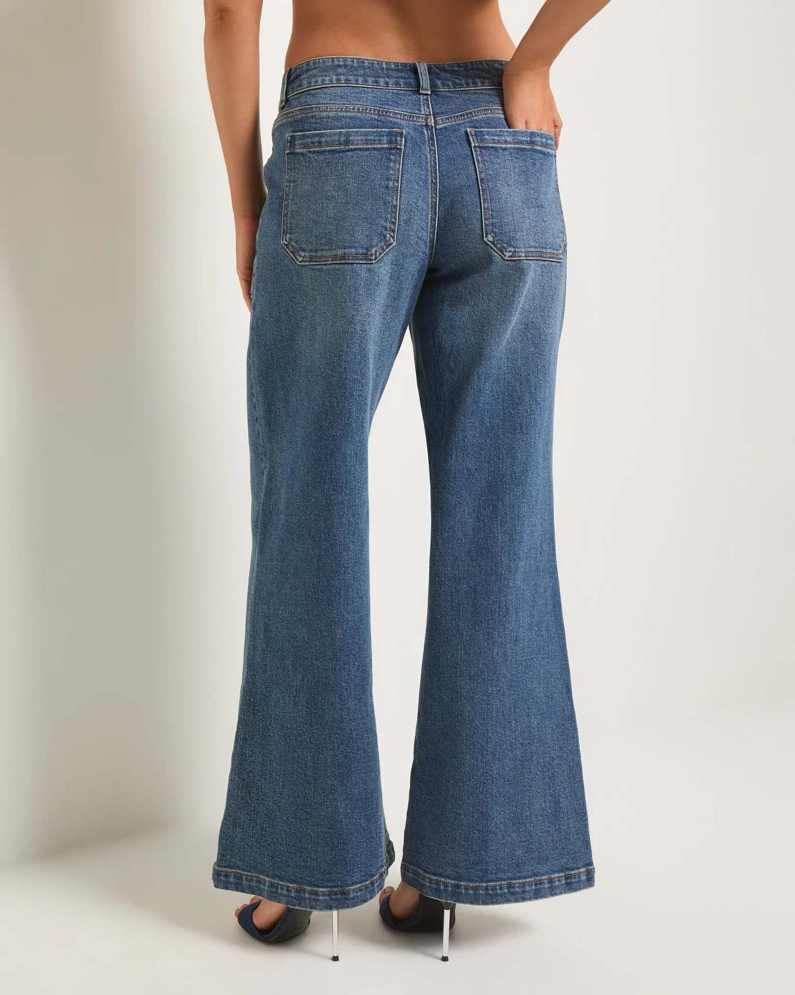 Structured 99% cotton denim in a mid-rise flare with center seams and patch pockets. It’s the kind of jean that makes a statement before you even say a word.