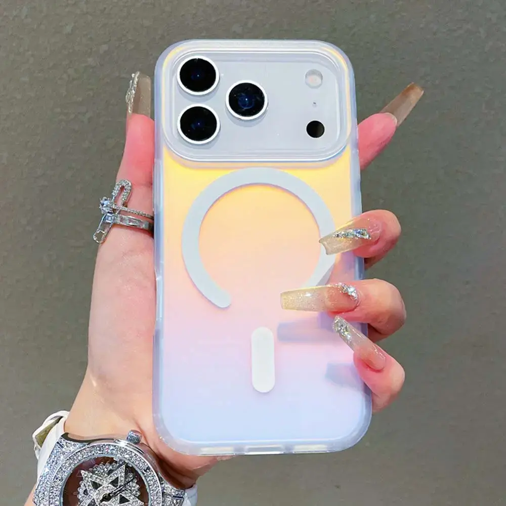 [Iridescent Gradient DesignThe unique and novel rainbow gradient changes color with different angles and lighting, offering a mesmerizing look that showing beautiful uniqueness and your aesthetic taste (Note: the display of the picture does not represent all the colors of the case), Hard PC Back ProtectionFeatures a PC back panel for superior impact protection and TPU materials that resist yellowing, ensuring lasting clarity and durability. This design not only increases the durability of phone case for iPhone, but also maintains a beautiful appearance, Super Comfortable GripDesigned for a sleek, lightweight feel with a textured grip. The inner airbuffer corner structure ensures a secure, snug fit for added stability and protection, Lens and Screen ProtectionRaised edges have been added around the screen and camera to prevent accidental drops, collisions, and scratches, ensuring comprehensive 360 ° protection for your device., Compatible with MagSafeWe also offer magsafe and no magsafe versions.Built-in magnets for iPhone magnetic case ensure seamless wireless charging, offering the ultimate convenience and compatibility with MagSafe charging. Plus, enjoy peace of mind with our 30-day product assurance]