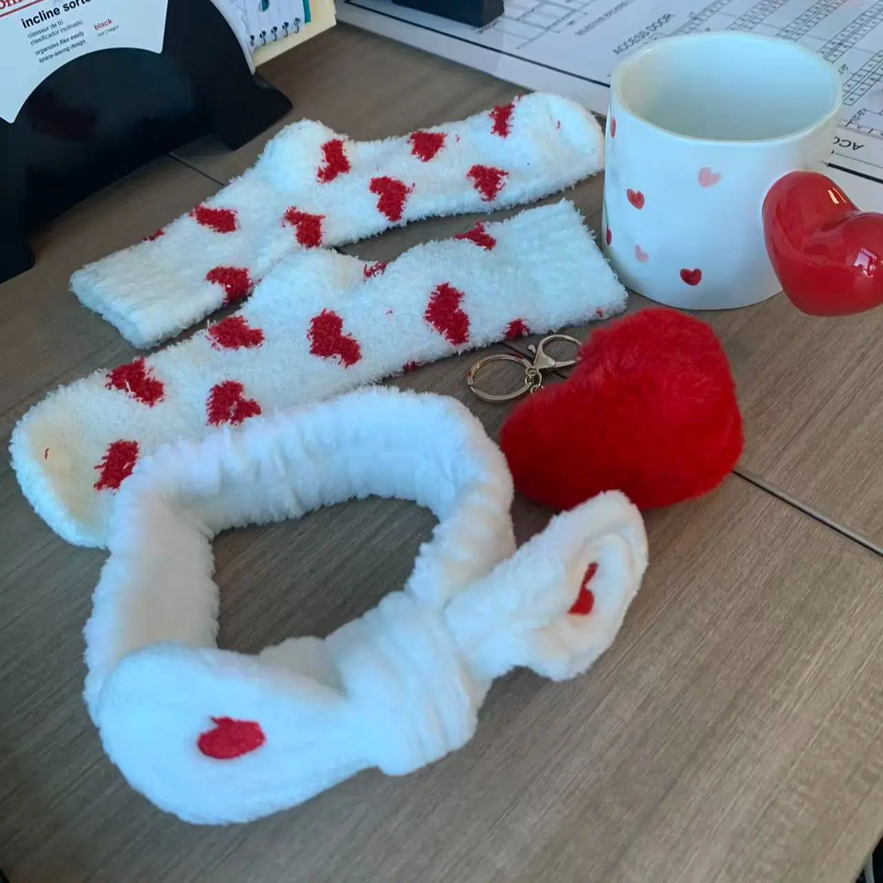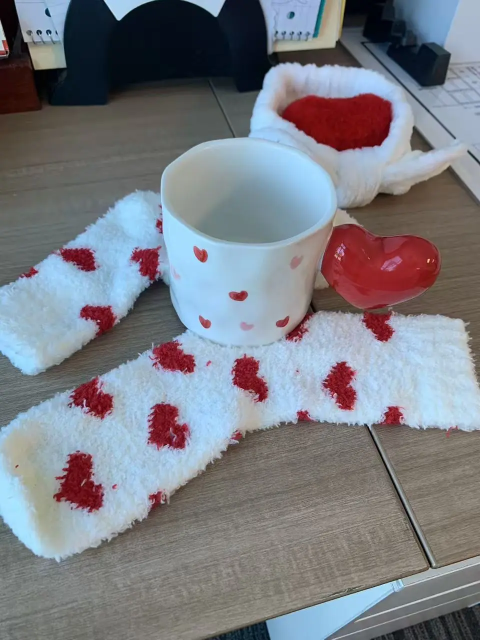 This charming gift set combines a beautifully designed mug with a collection of soft, cozy plush accessories, creating the perfect blend of style and comfort. The mug features a delicate white finish adorned with subtle red heart details, complemented by a unique heart-shaped handle that adds a romantic and playful touch. It’s ideal for enjoying your favorite coffee, tea, or hot chocolate while brightening up your daily routine. Paired with the mug are adorable plush items, including fluffy socks, a soft headband, and a heart-shaped keychain. Each piece is crafted from ultra-soft materials, providing a warm and gentle feel that enhances relaxation and comfort. The red-and-white color palette brings a sense of warmth and affection, making this set especially suitable for gifting on special occasions. Whether you’re looking for a thoughtful present for a loved one or a cozy treat for yourself, this set offers both practicality and aesthetic appeal. It’s perfect for creating small moments of joy, adding a touch of sweetness to everyday life, and making any space feel more inviting and delightful.