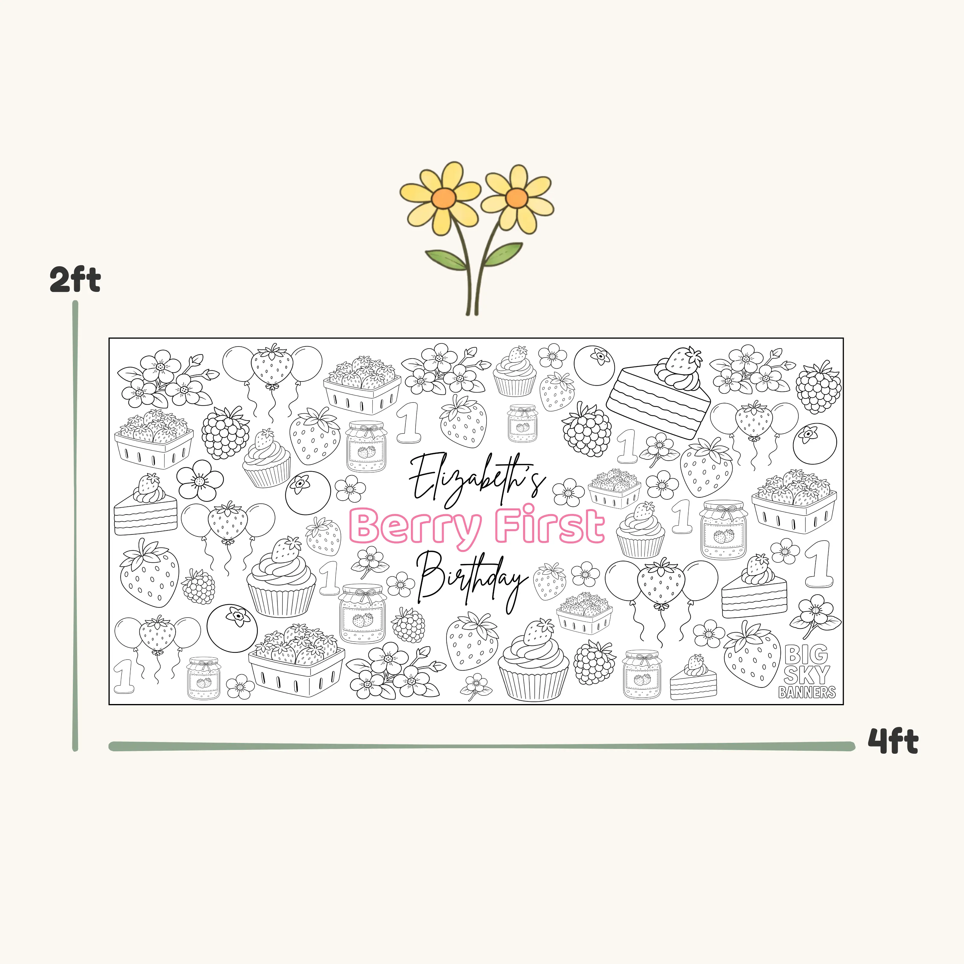 Celebrate your little one’s first birthday with a sweet and memorable activity everyone can enjoy. This personalized Berry First Birthday giant coloring banner is the perfect party activity for kids and a fun way to add extra charm to your celebration. Featuring strawberries, flowers, berries, cupcakes, and a custom name, it doubles as both party decor and an interactive activity.