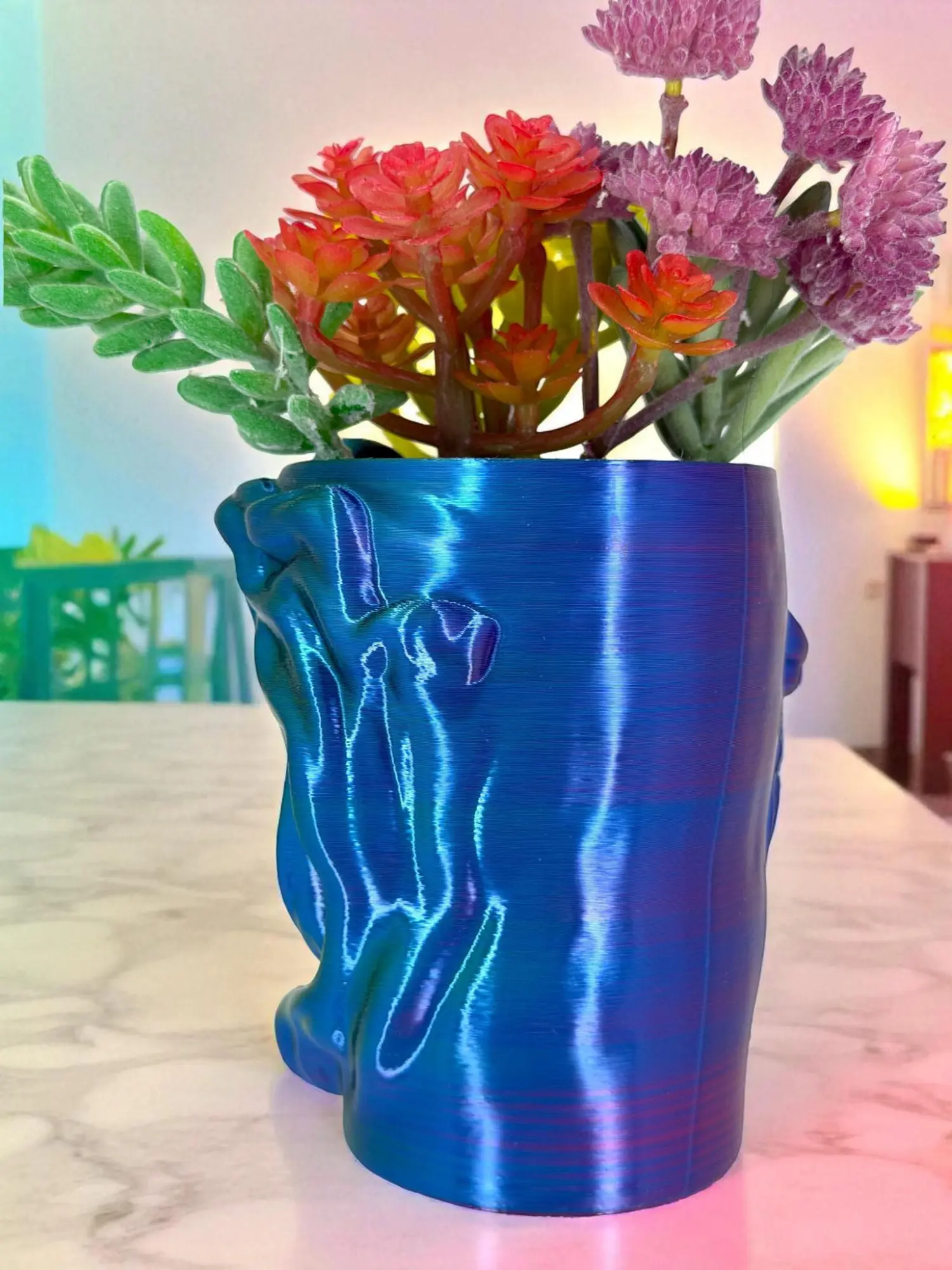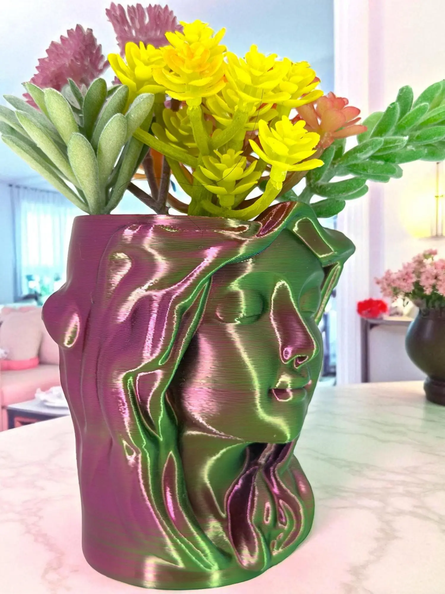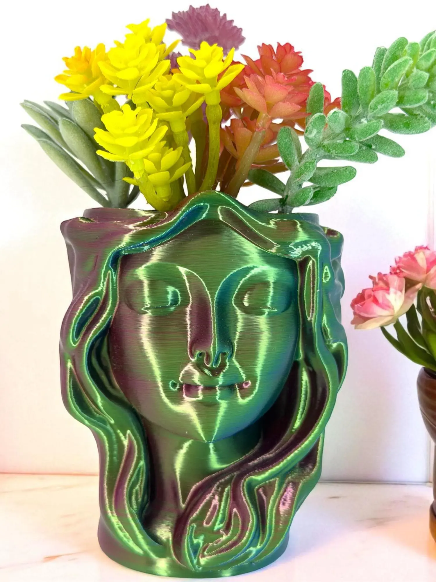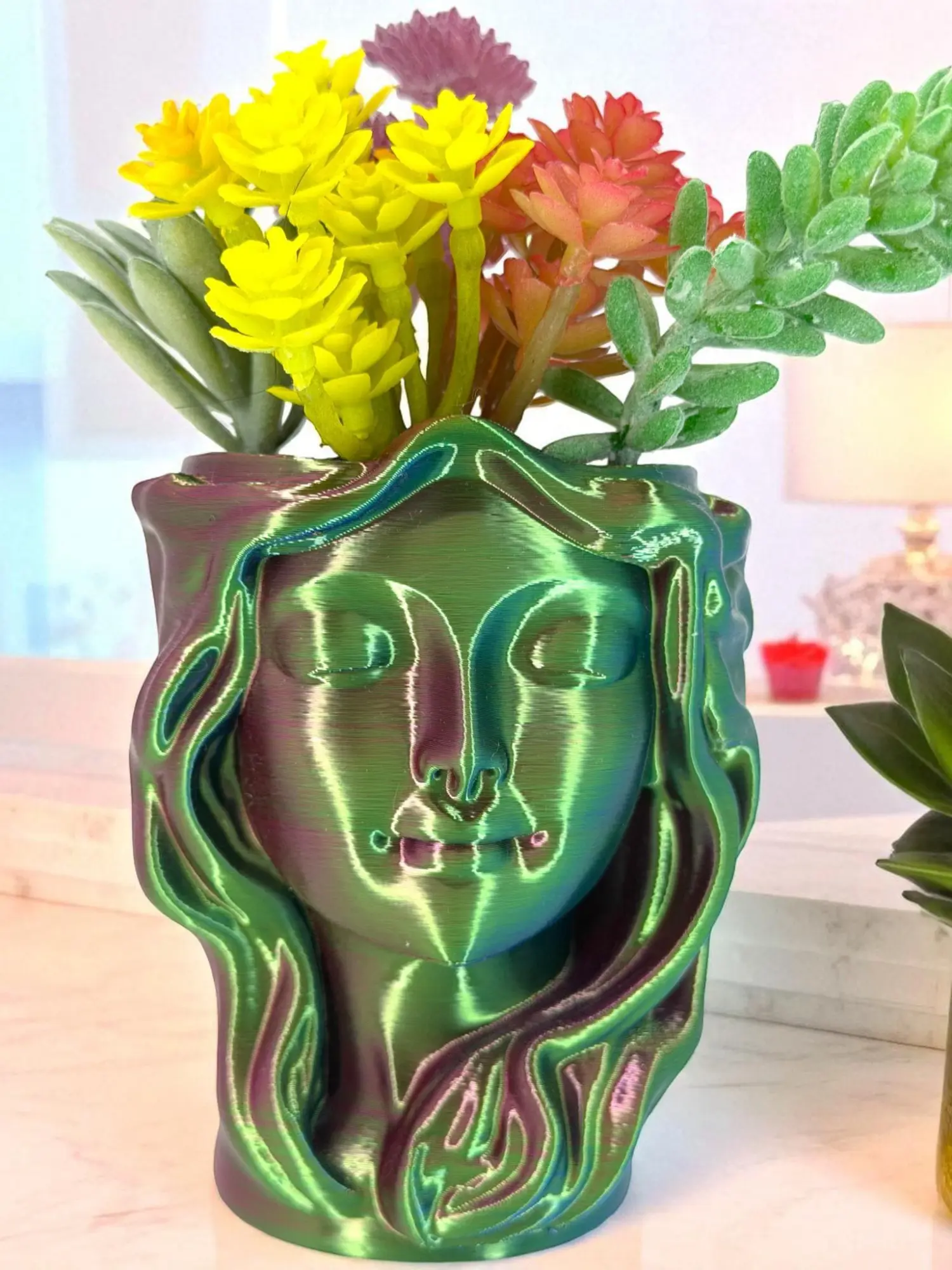 Serene goddess face + flowing sculptural hair, finished in a shimmering Aurora Prism gradient that shifts green, purple, and red as the light hits.