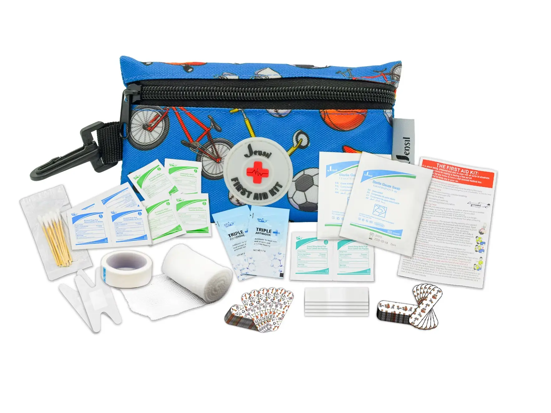 Gear up for adventure with the Jensil Let’s Go First Aid Kit. Especially designed for active children, this compact, sports-themed kit includes 70 essential items to quickly handle minor, cut scrapes and injuries. Featuring vibrant sports-themed bandages, cleansing wipes, and gauze pads. It has what you need to get you back to action fast. The durable, eye-catching case is easy to spot in a backpack or sports bag, making it perfect for outdoor activities, organized sports, or any on-the-go adventure. With the Jensil Let’s Go First Aid Kit, parents can keep their little champions safe, supported, and ready to play