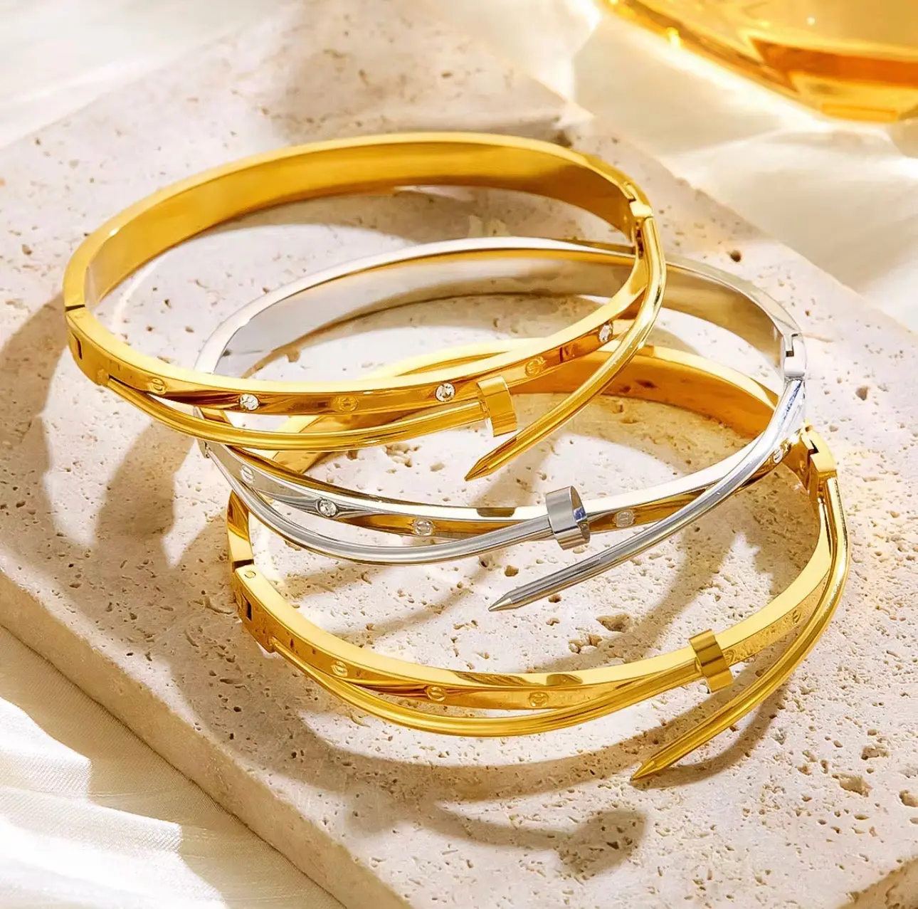 Available in both gold and silver tones, the Nova Nail Bangle complements any style, from casual looks to elevated ensembles.