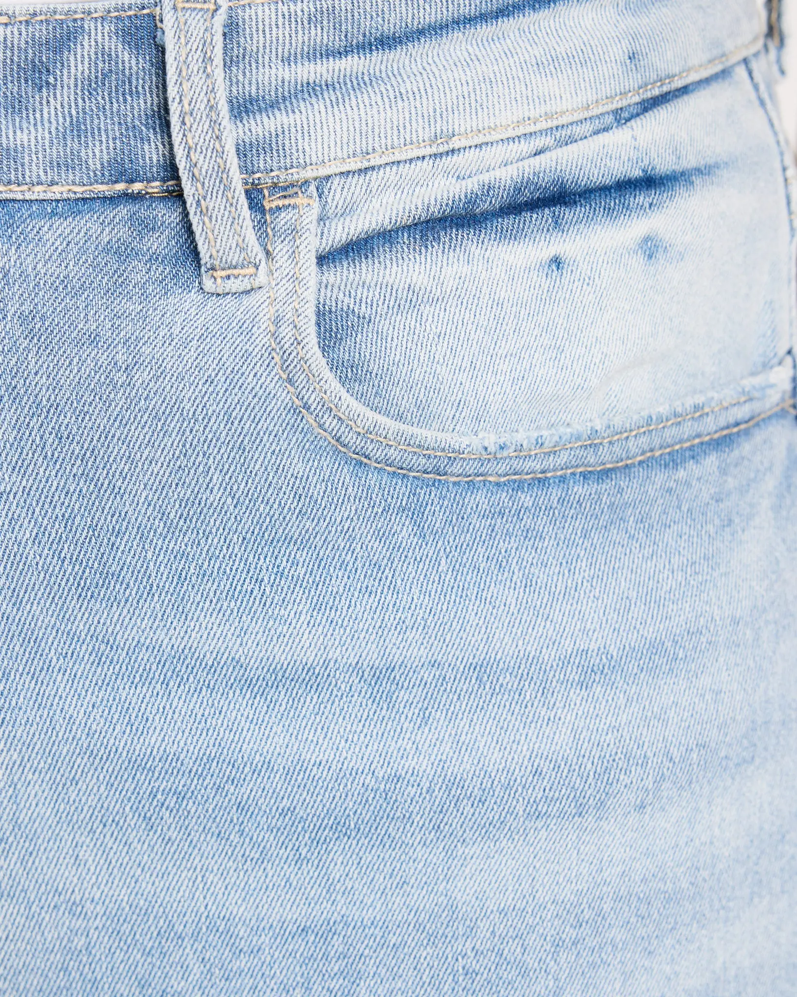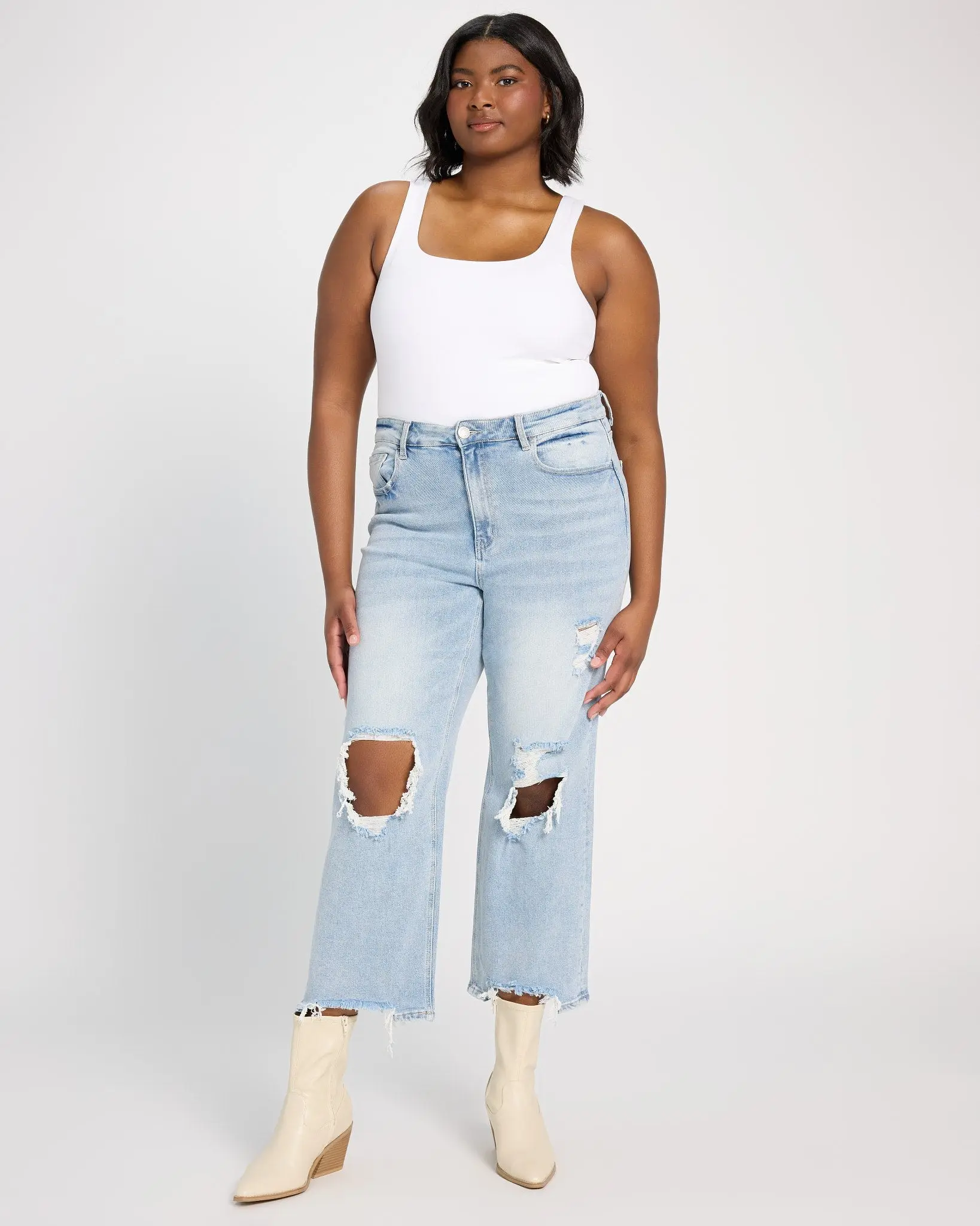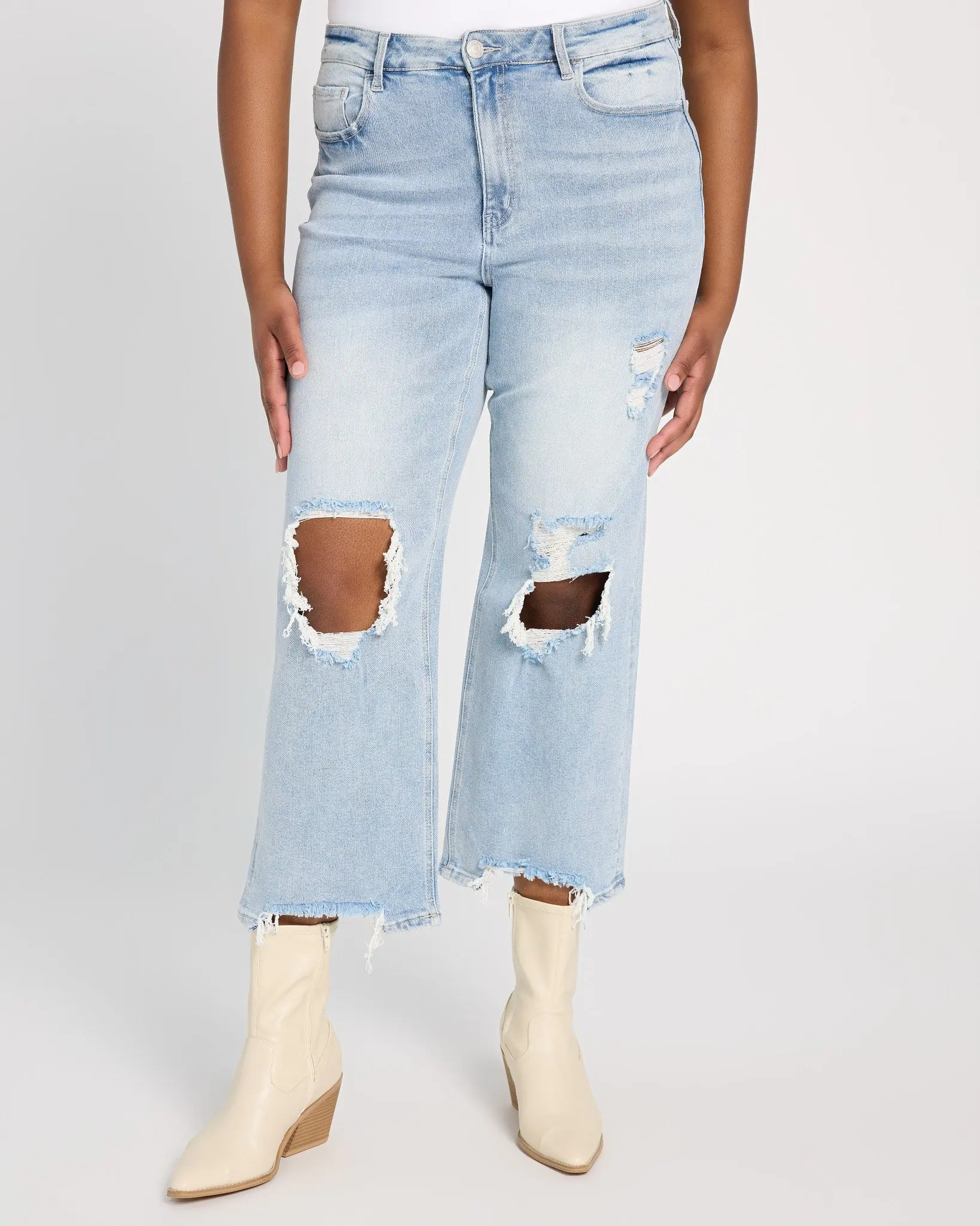 As comfy as your dad's favorite denim. These high-waisted straight-leg jeans feature generous distressing, five pockets and a zip fly. Made from light stretch denim with raw-cut hems and subtle washed details.