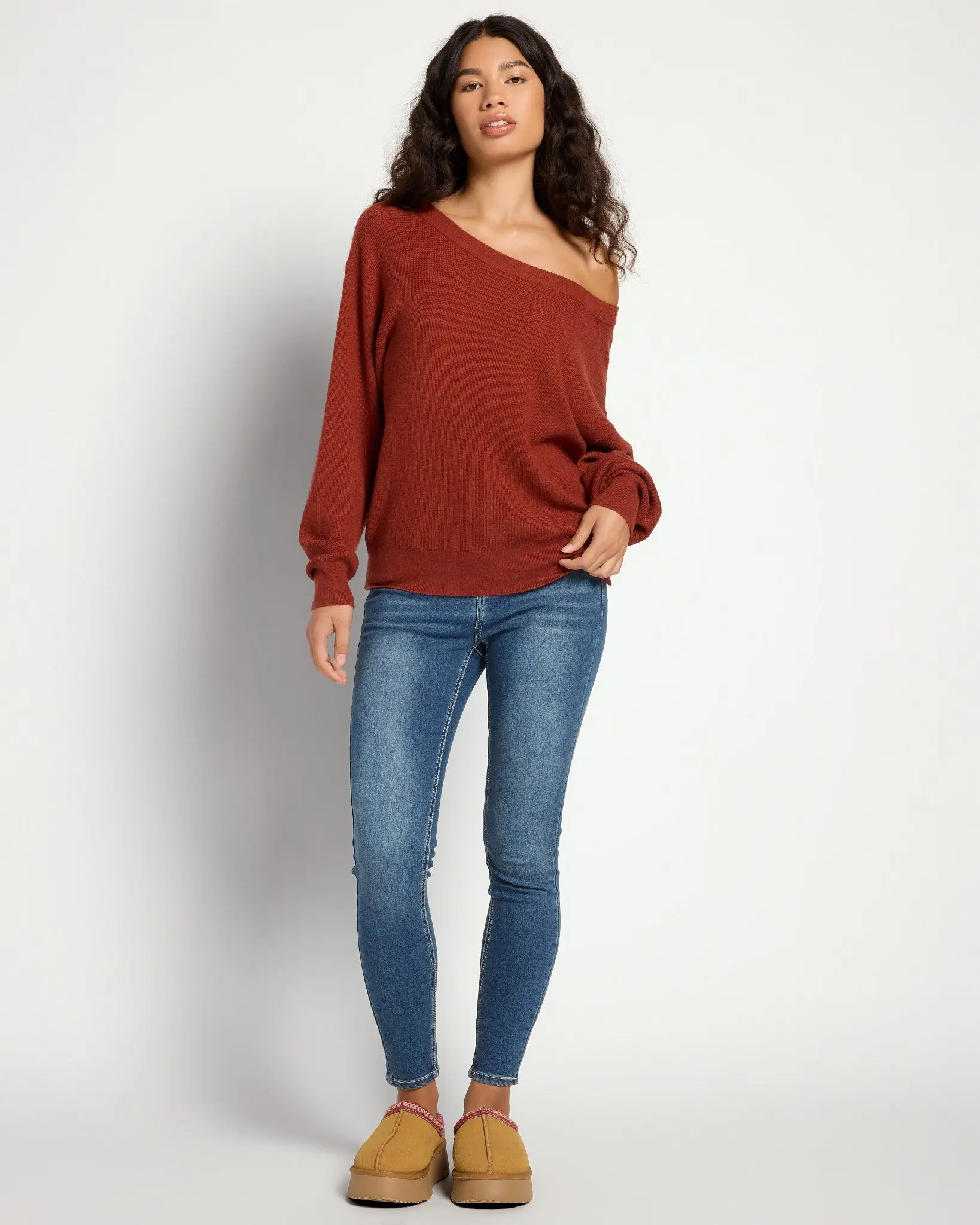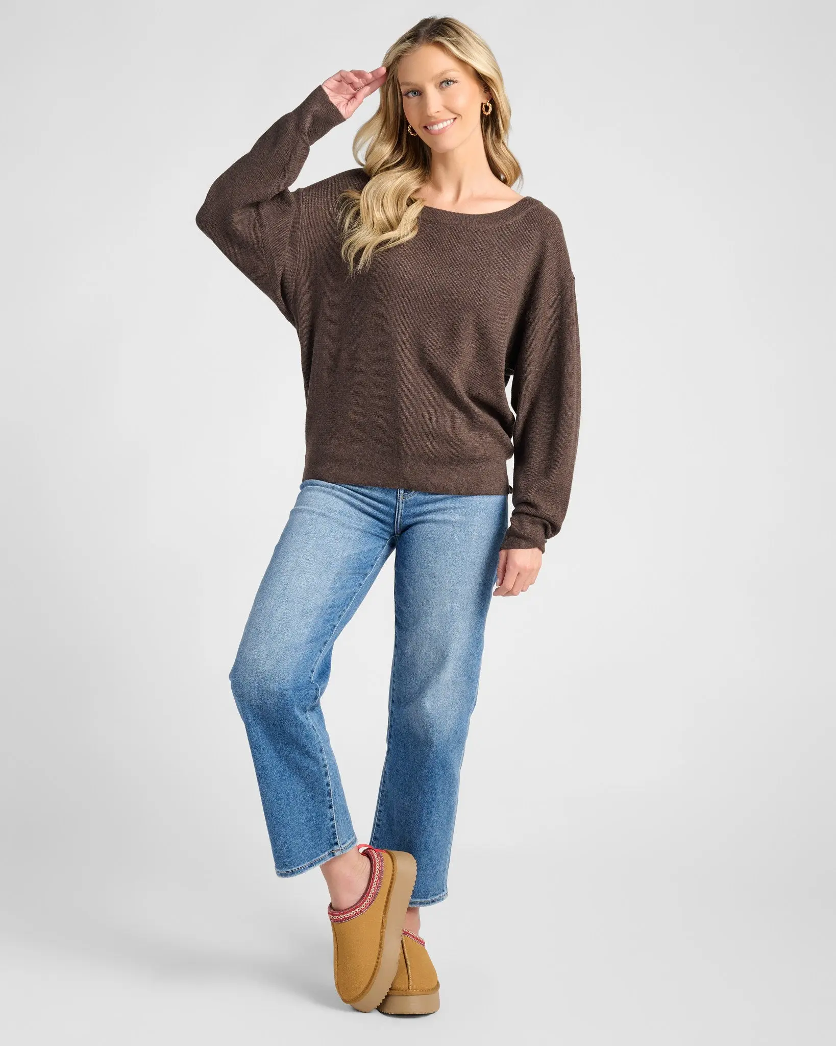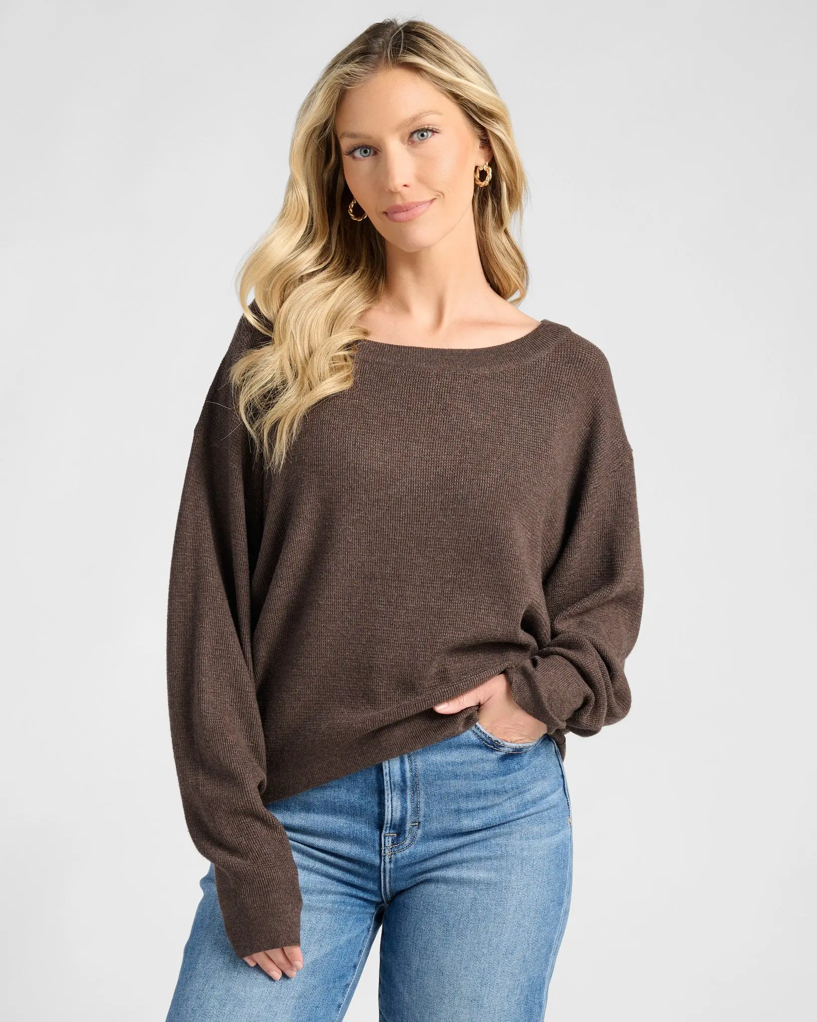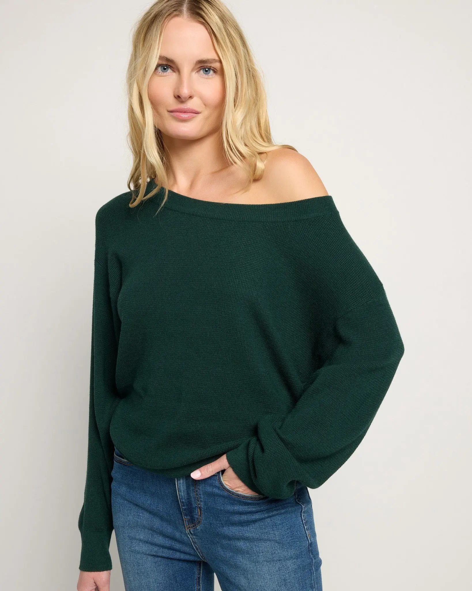 One shoulder, endless easy style. Our waffle knit sweater has a relaxed fit with a wide neckline, dropped shoulders and cozy cuffs. So-soft and stretchy in a midweight waffle knit.