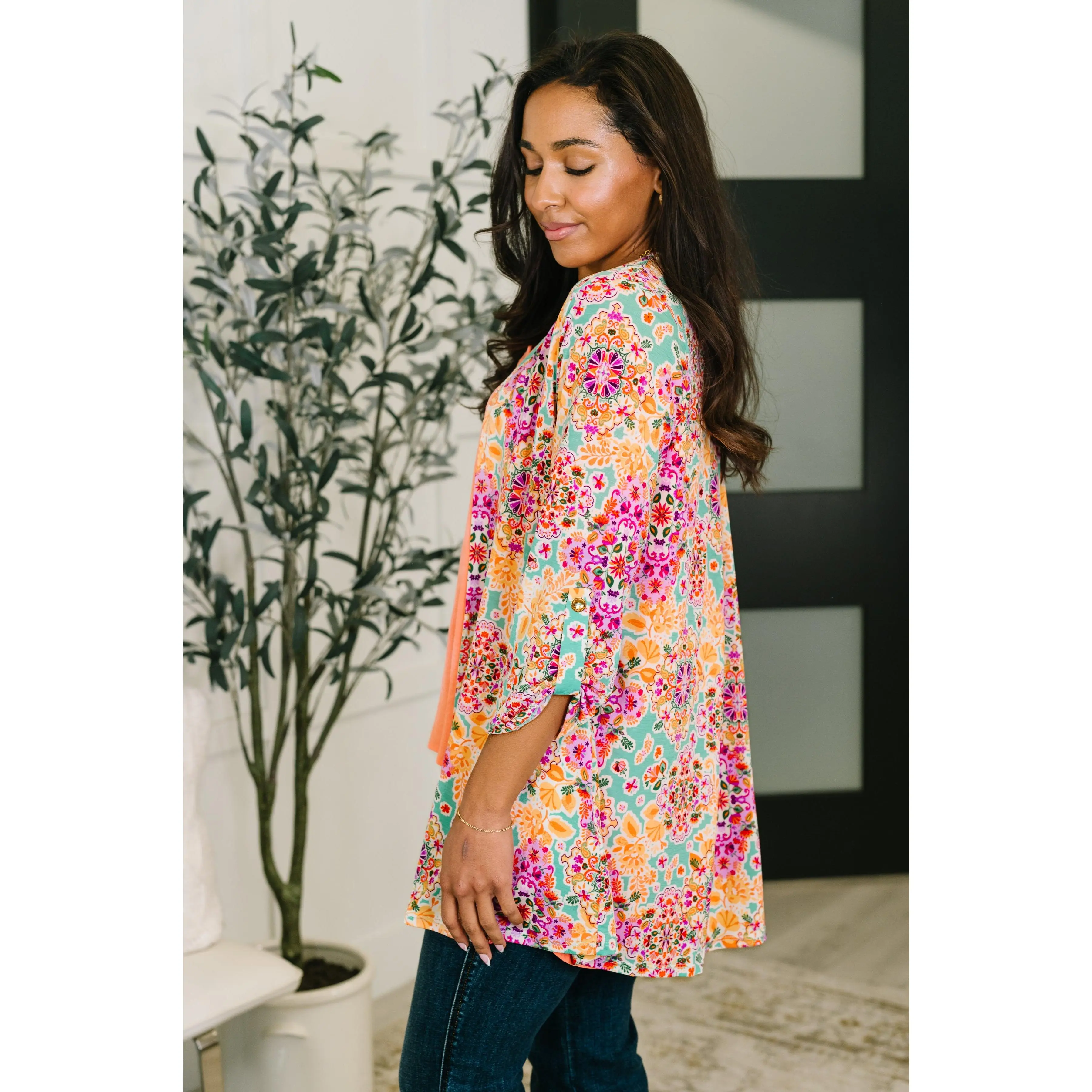 Introducing the Lizzy Cardigan, the perfect blend of style and comfort. Stay cool with the Bulagri fabric and enjoy the wrinkle-resistant and lightweight properties. Featuring faux button tabs on 3/4 sleeves, an open front, and a pleated back for a unique look. With functional pockets and a comfortable fit, this cardigan is a must-have. Order now for a fresh and playful look (and cozy comfort)!