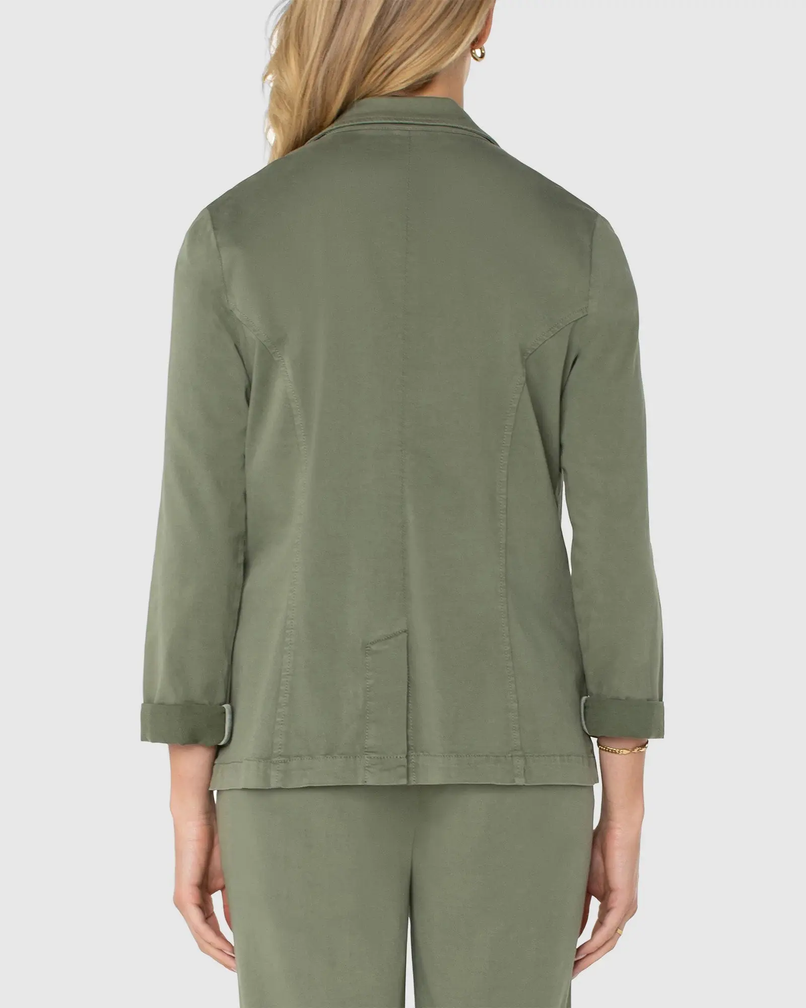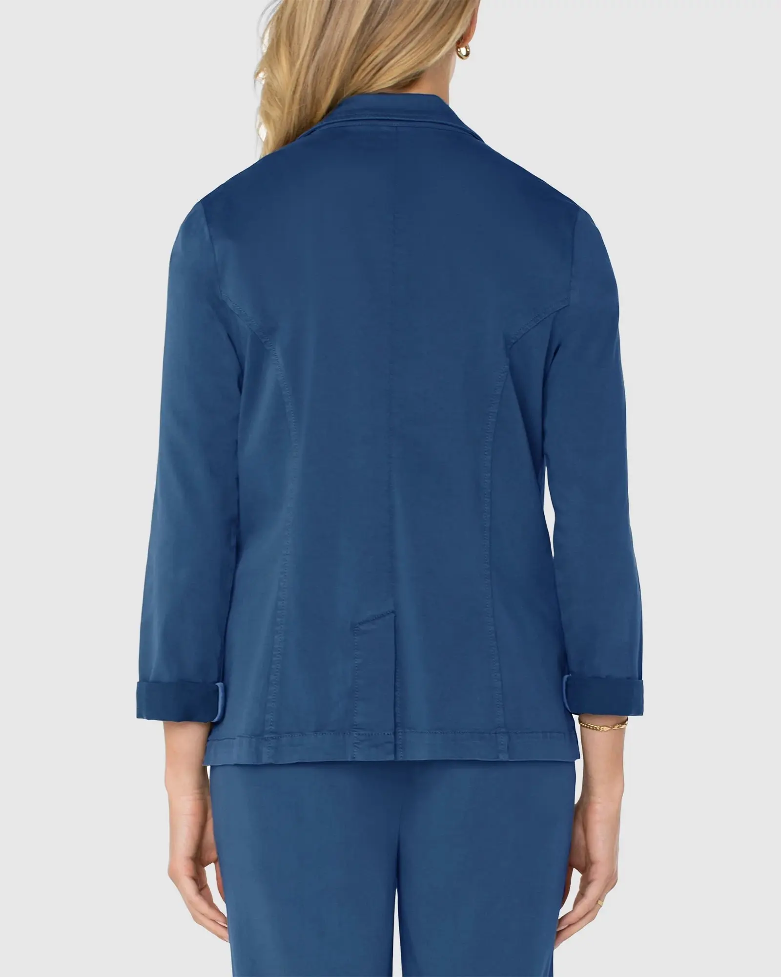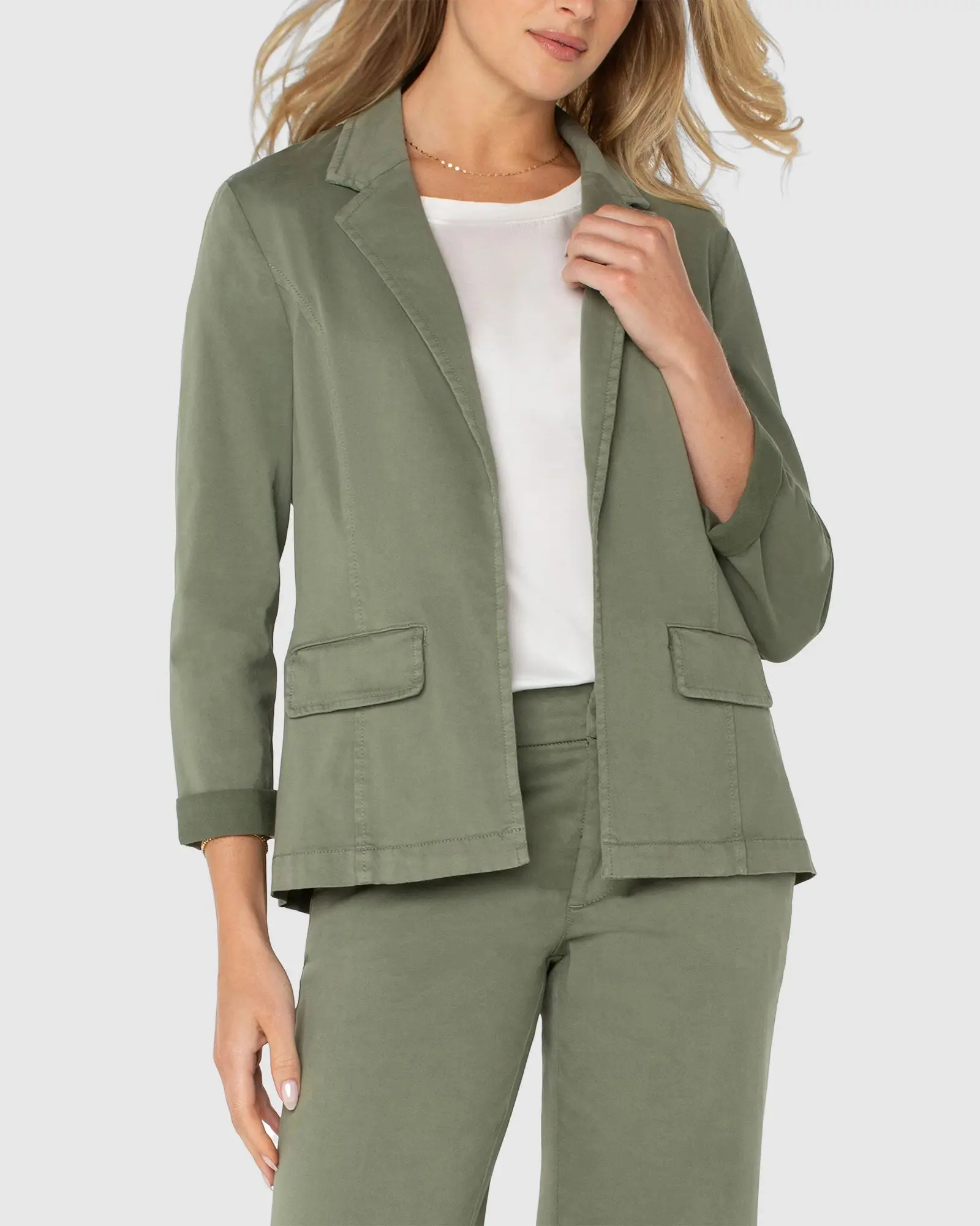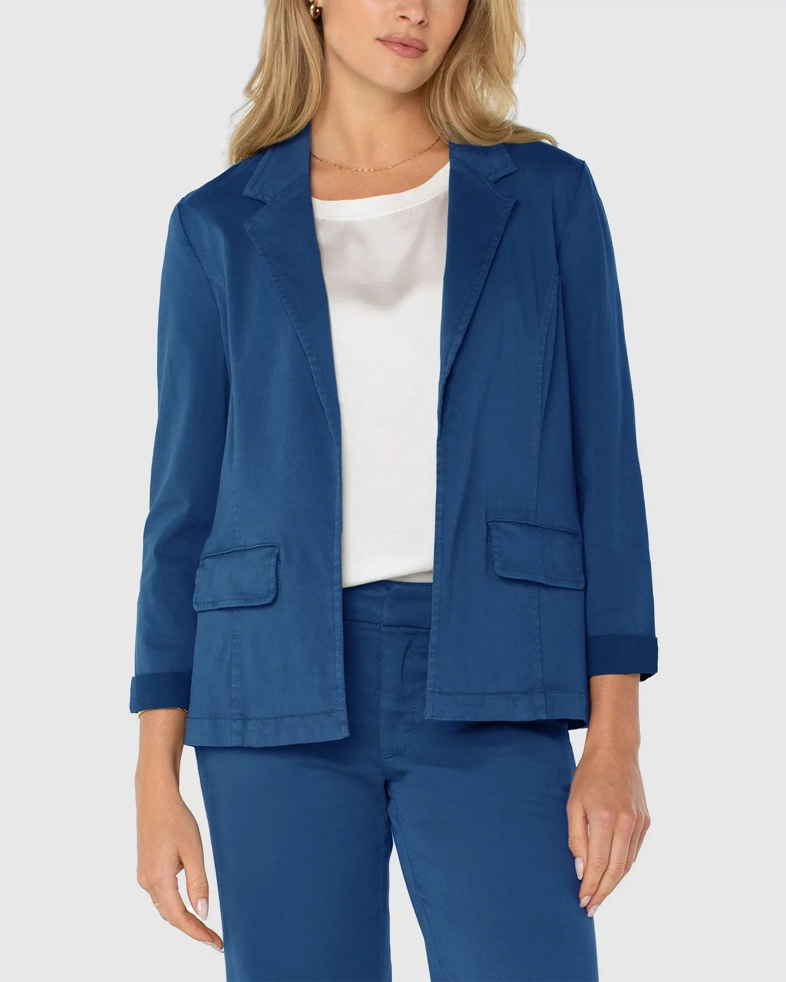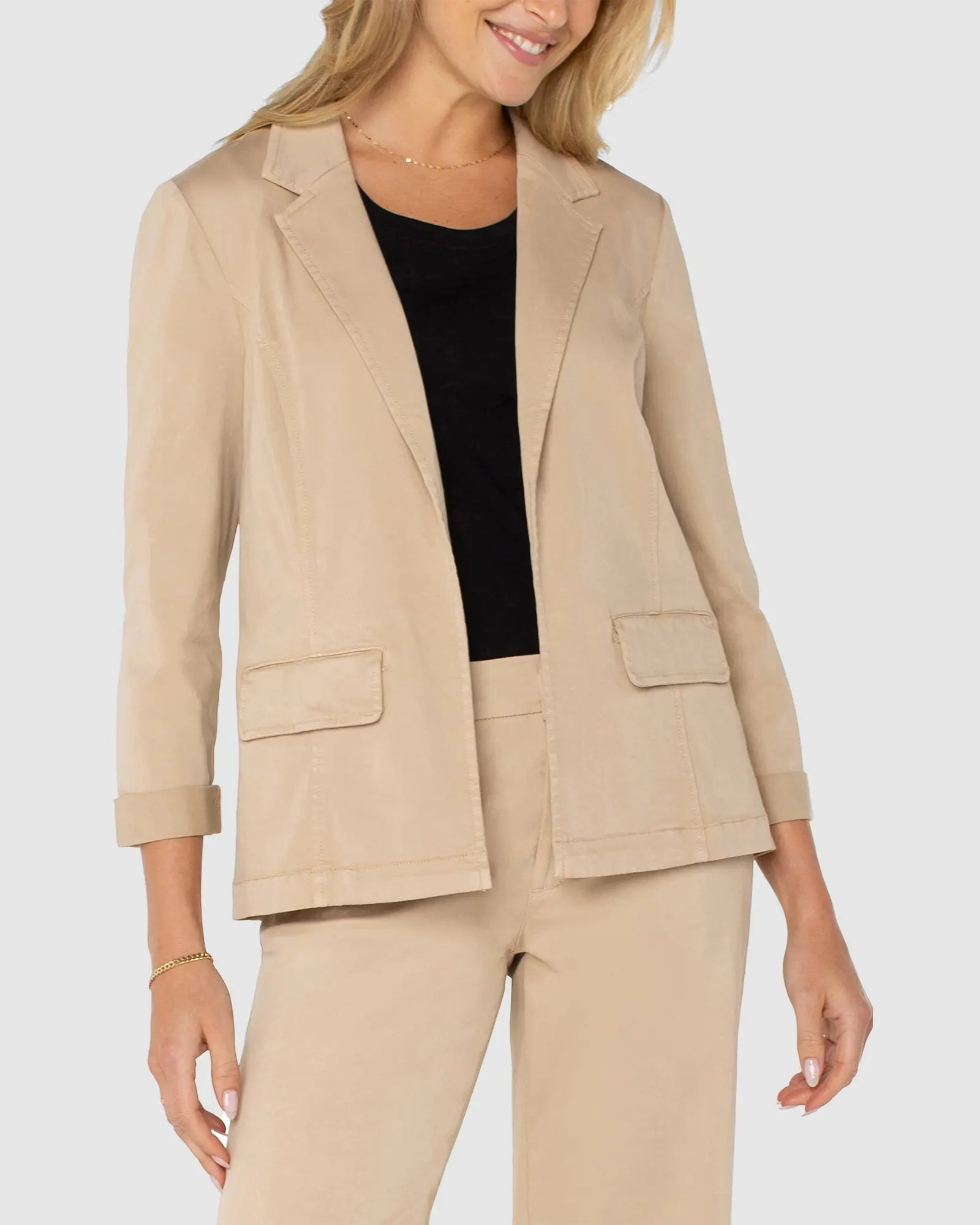 This blazer can play it casual or elevated! Relaxed fit with a breezy open front, hourglass shape enhancing tailoring, and sewn-in pockets. Made of a breathable cotton rayon stretch to keep you breathing and comfy.