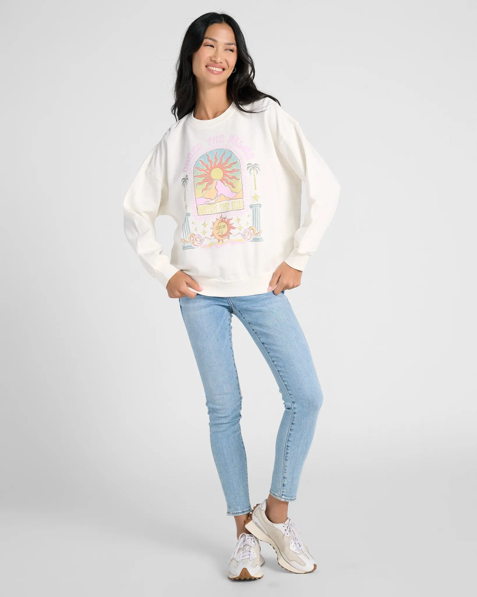 Grab a cocktail (or mocktail) and chill in this graphic sweatshirt! Oversized fit with cozy drop shoulders and "UNDER THE PALMS" printed above a poster-style art piece. Made from lightweight 100% cotton for a cool yet cozy feel.