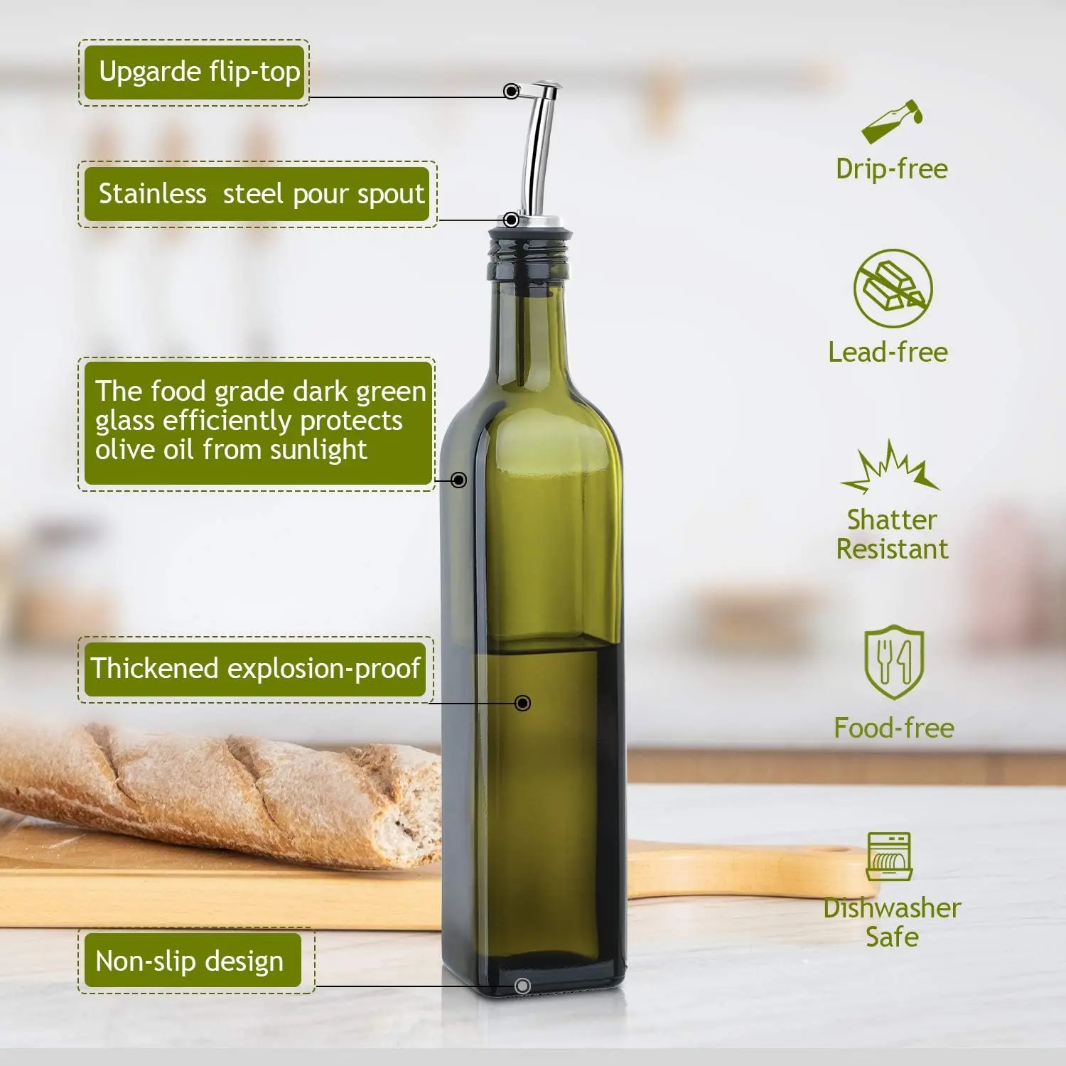 ·KEEP YOUR OLIVE OIL FRESH - The green glass efficiently protects olive oil from sunlight and largely prolongs the preservation time. Black screw cap & white inner cork makes long-term / air-tight storage possible.