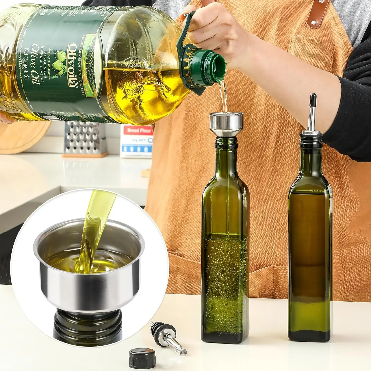 ·NON-DRIP DESIGN - 18/8 Stainless steel pour spouts with sealed cap and flap cap fit the bottle well and perfectly keep dust out. Everyone can pour and dispense oil with a nice stream without leakage. Ideal for dispensing cooking oils, dressings and vinegars.