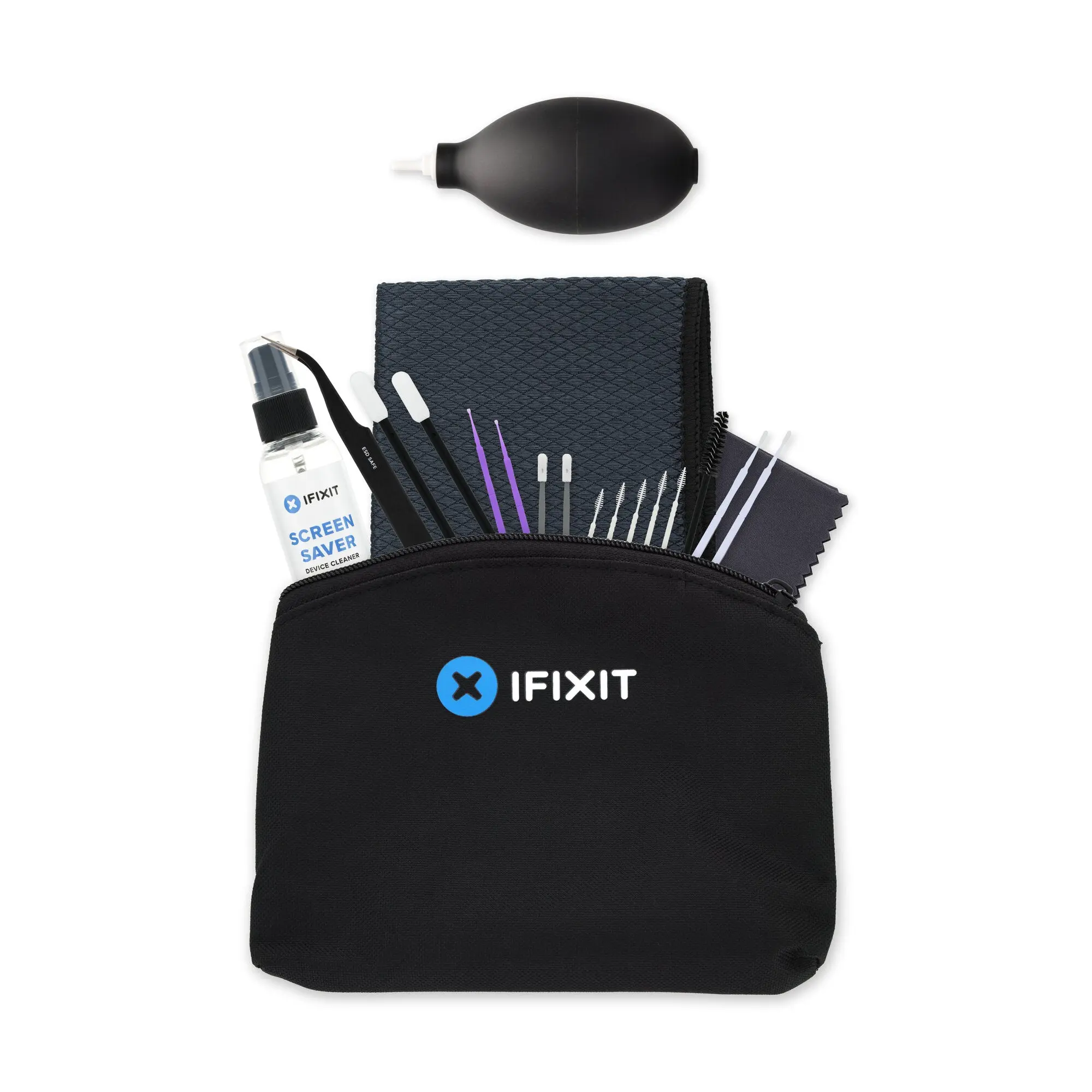 iFixit's Phone Cleaning Kit is your all-in-one solution for maintaining that new Apple (or Android) look. It includes iFixit Screen Saver and Microfiber Cleaning Cloths to keep your screen spotless and streak-free. The Dust Blower helps dislodge dirt from tight spaces, while Angled Tweezers provide precision for picking out stubborn debris. With a supply of picks, brushes, and swabs, no charging port will remain filled with gunk. All these essential tools fit neatly into the iFixit Tool Pouch, ensuring your kit stays organized and ready for use wherever you go.