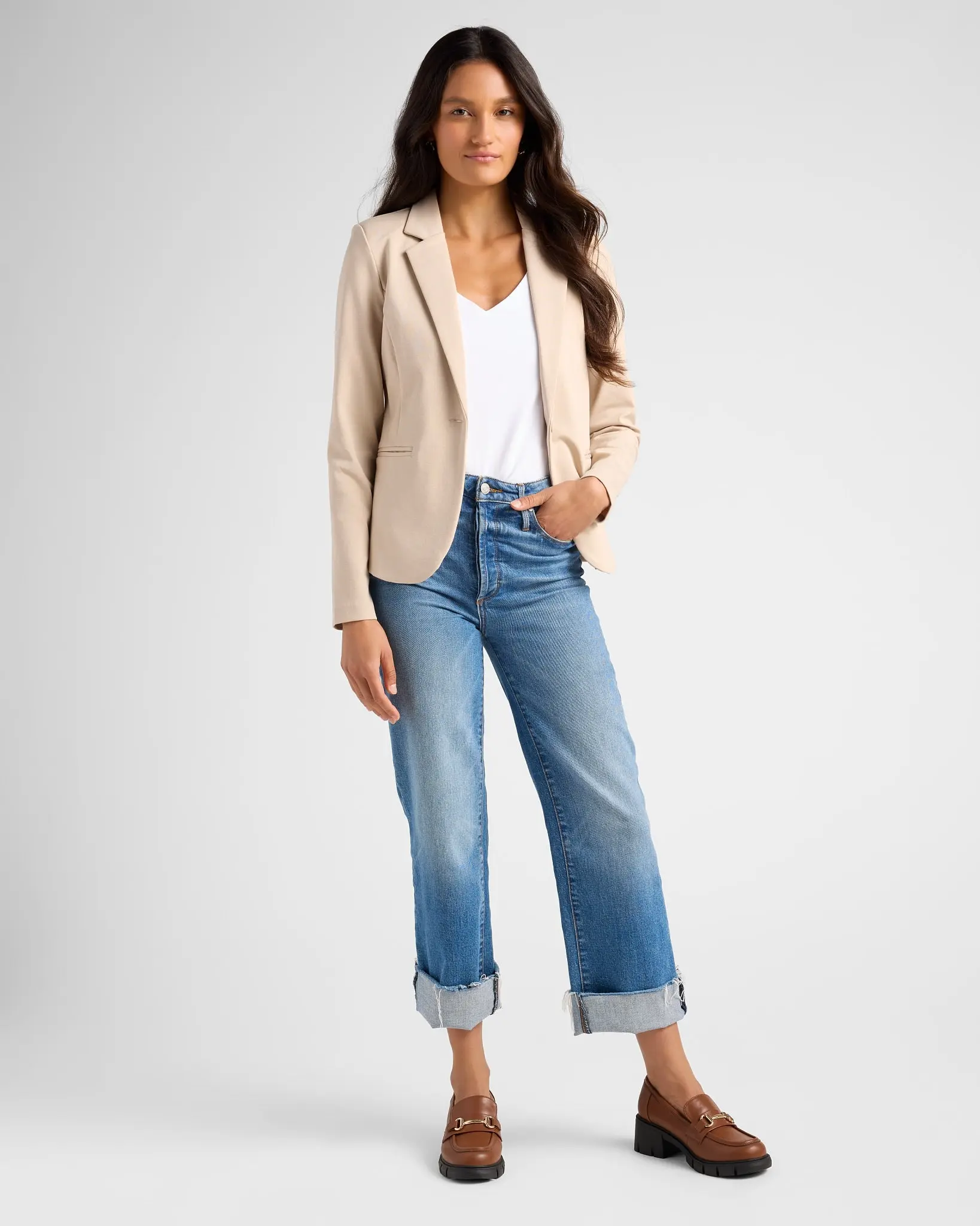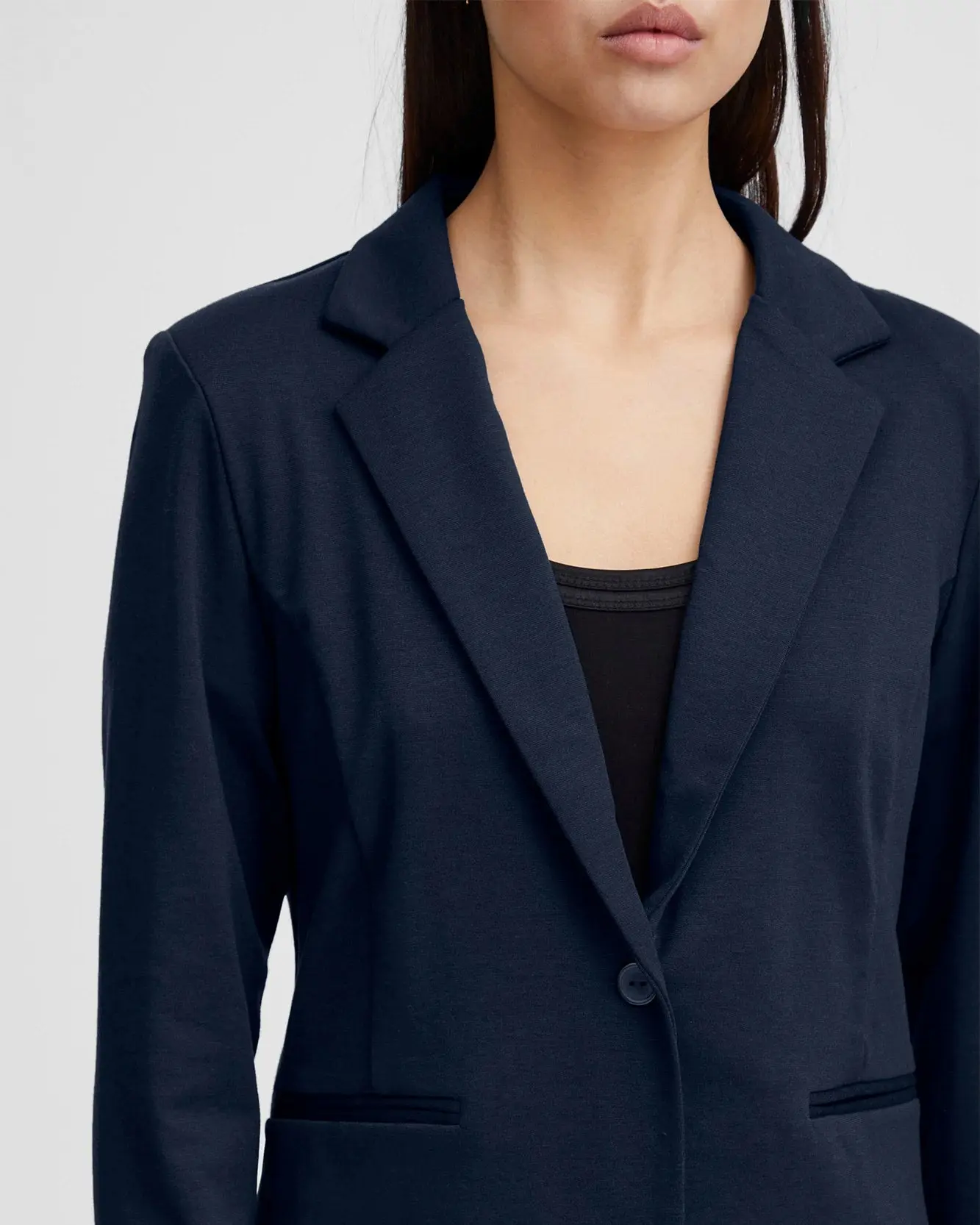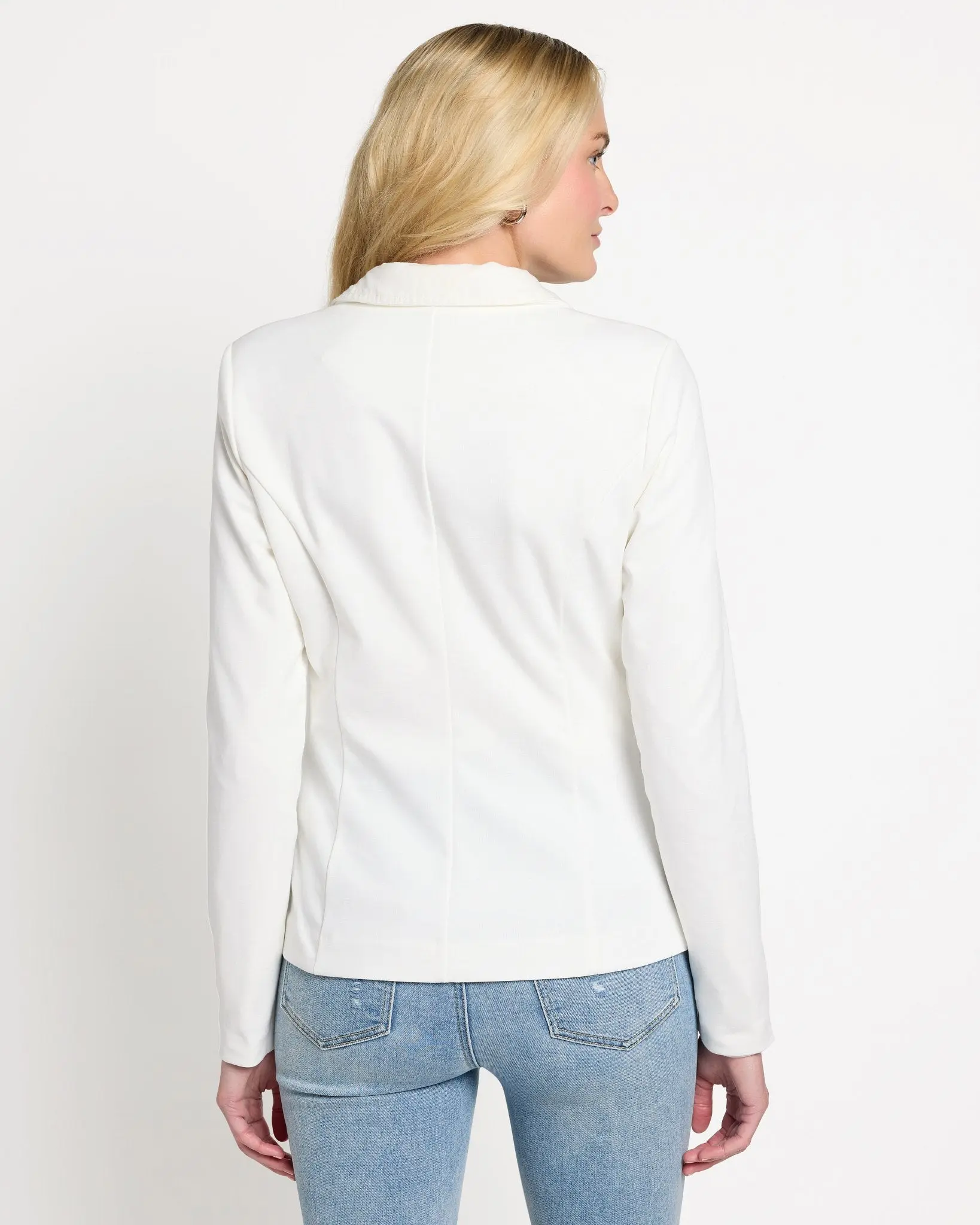 A fitted blazer with a stretchy secret! Classic fit with a single button and two faux welt pockets. Made of a so-soft and stretchy knit for chic comfort you can wear all day long.