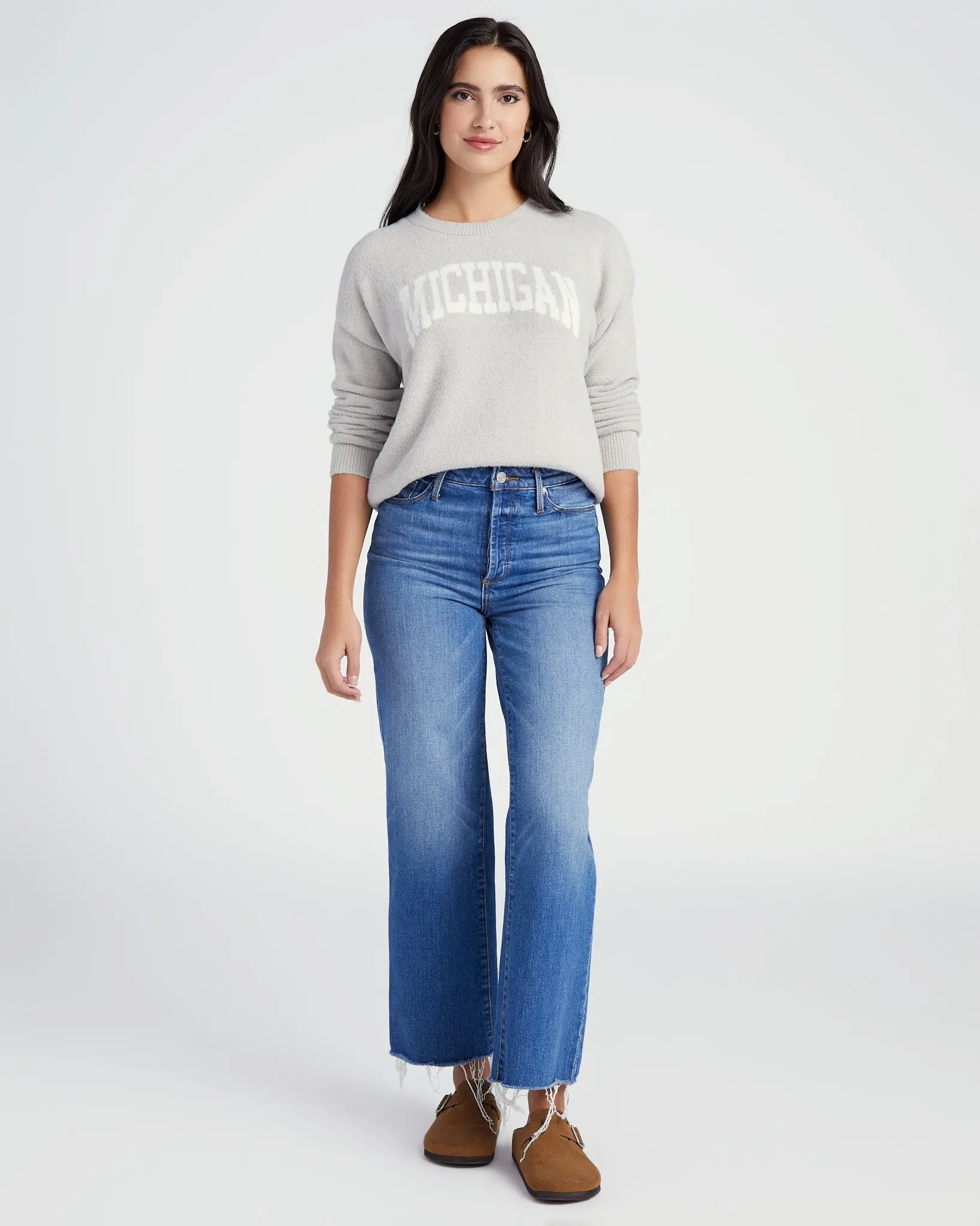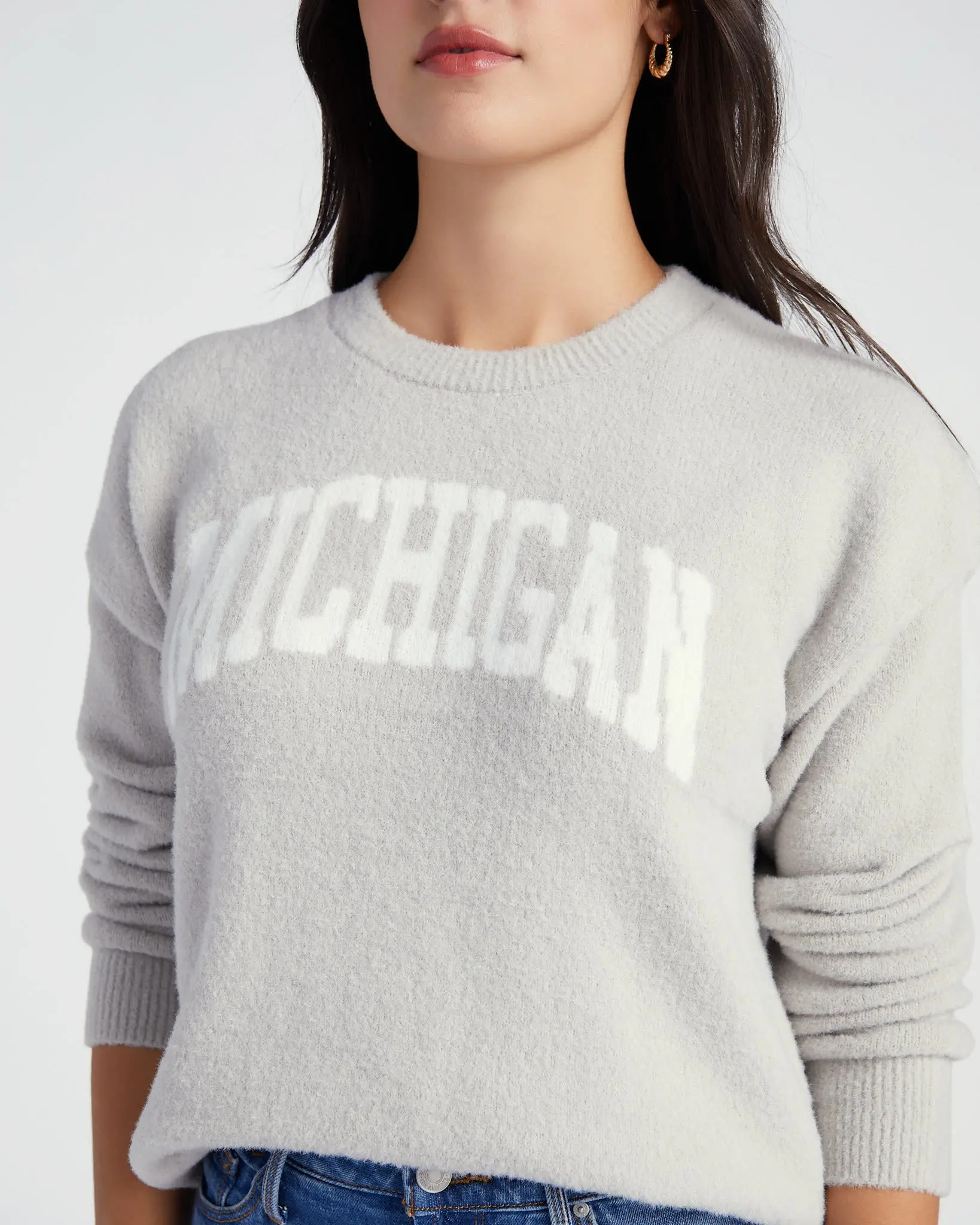 This so-soft Michigan Sweater will make you feel right at home! Relaxed fit and made of a stretchy plush knit that gives you tons of cozy warmth. Just add joggers.