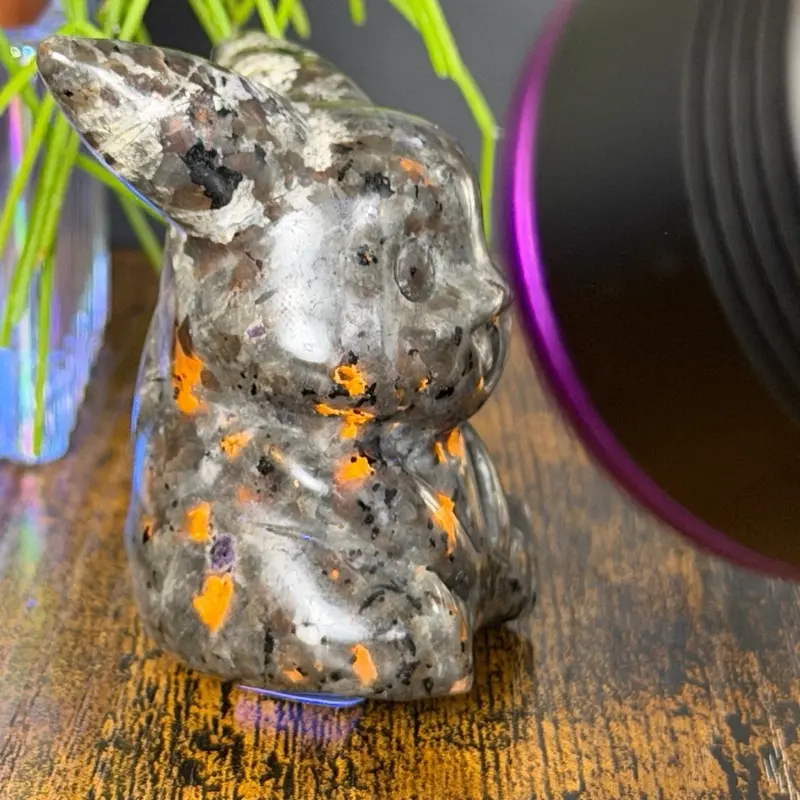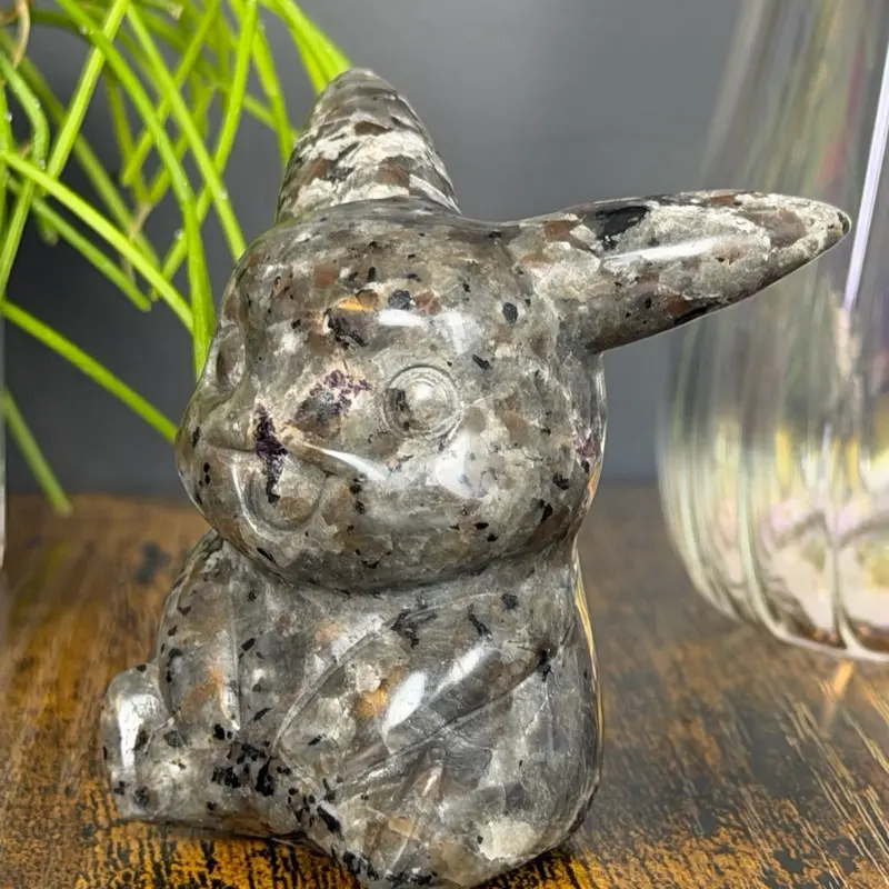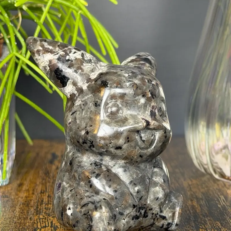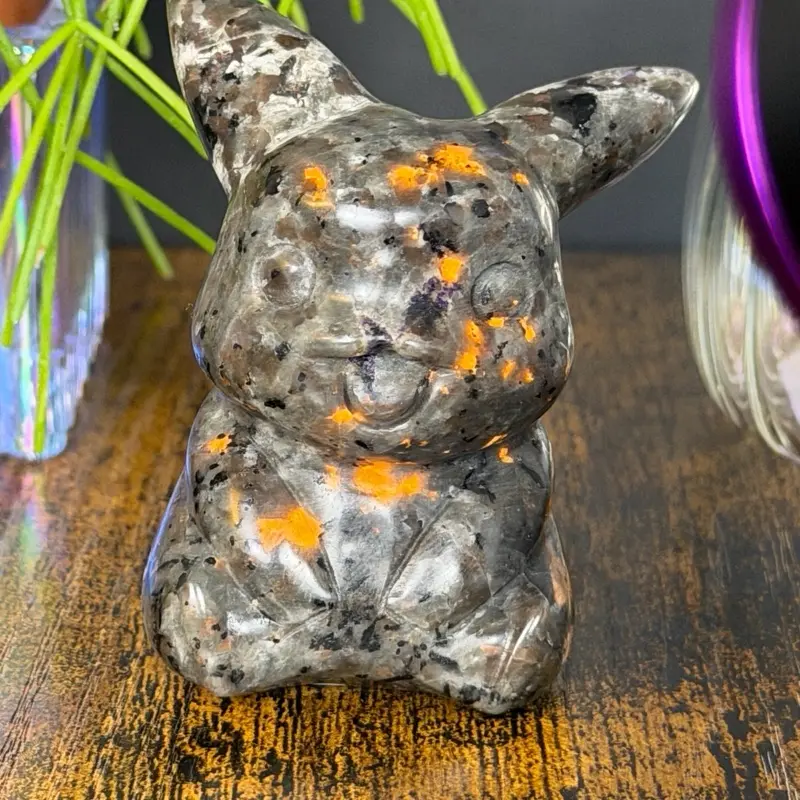 This Pikachu-inspired carving is made from yooperlite, which is sodalite embedded in syenite, a natural stone known for its hidden UV-reactive properties. In regular lighting, it displays a mix of gray, black, and earthy tones with natural speckling and patterning.