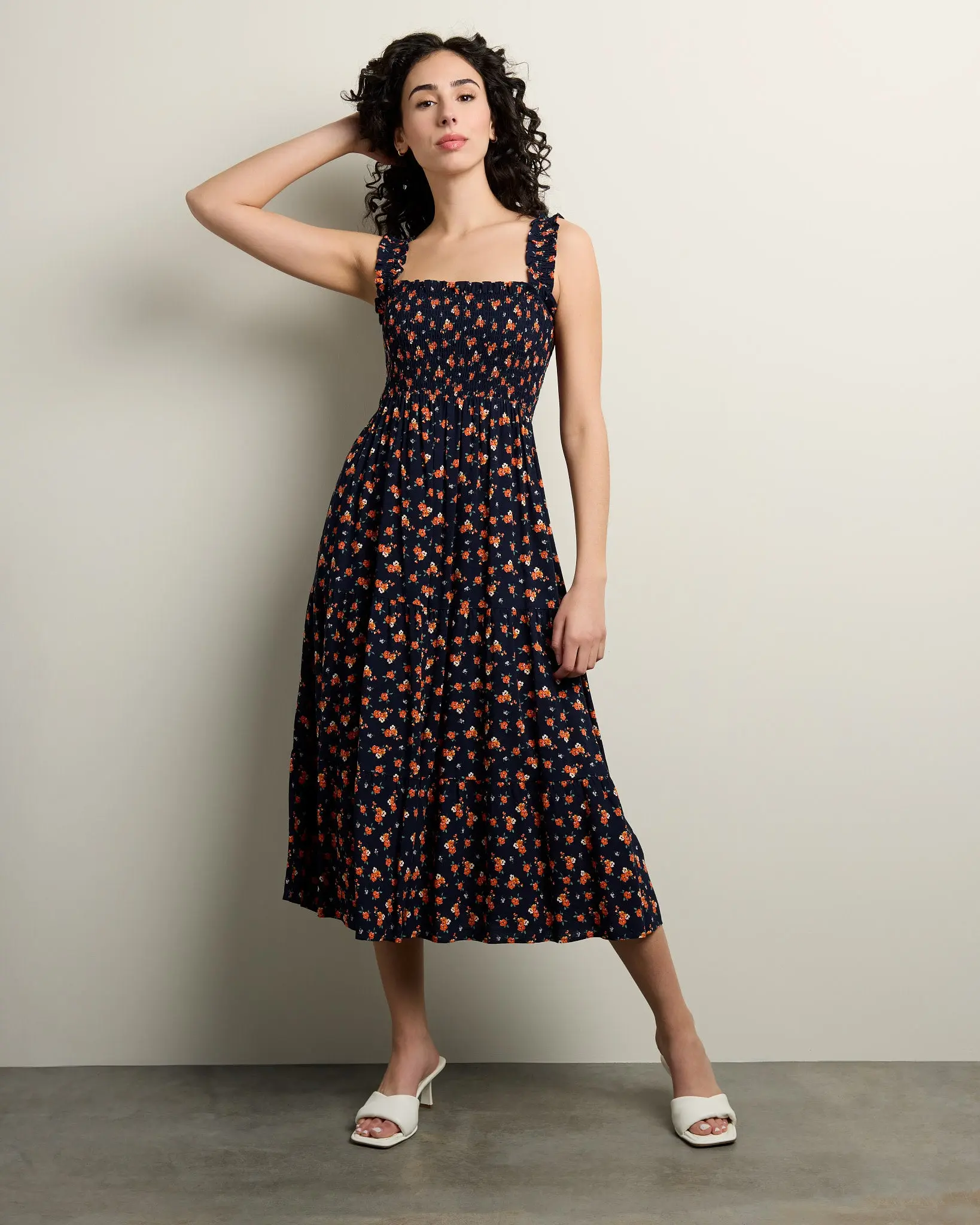 The best party awaits with this floral dress! Midi length with a fitted smocked bodice, stretchy ruffle straps and a breezy tiered skirt.