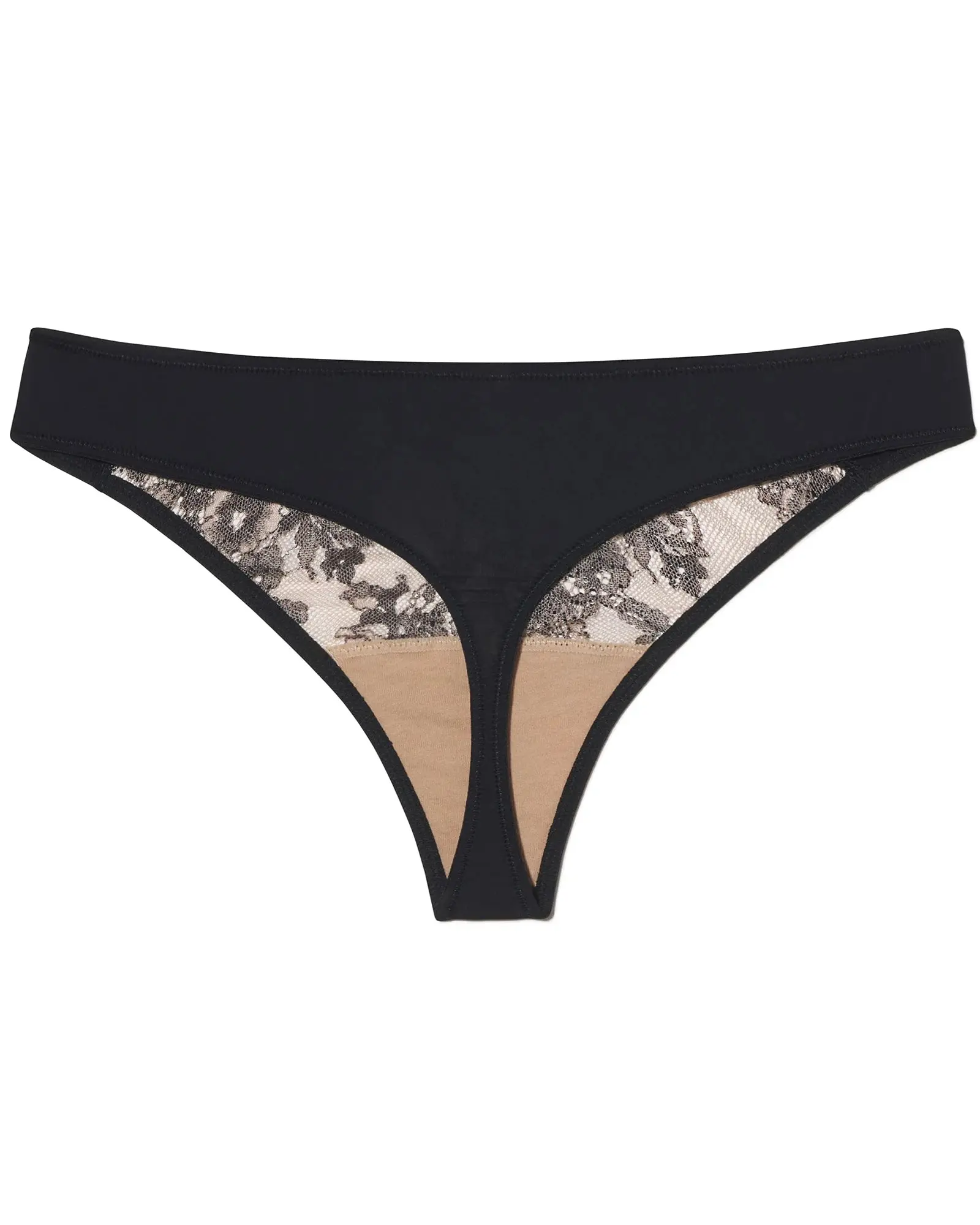 A lace thong with max comfort! Stunning front sheer stretch lace panel with silky-soft sides and minimal coverage back. Breathable 100% cotton gusset.