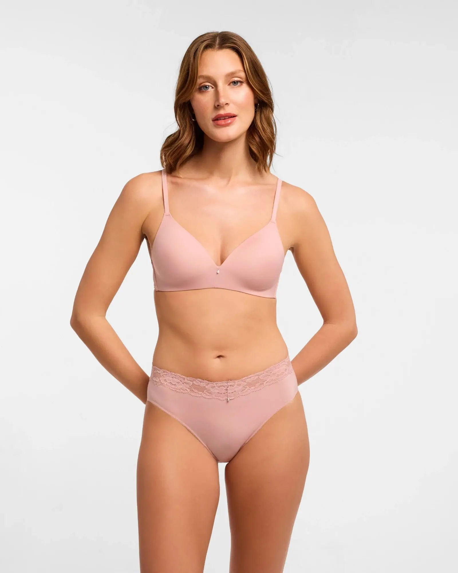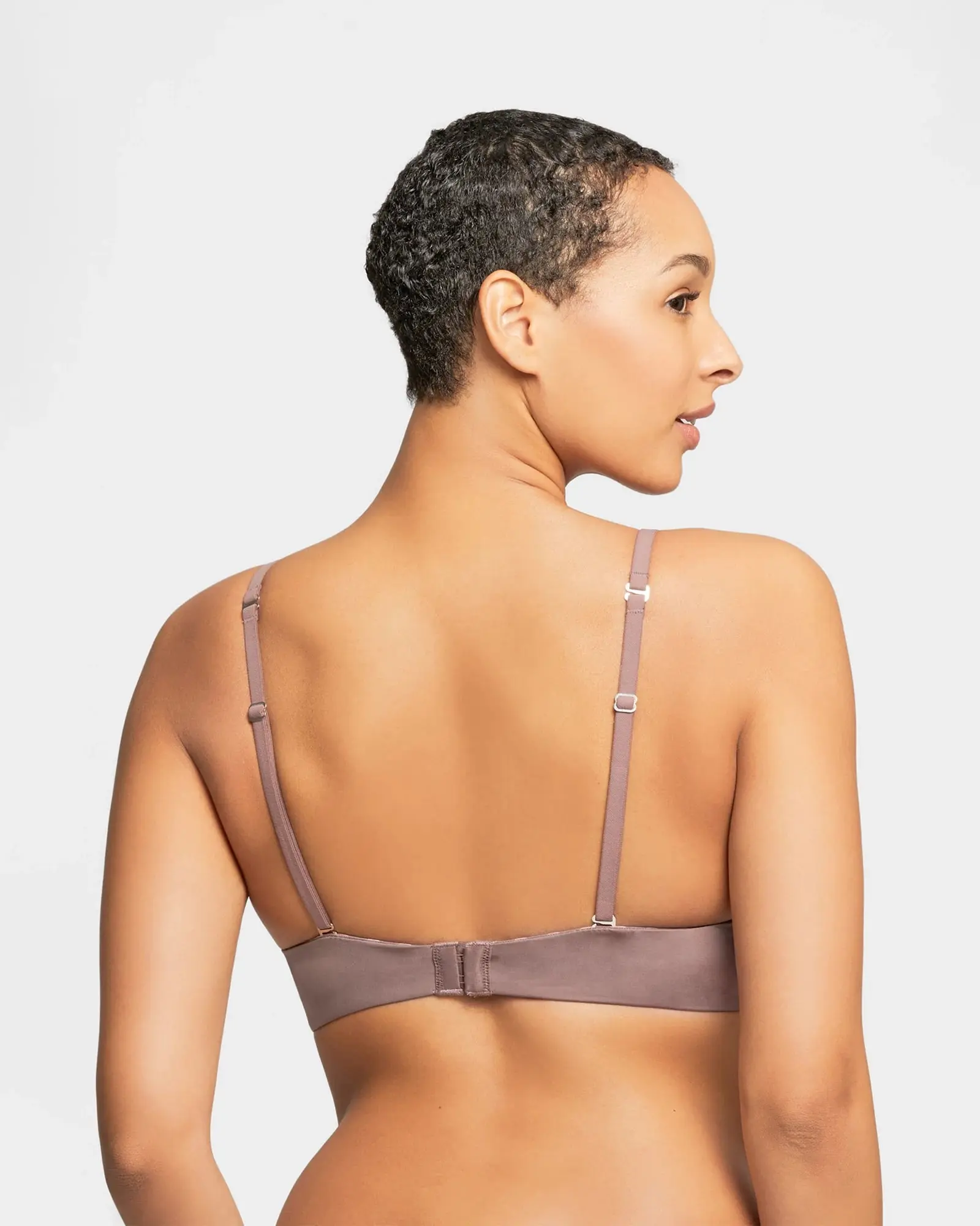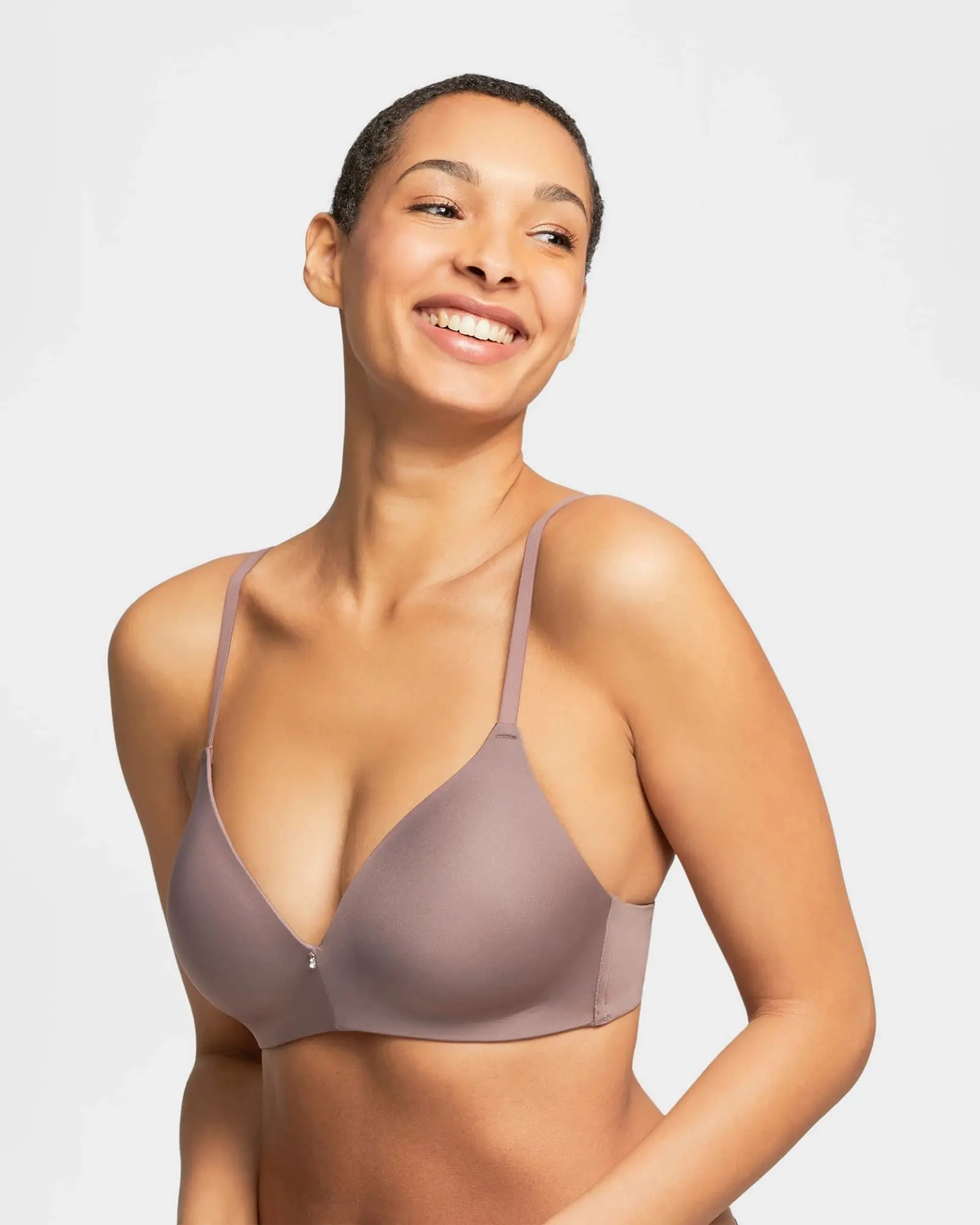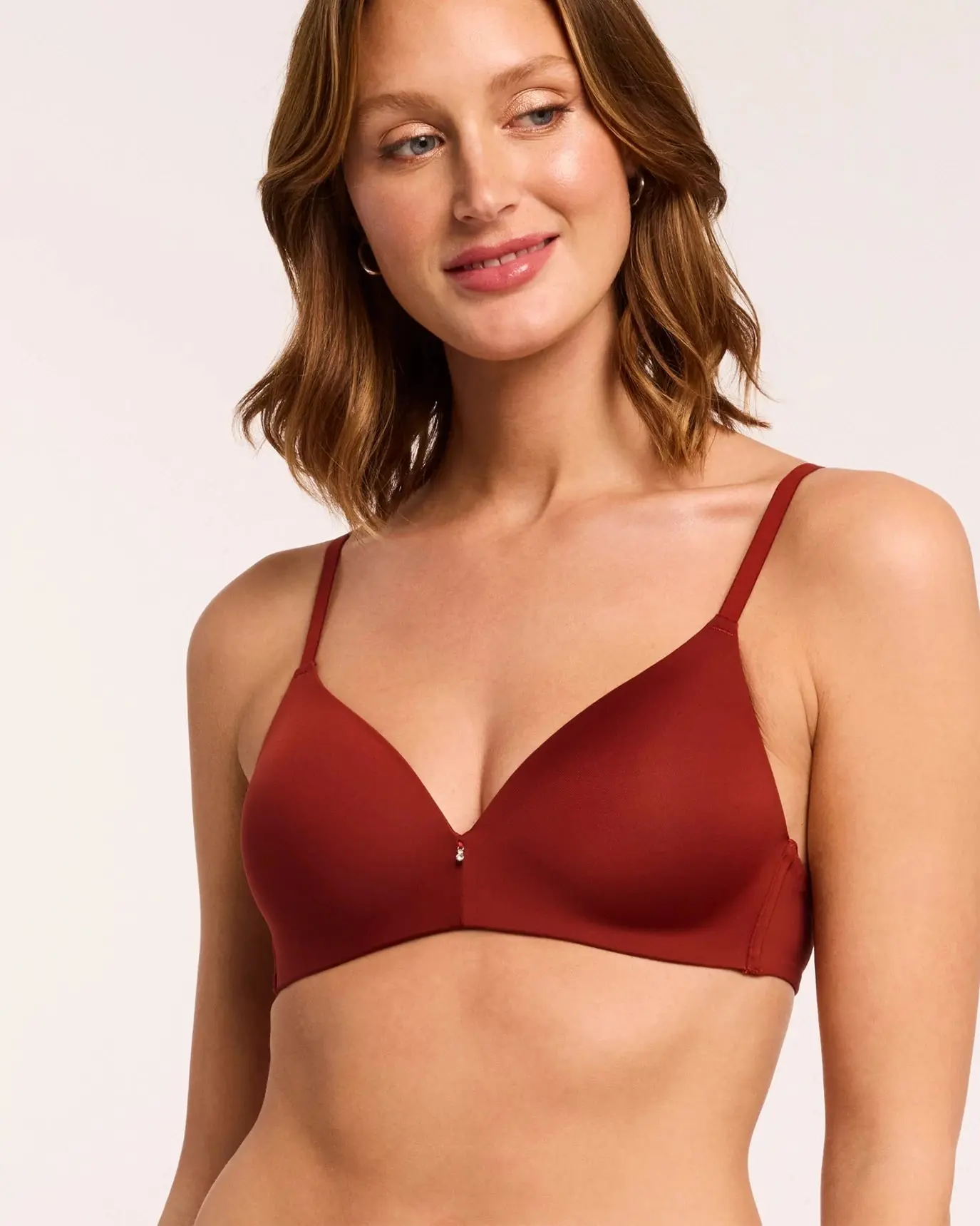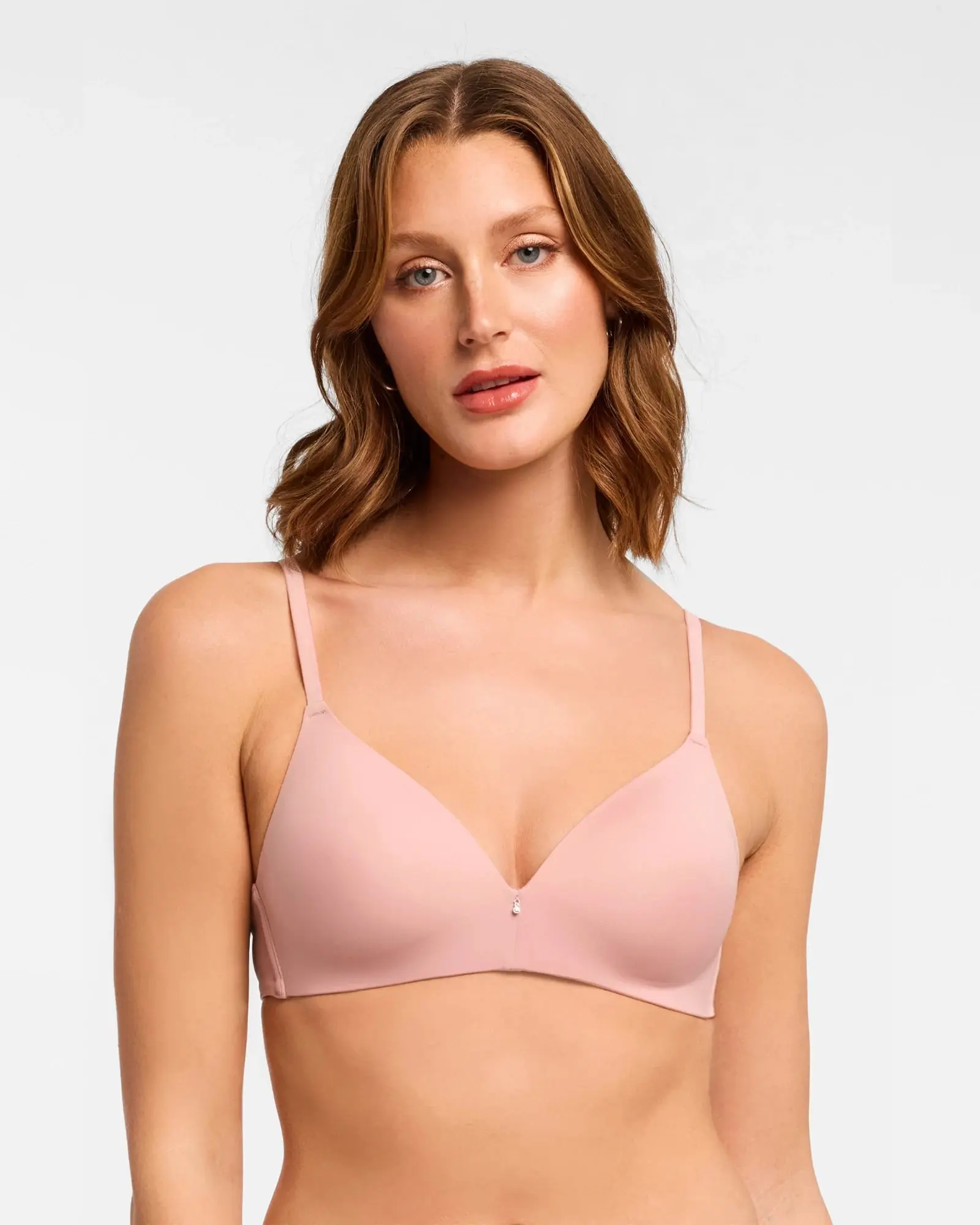 This comfy T-shirt bra is one you will wear on repeat! Free from wires with double-layer side wings and convertible straps. Finished with a sparkling gem in the front. Made with the softest foam cups and adjustable straps.