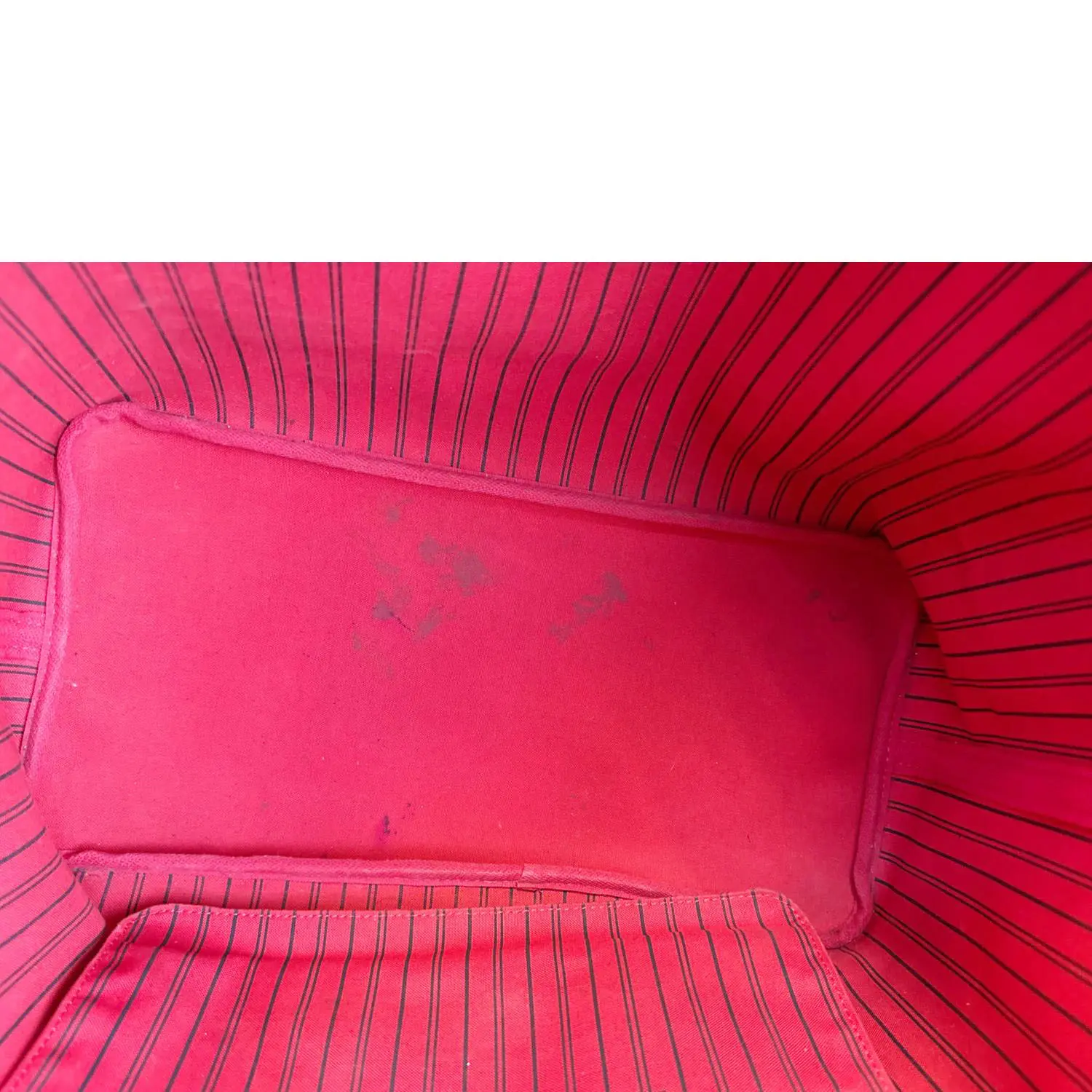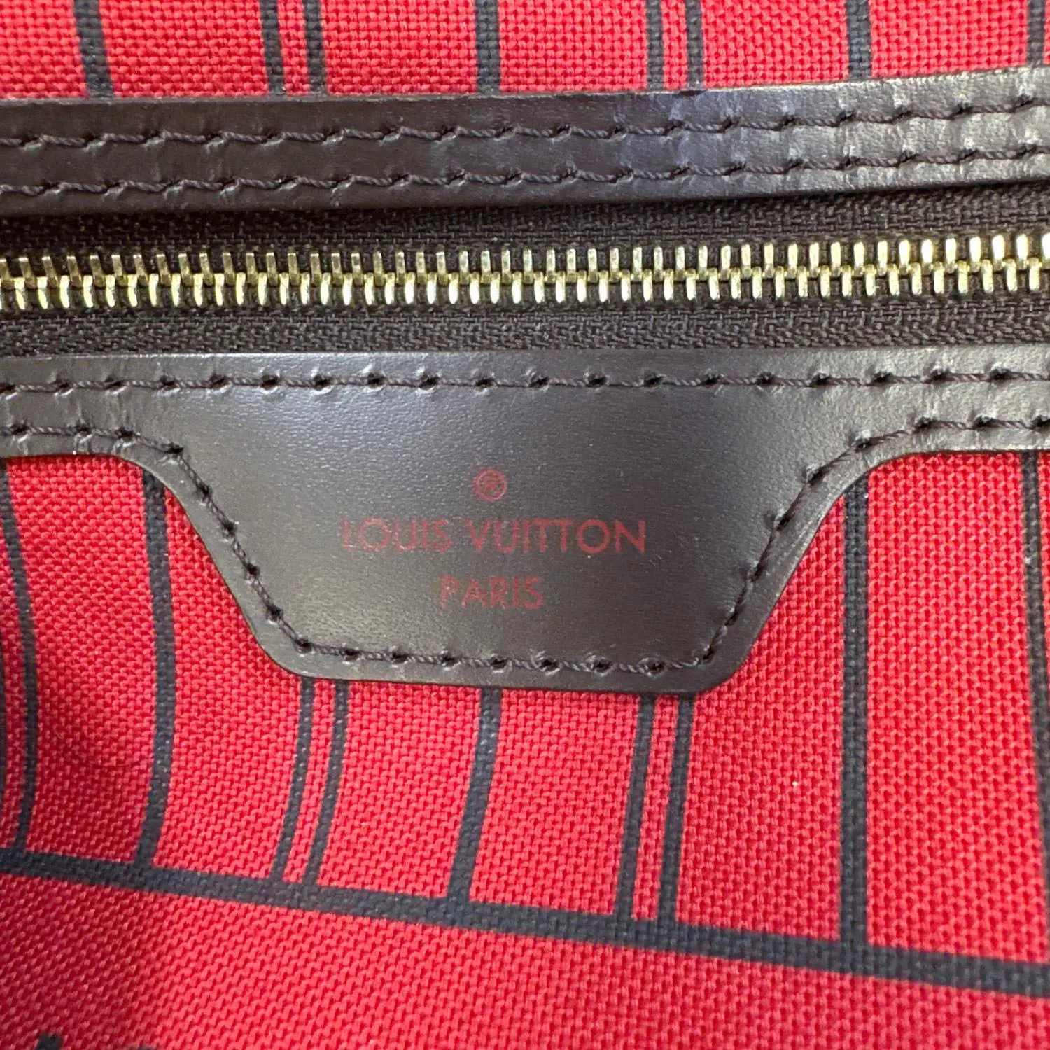 Louis Vuitton Neverfull GM tote in Damier Ebene canvas offers an extra-spacious design with a timeless checkered pattern. Perfect for travel or daily essentials, it features side laces for adjustable shape and comfortable shoulder handles.