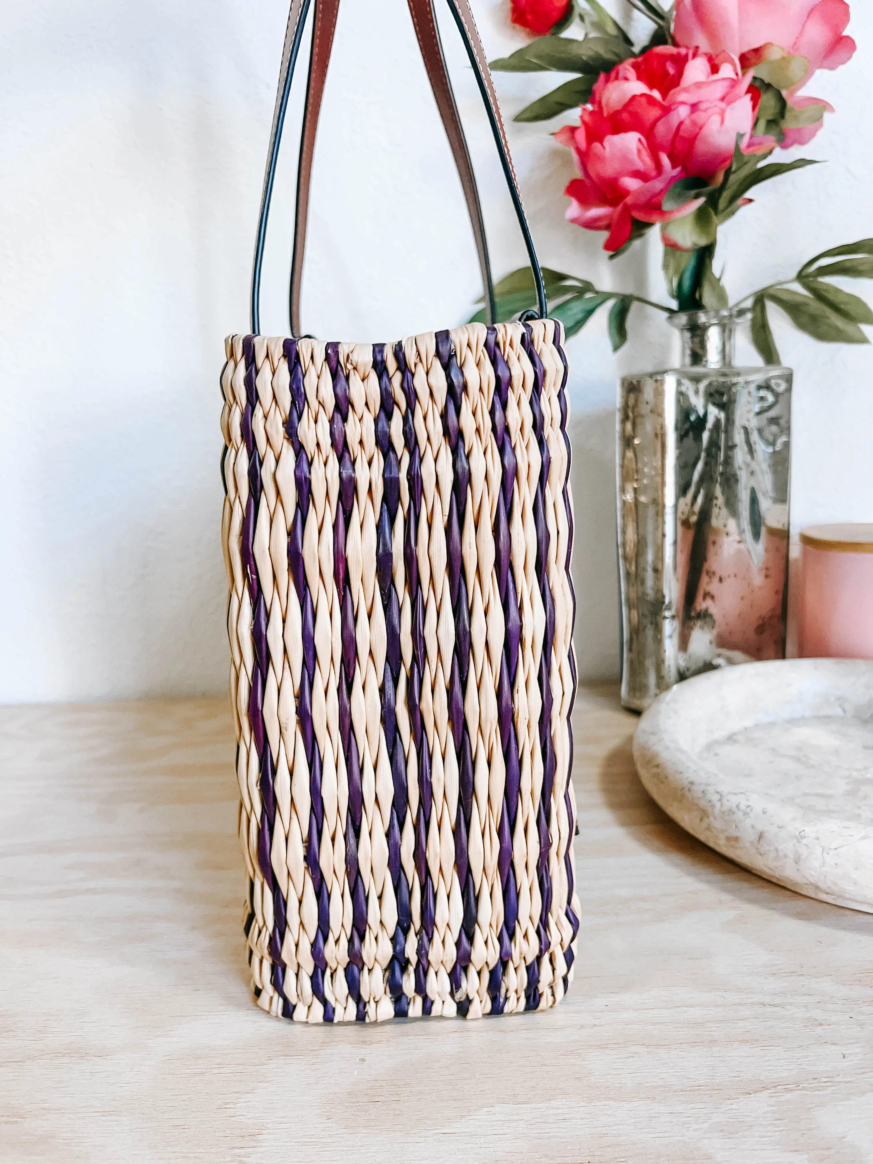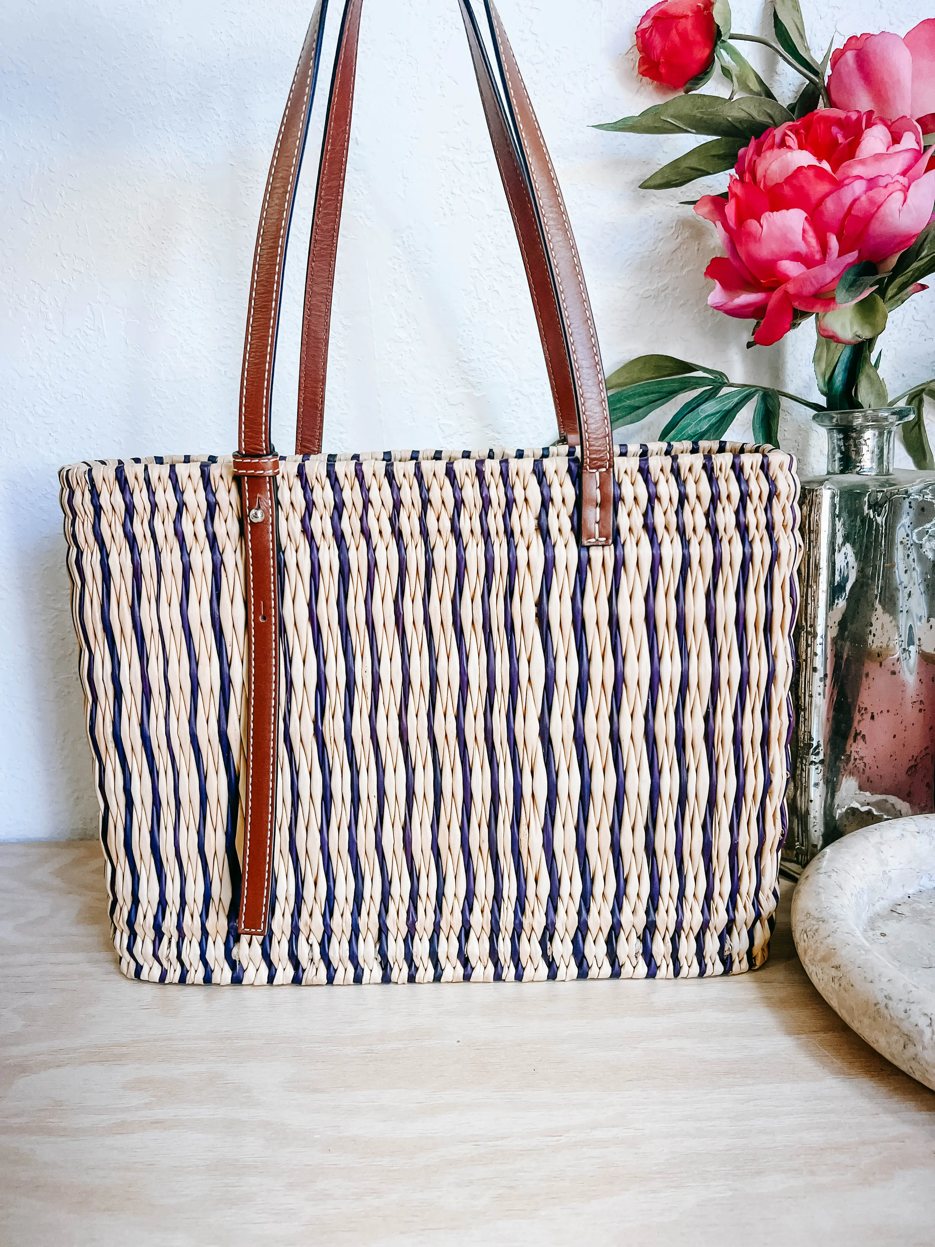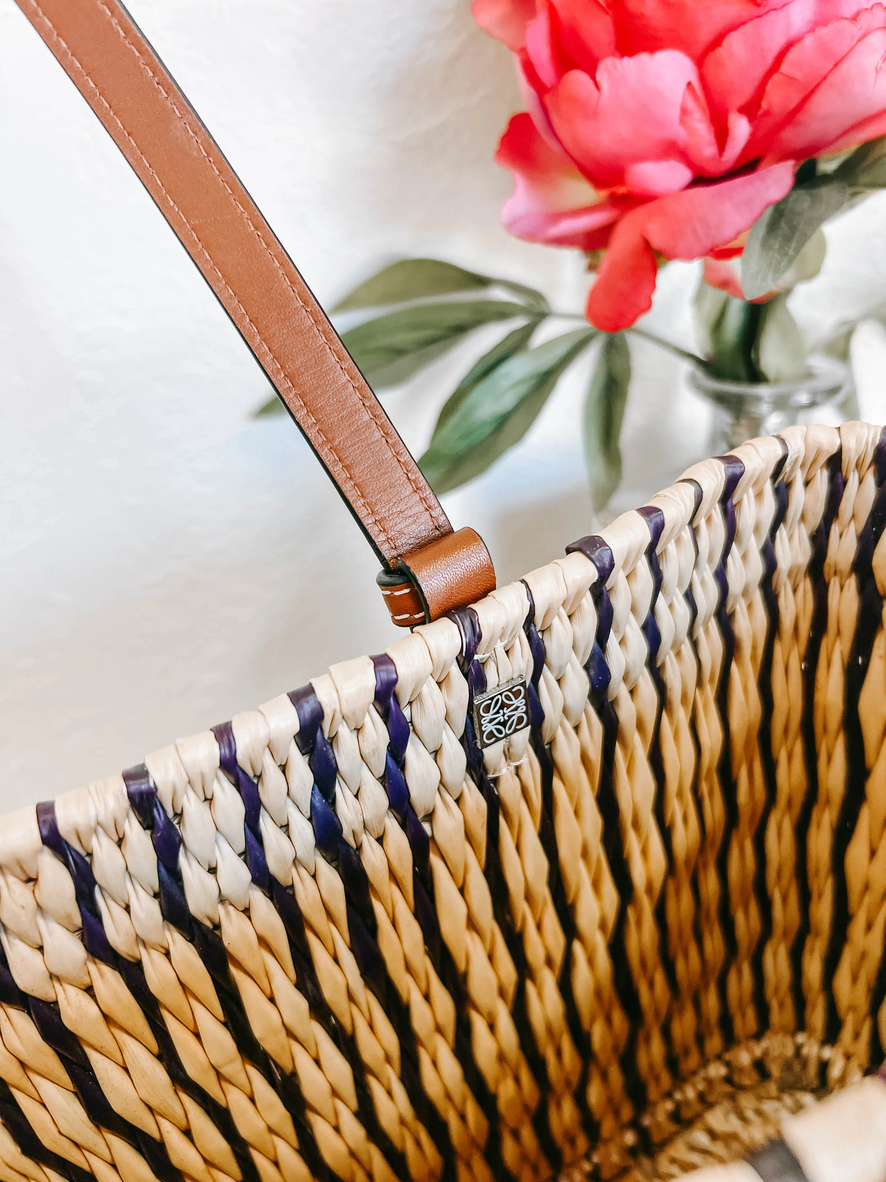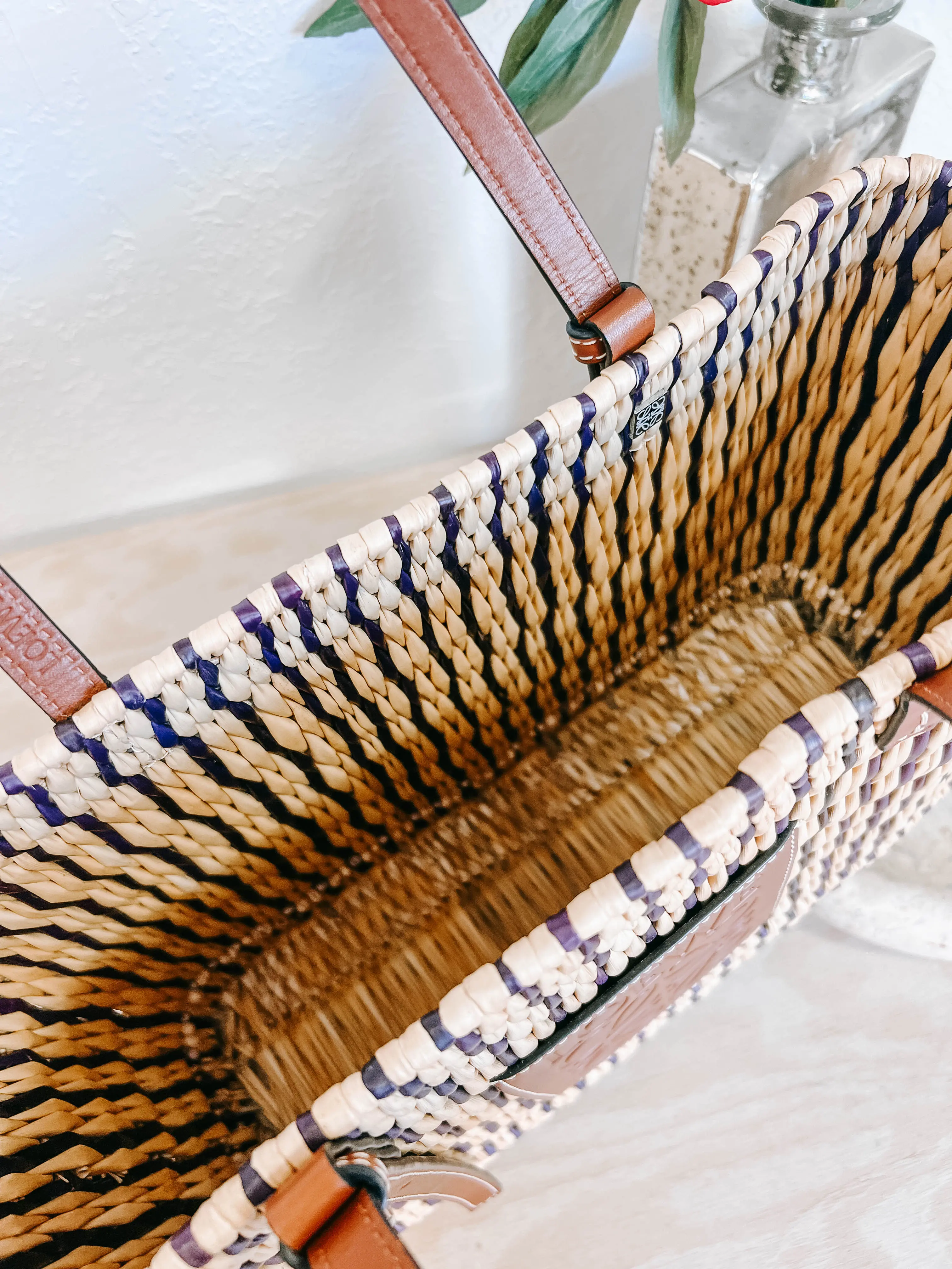 Excellent preowned condition Loewe Square Anagram Basket Tote Bag in natural raffia with deep purple raffia woven accents and brown leather logo and top handles. No major callouts or signs of use. Natural material will have normal variations and should be considered not signs of use. Comes with the dustbag and COA.