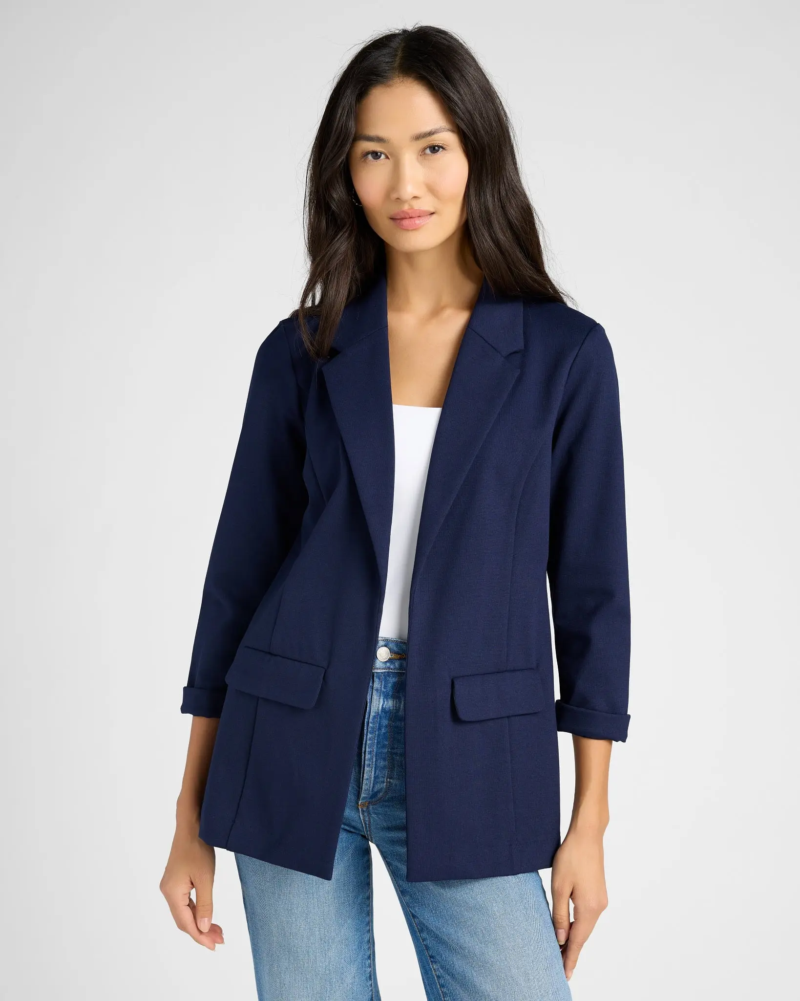 This boyfriend blazer instantly elevates whatever you wear it with! Relaxed fit with an open-collared front, two flap pockets and flattering tailoring to enhance an hourglass shape.